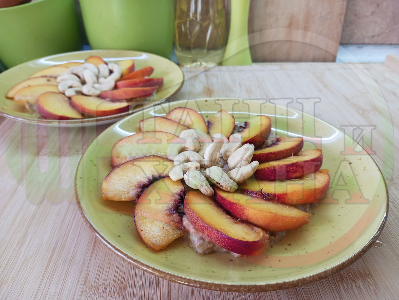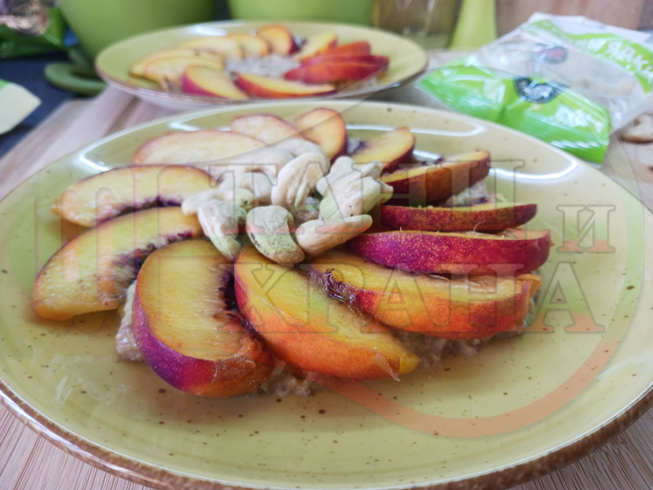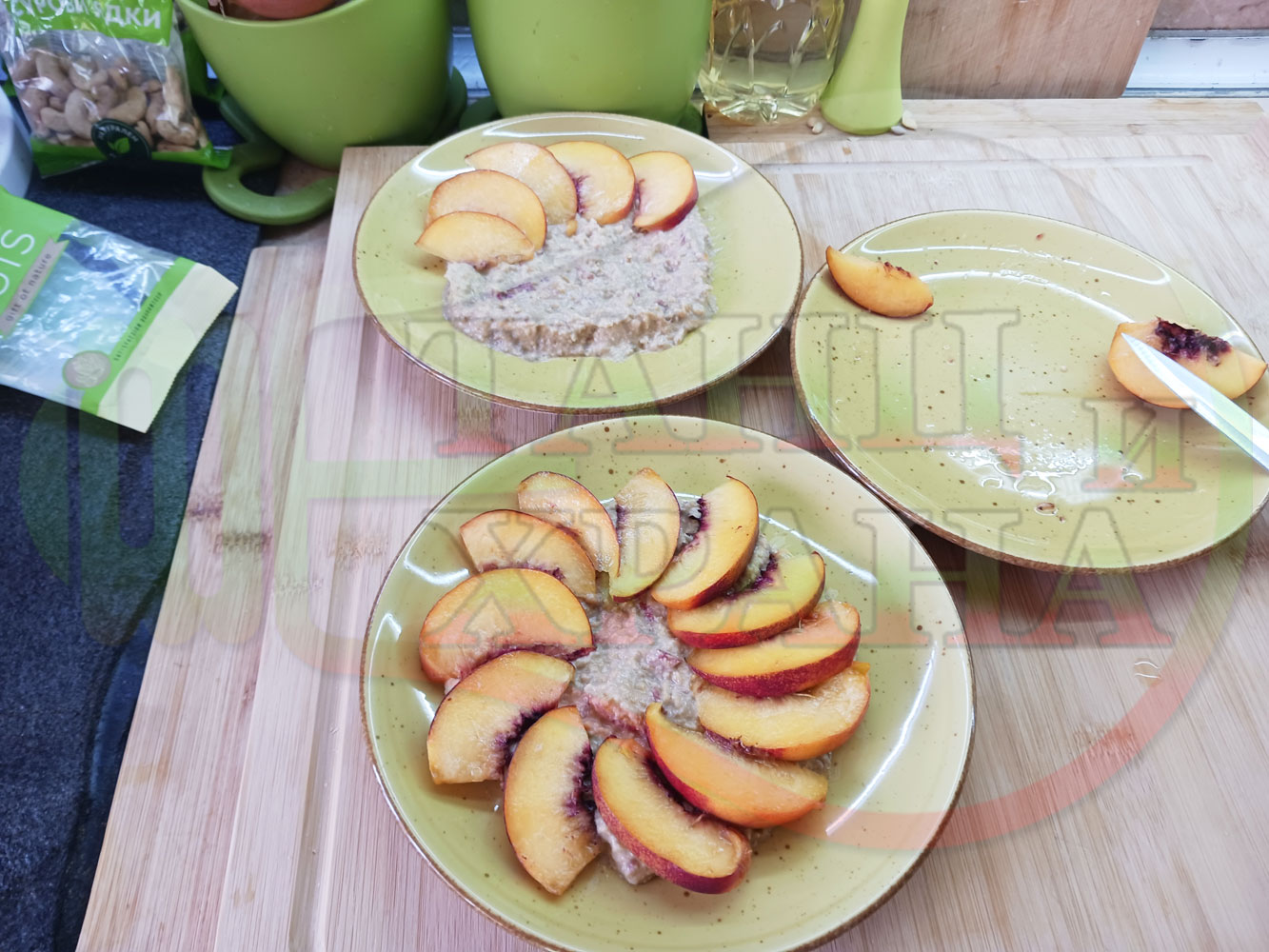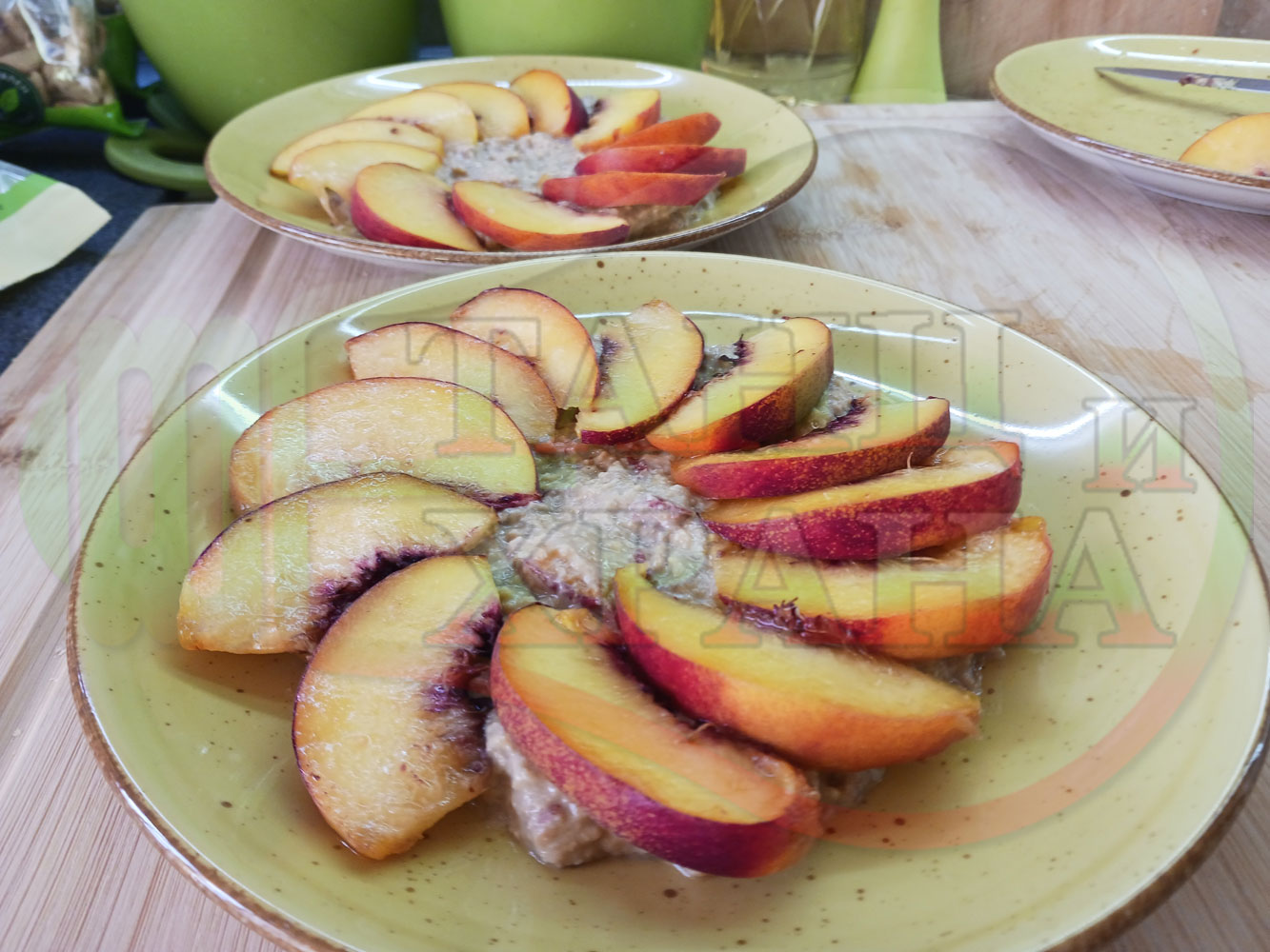 Плодова сурова салата "Прасковена кашуядкова" приготвена от плодово ядков крем с пресни праскови и настъргано печено и осолено кашу оформен като кладенчета гарнирани с резени от праскова и сурови ядки
