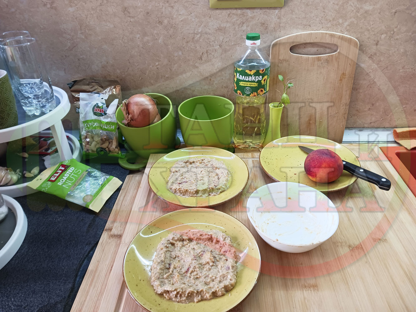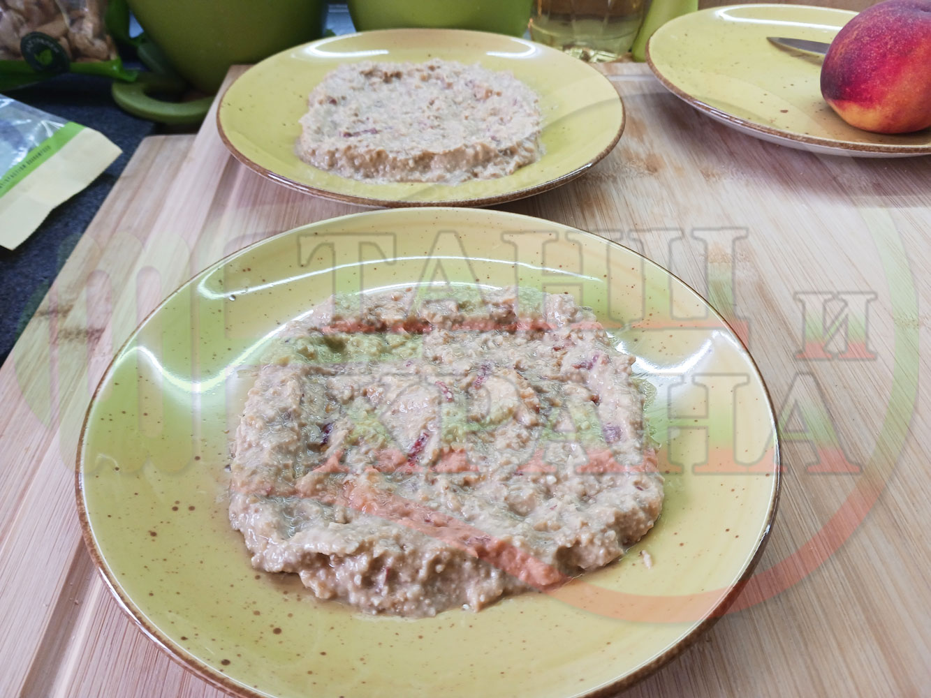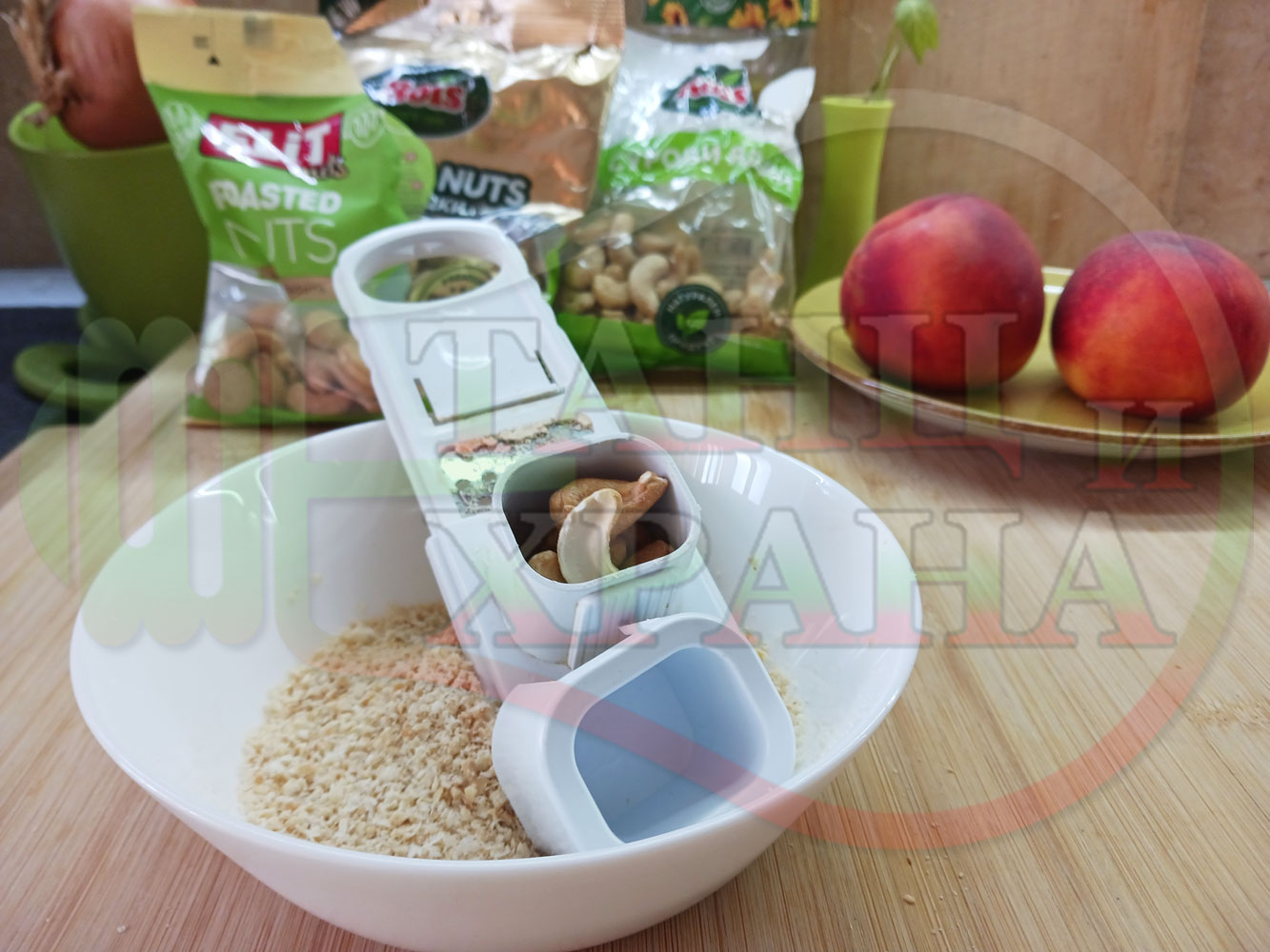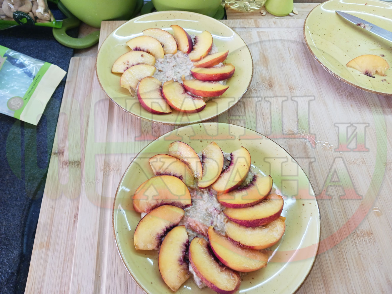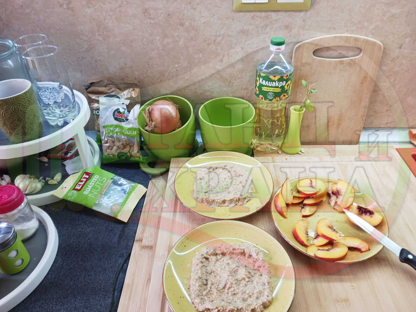 Плодова сурова салата "Прасковена кашуядкова" приготвена от плодово ядков крем с пресни праскови и настъргано печено и осолено кашу оформен като кладенчета гарнирани с резени от праскова и сурови ядки