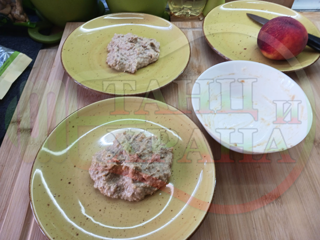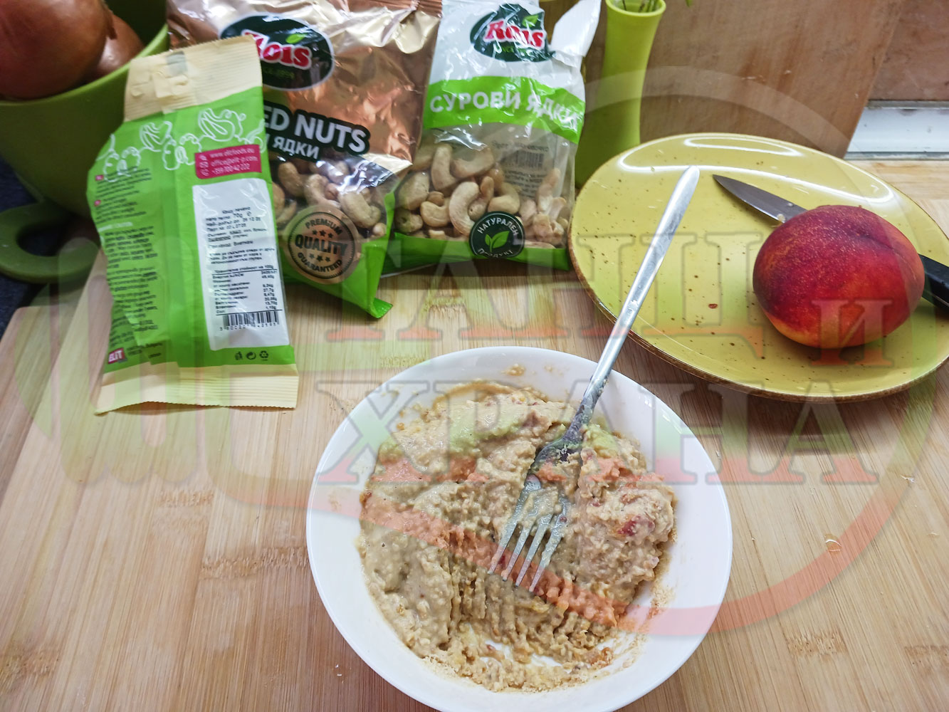 В случай, че плодовия крем се получи прекалено гъст и солен, добавете нарязана на малки парченца праскова за да го разредите или сгъстете прекалено редкия крем с настъргано печено и осолено кашу (винаги имайте под ръка някакво малко парченце (количество) от дадения продукт за доовкусяване и прецезиране на гъстотата). Разбърквайте и намачквайте с вилица след добавянето на съответния продукт (за сгъстяване или разреждане) за да прецените гъстотата и вкуса на крема (зависи от големината и водното съдържание на прасковата/ите и солеността, вида и големината на печеното кашу). Съобразявайте и според вида на продукта за гарниране и неговото водно съдържание и особености (в случая са нарязаната на резени праскова и суровото кашу).