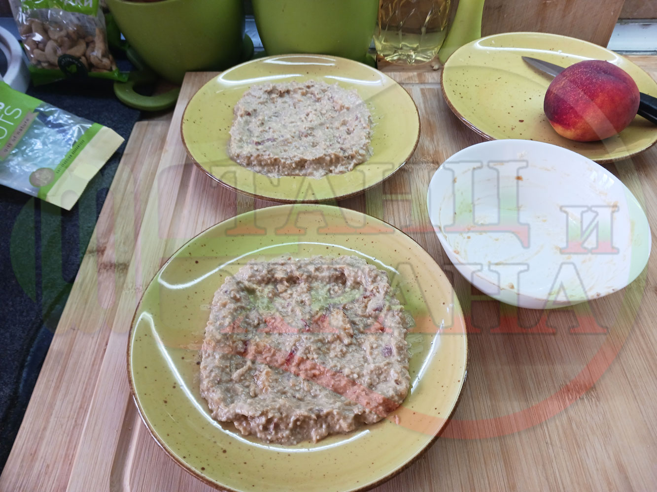 Превъзходна плодова сурова салата от 2 основни продукта. Приготвих плодово ядков крем от пресни праскови и печено и осолено кашу, който оформих като кладенчета. Гарнирах кладенчетата с резени от прясно нарязана праскова и сурови бадеми. Получи се хармония и баланс между сладостта и сочността от пресните праскови с едва доловимата солена нотка от печеното кашу с хрупкавостта на суровото кашу. Ммммм.... отново спретнах голяма вкусно, вкусна, вкусотия (вкуснотия)... ![]()