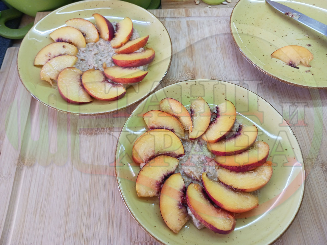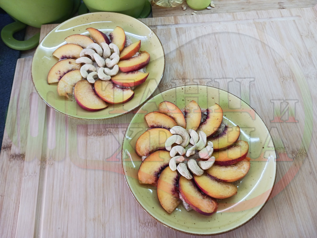 Разпределете равномерно плодово ядковия крем в средата на чиниите и оформете средно широки "кладенчета" със средно високи стени и плътно дъно, така че да задържи нарязаната на резени праскова и целите ядки сурово кашу. Нарежете прасковата на тънки резени и разпределете и подредете резените по диаметъра на кладенчетата (измийте прасковата и отстранете костилката). Подредете в средата на кладенчетата сурови ядки кашу в произволна форма и украсете с цяла ядка кашу в средата (украсете по ваше желание и усмотрение).