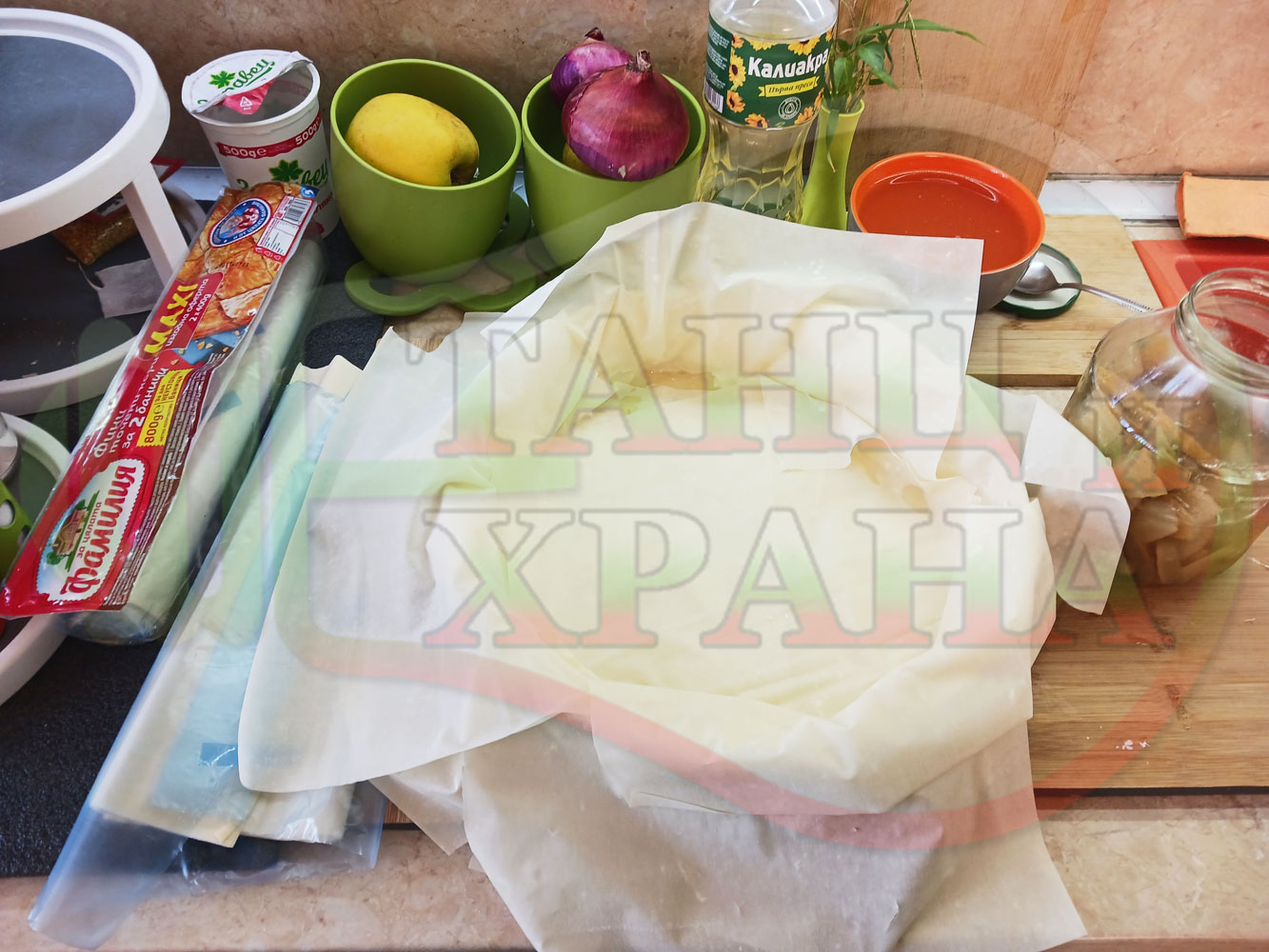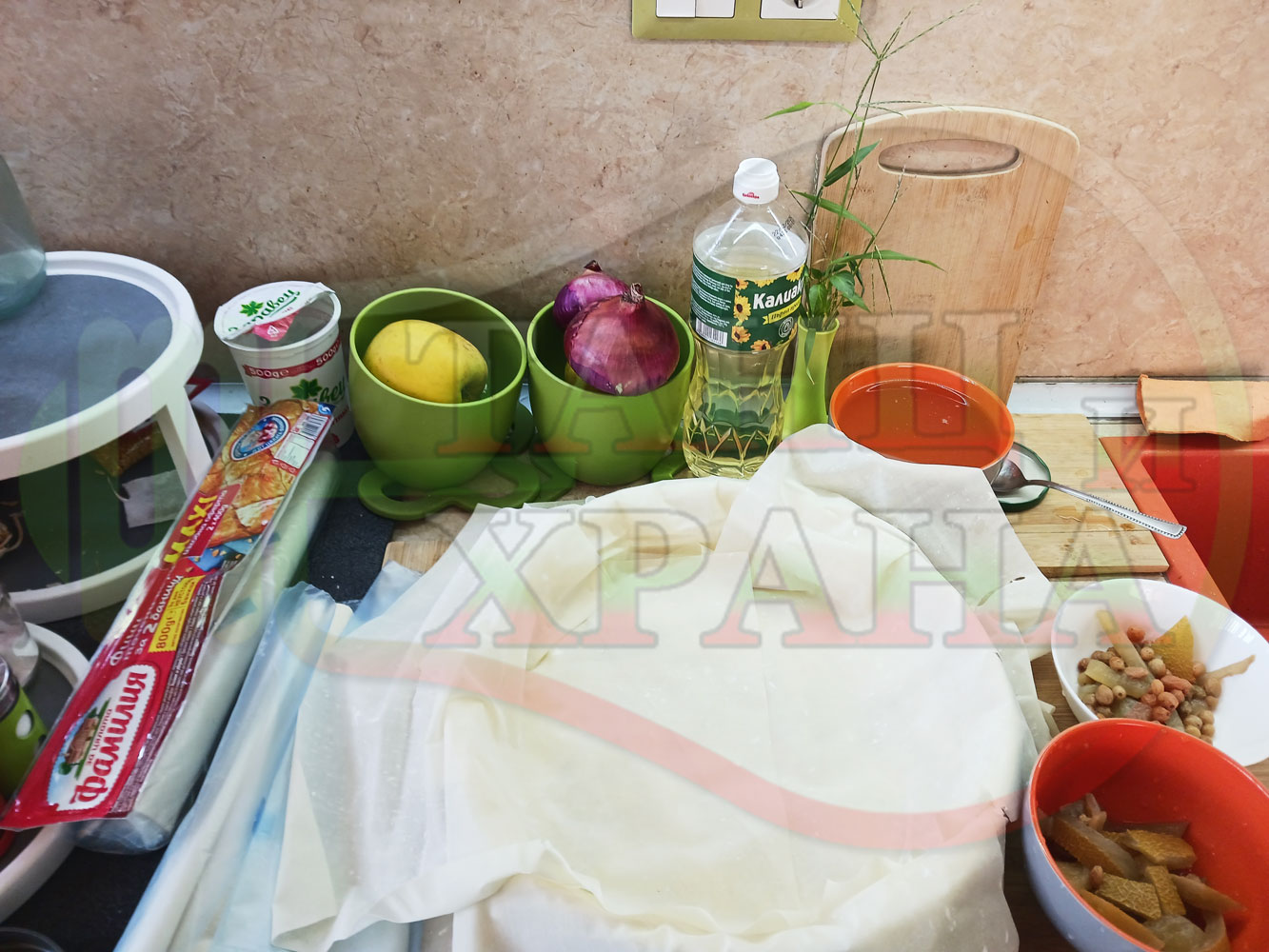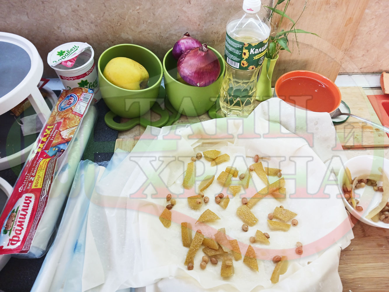 ПРОДУКТИ: Приблизителни количества за пъпешова сладка баница "Пъпешовокора златностафидена" приготвена от готови кори с плънка от сладко от кори на пъпеш със златни стафиди, кристална захар и слънчогледово олио подходяща за постещи хора