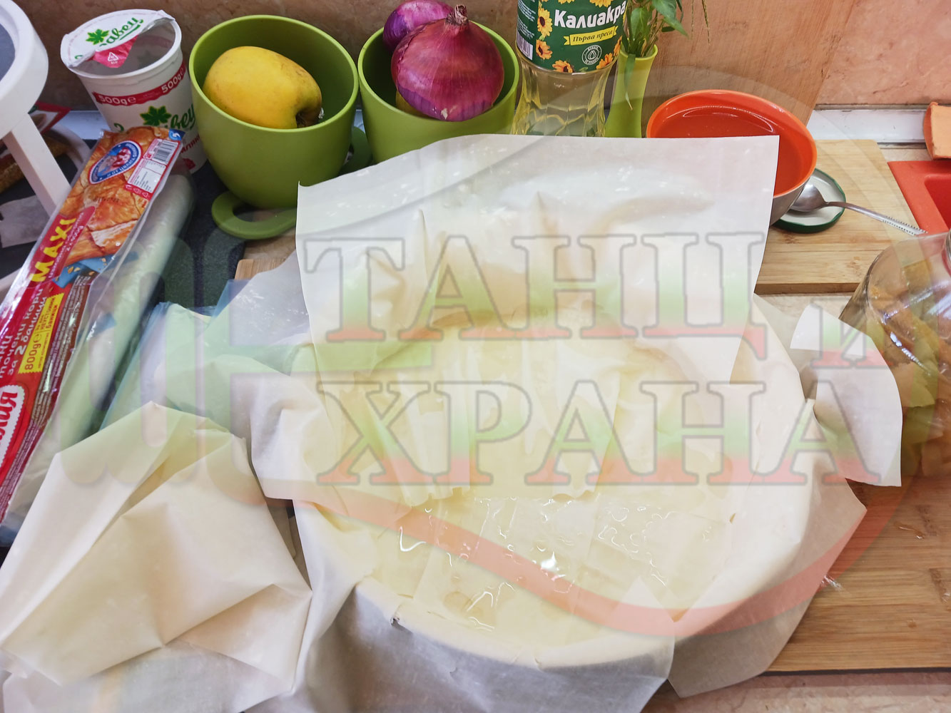 Сипете слънчогледовото олио в тава за печене и го размажете равномерно по цялата тава. Отворете пакета с готовите кори и бързо започнете да ги редите по диаметъра на тавата, така че да покриват дъното (в пакета са две рула с кори от по 400 гр.). Поръсвайте по 2 супени лъжици слънчогледово олио в средата на тавата, където се препокриват корите.