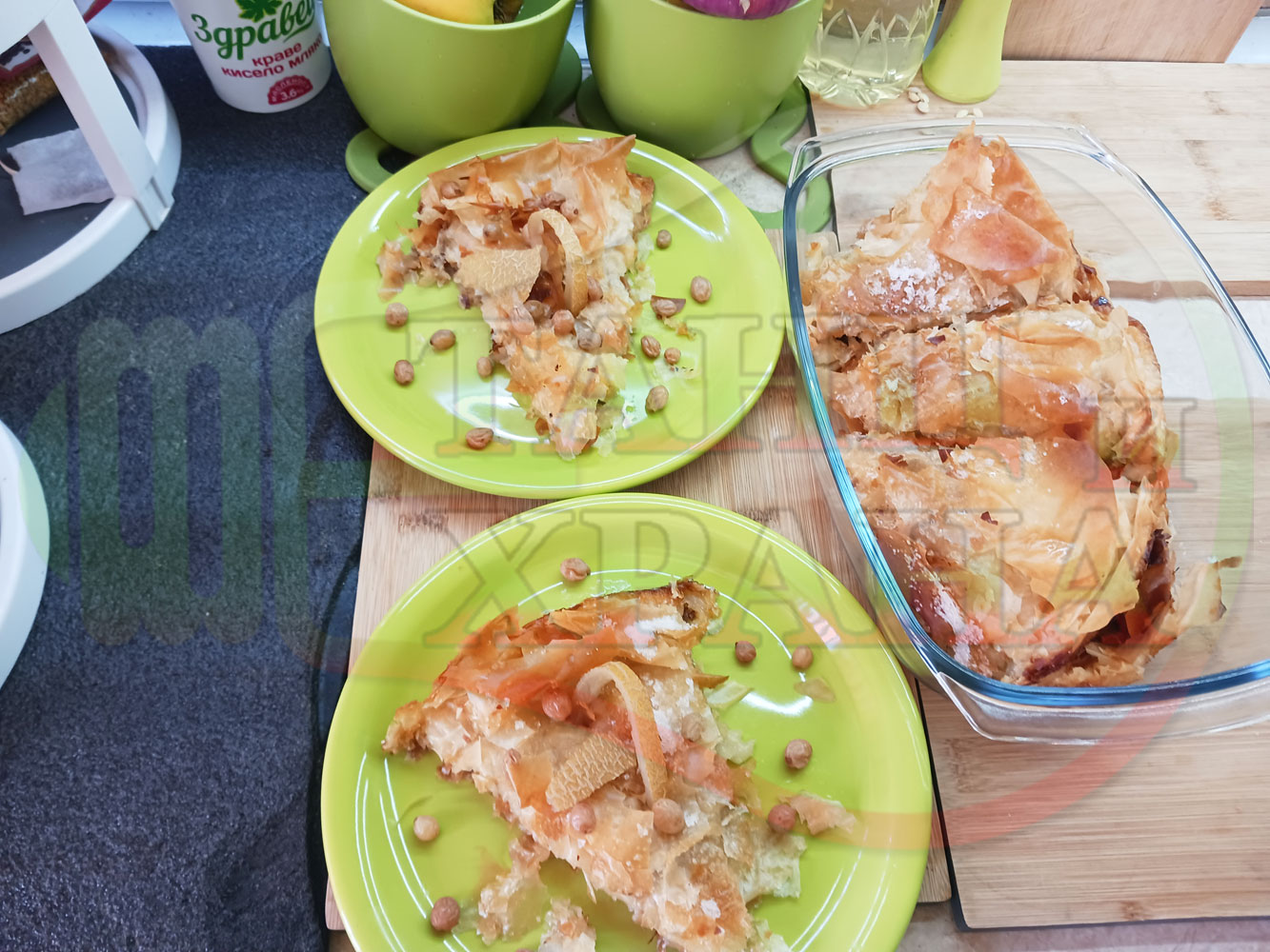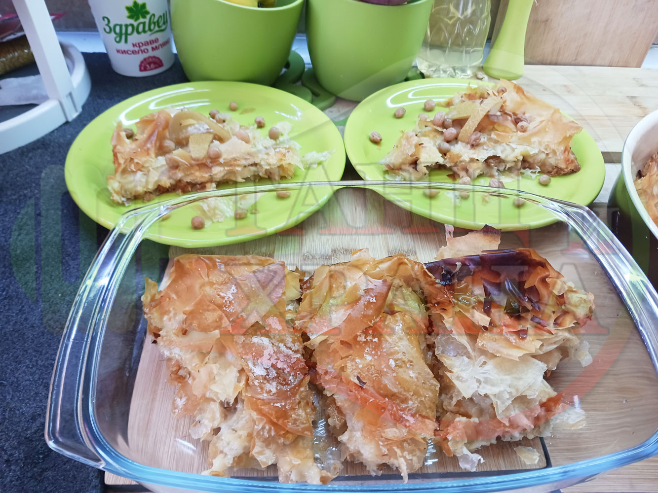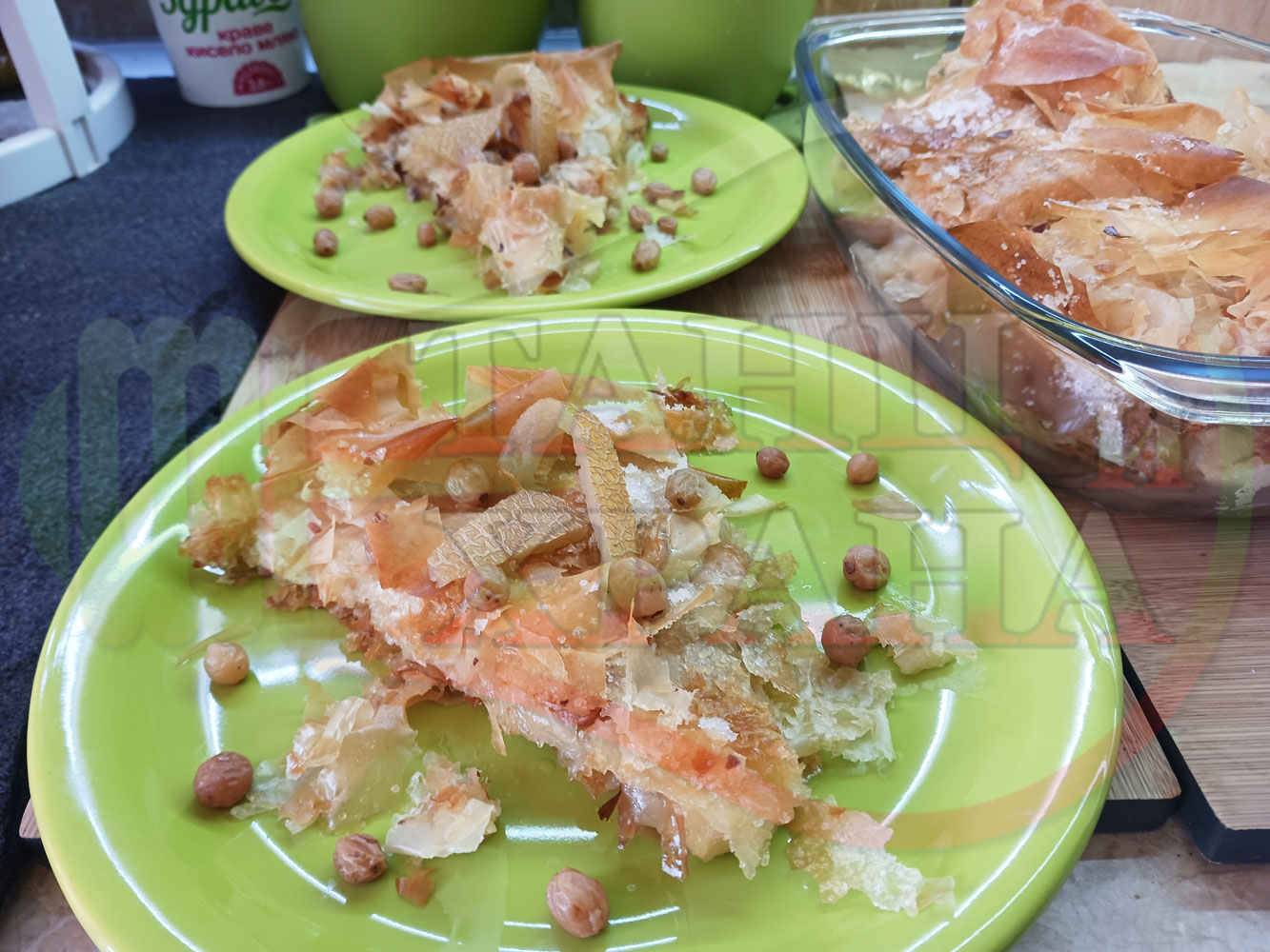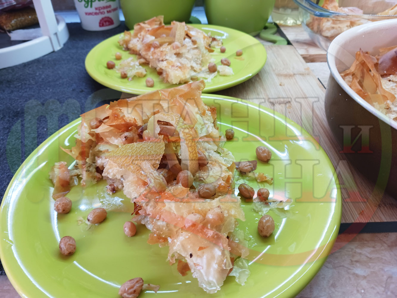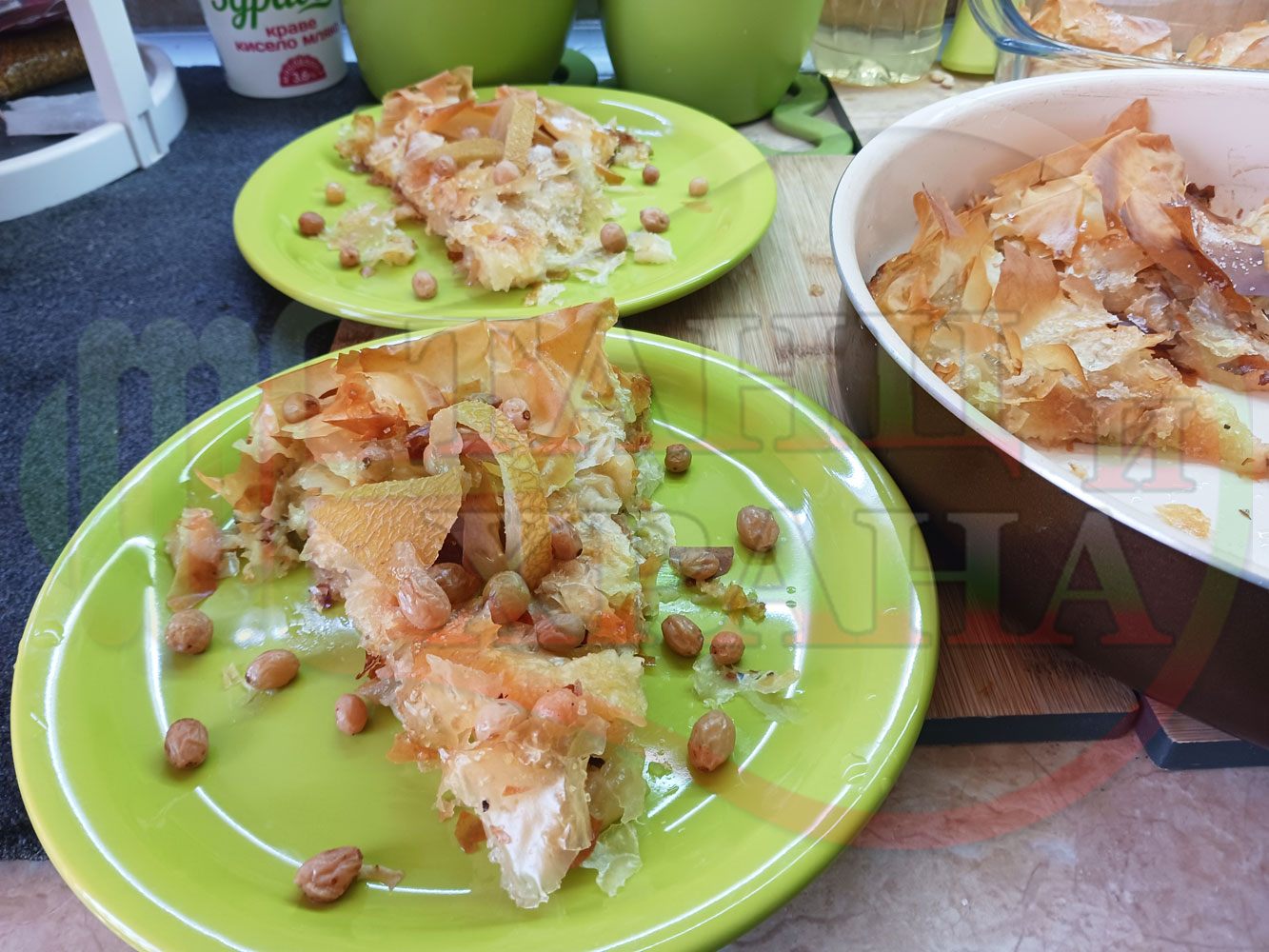 Пъпешова сладка баница "Пъпешовокора златностафидена" приготвена от готови кори с плънка от сладко от кори на пъпеш със златни стафиди, кристална захар и слънчогледово олио подходяща за постещи хора