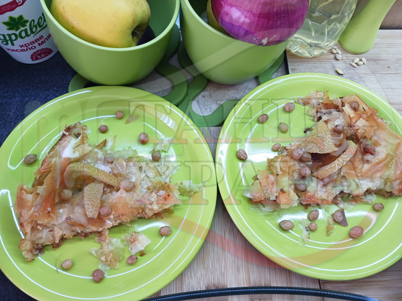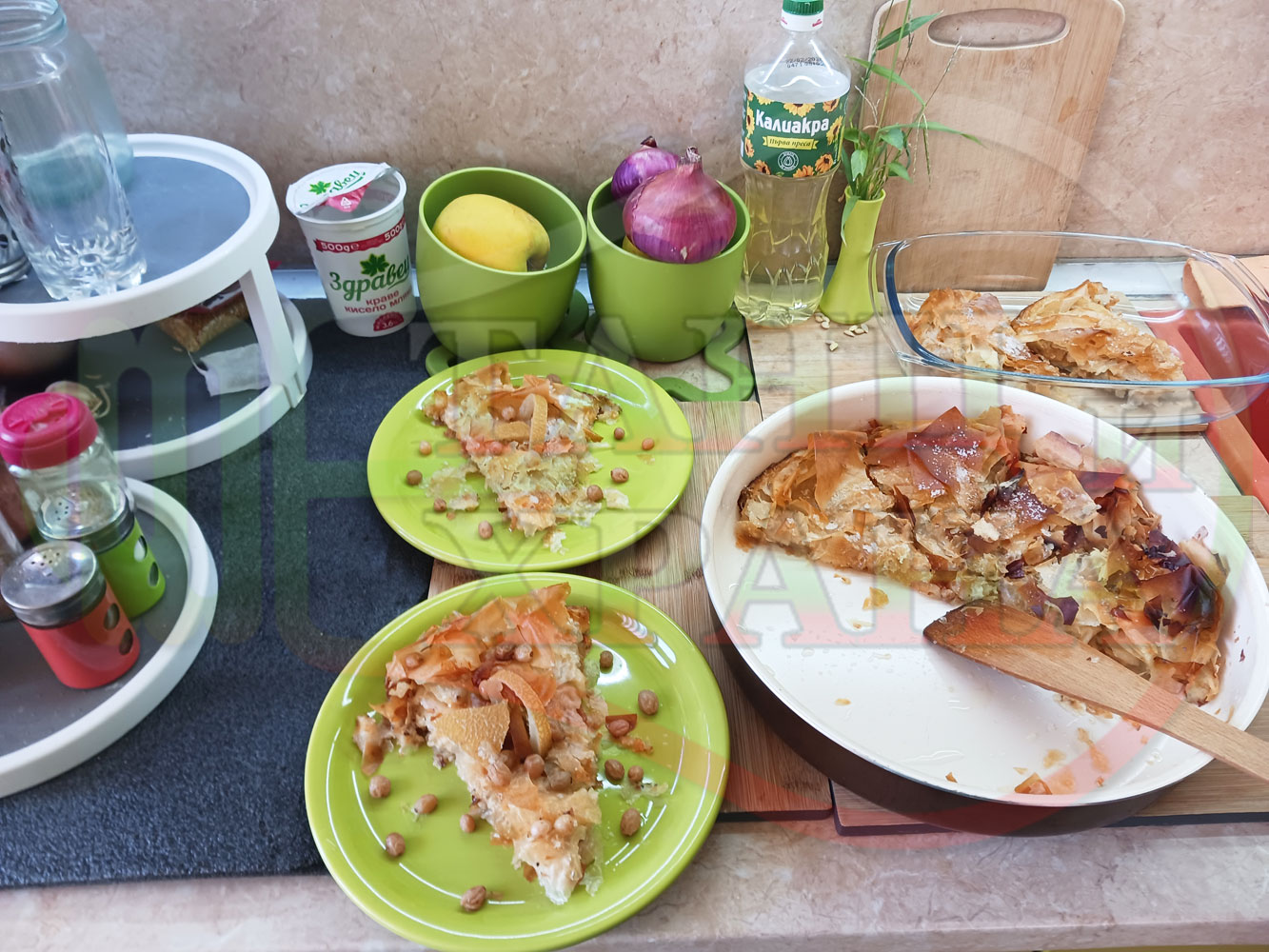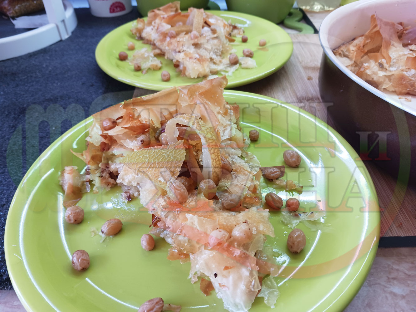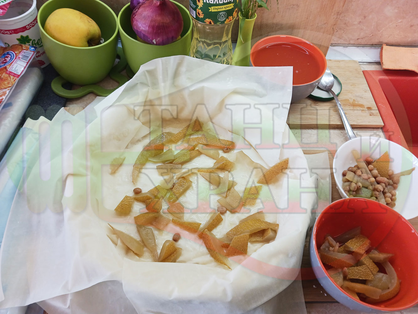 Пъпешова сладка баница "Пъпешовокора златностафидена" приготвена от готови кори с плънка от сладко от кори на пъпеш със златни стафиди, кристална захар и слънчогледово олио подходяща за постещи хора
