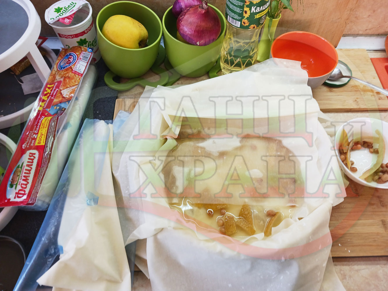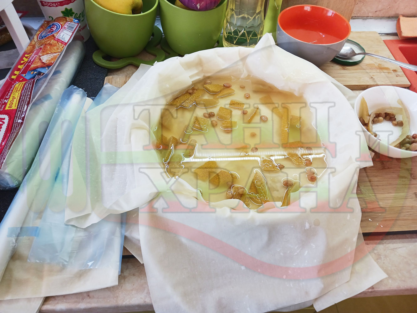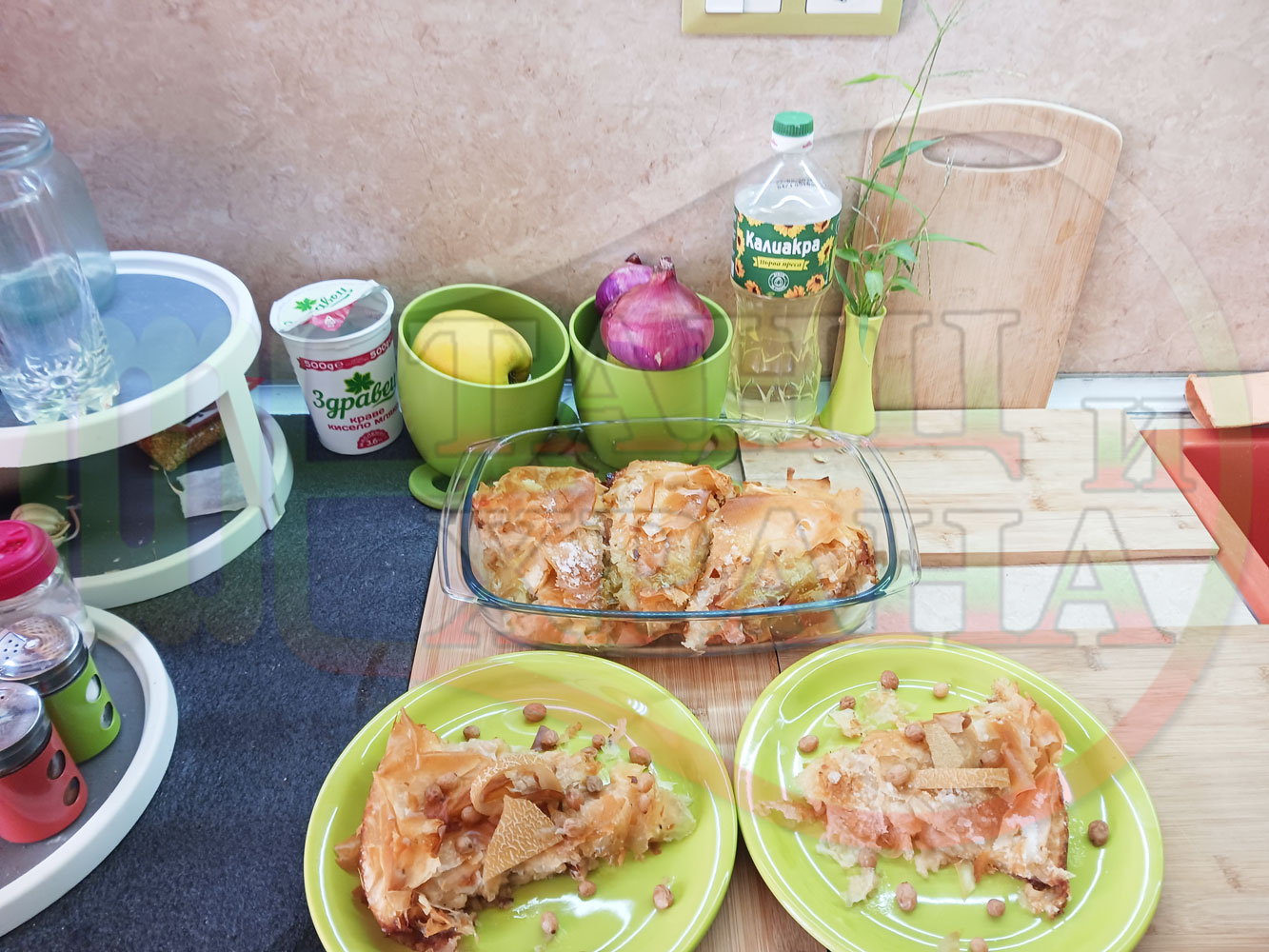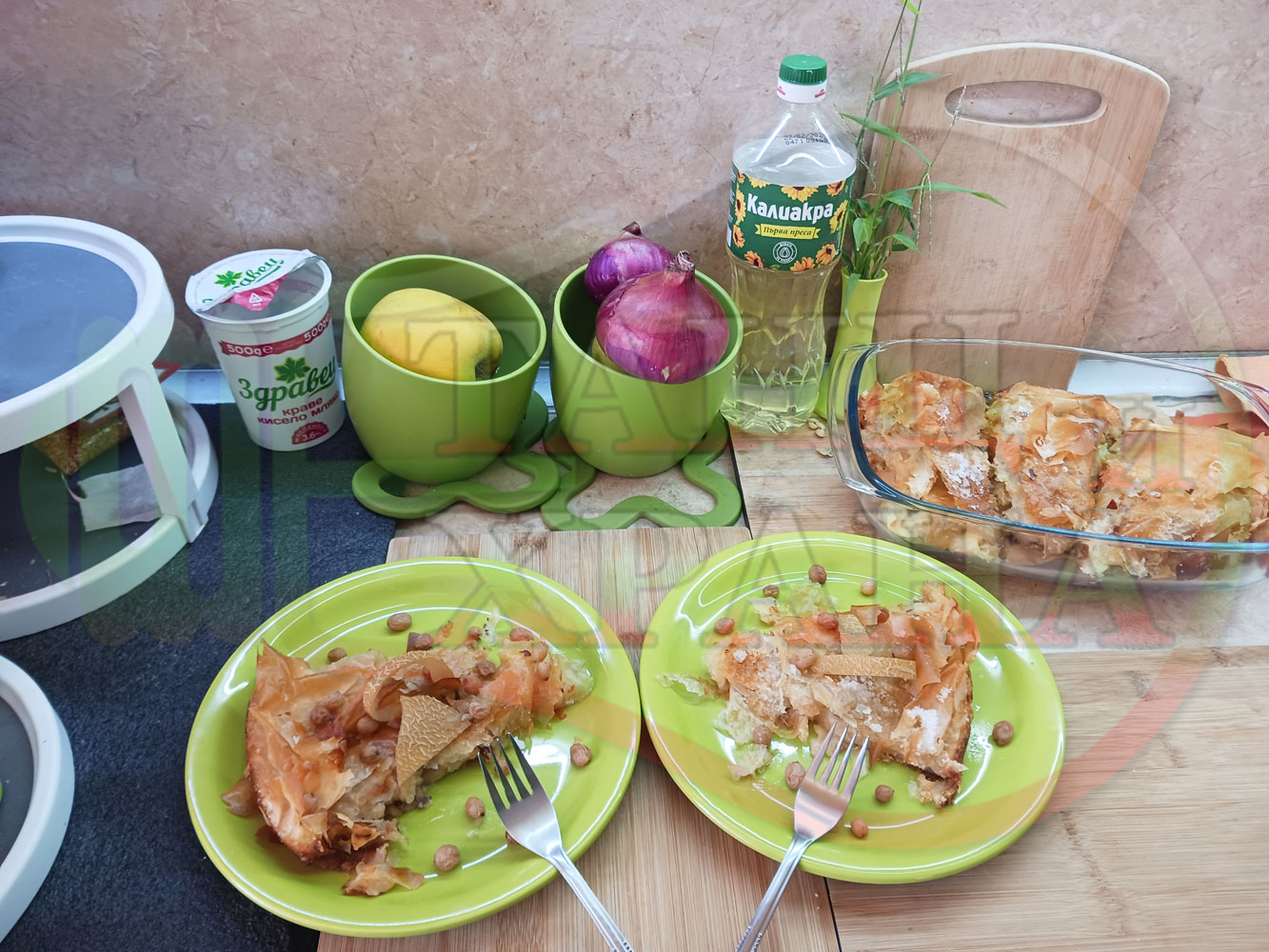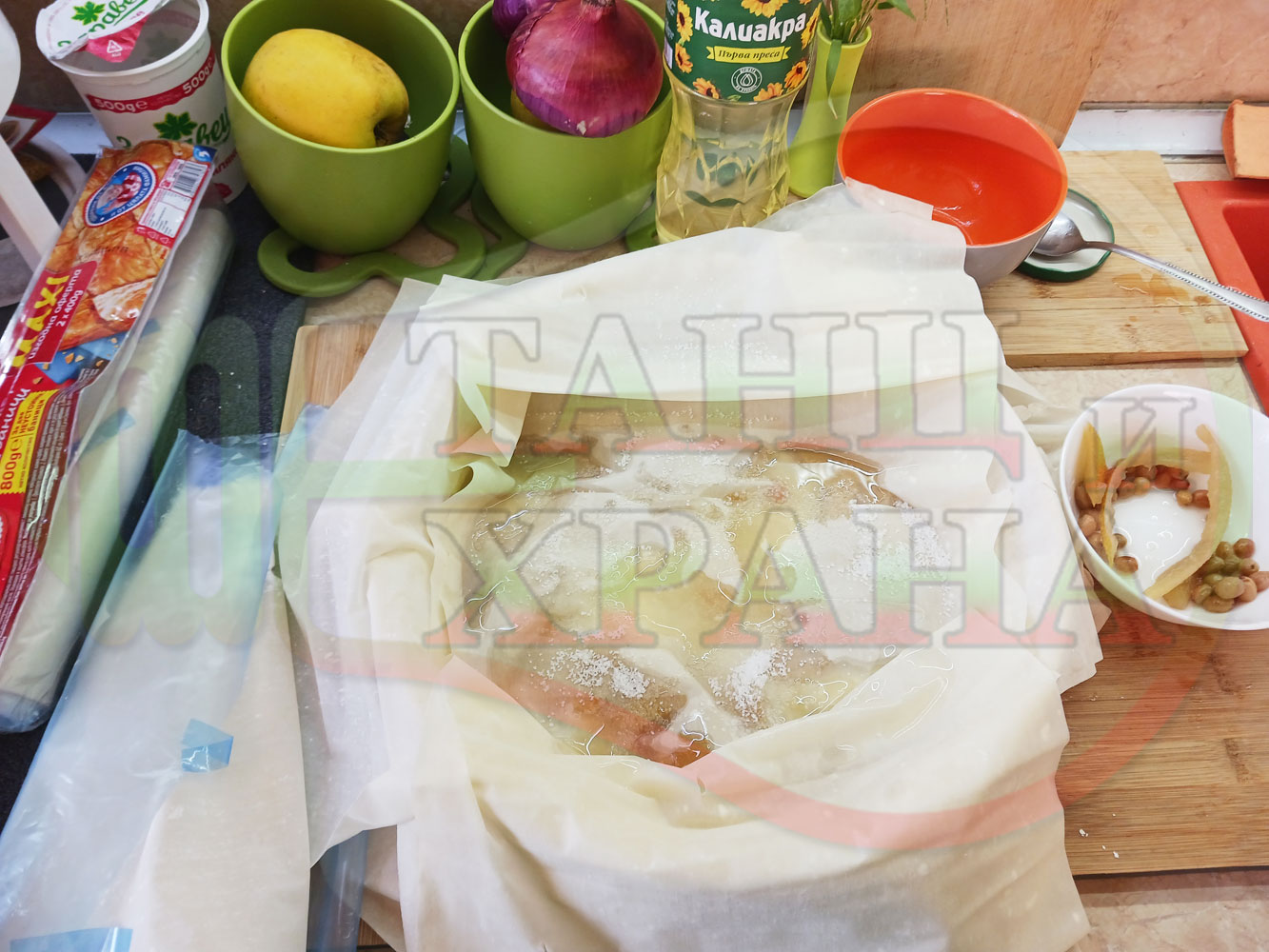 Пъпешова сладка баница "Пъпешовокора златностафидена" приготвена от готови кори с плънка от сладко от кори на пъпеш със златни стафиди, кристална захар и слънчогледово олио подходяща за постещи хора