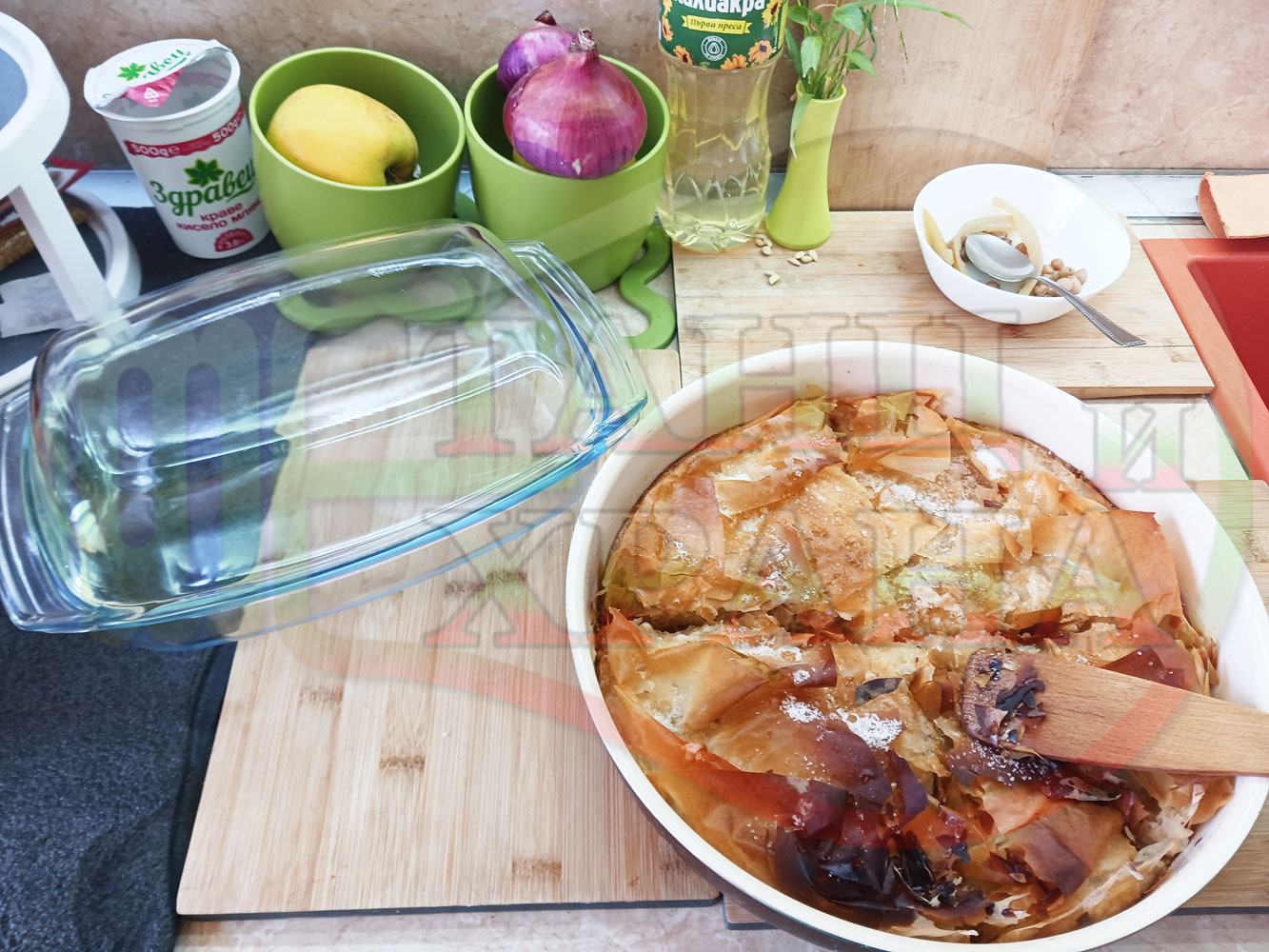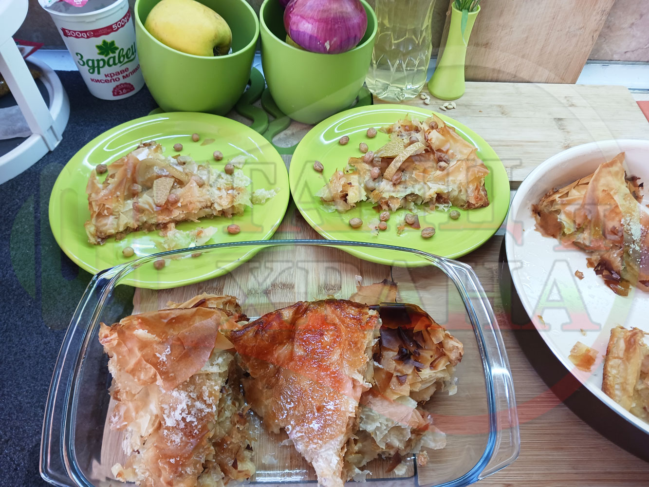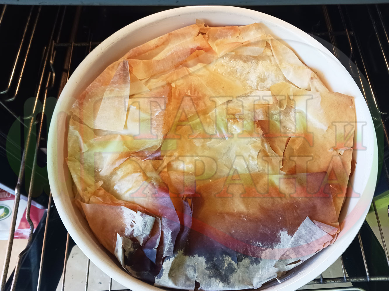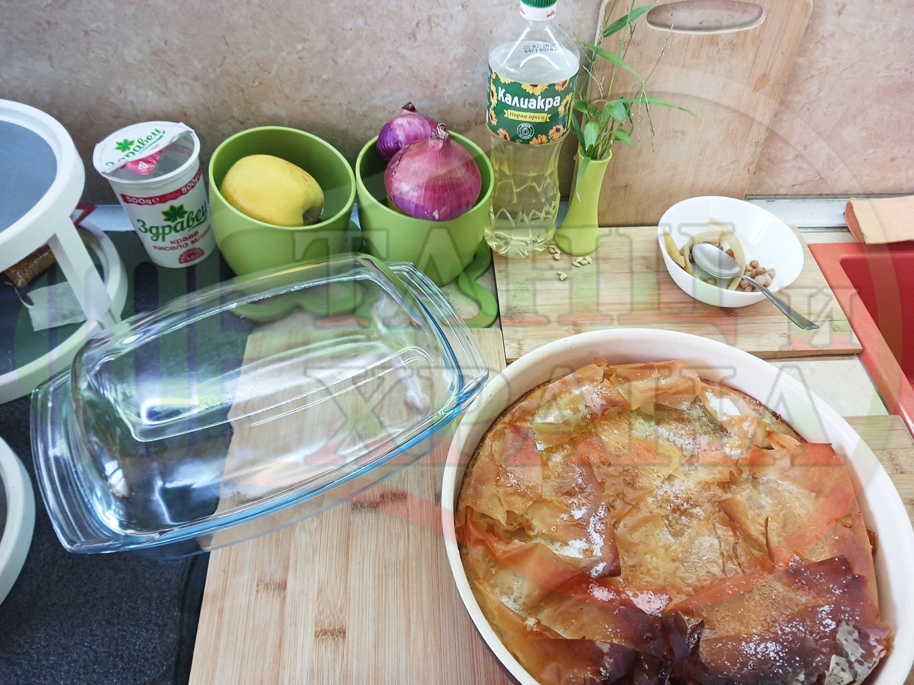 Пъпешова сладка баница "Пъпешовокора златностафидена" приготвена от готови кори с плънка от сладко от кори на пъпеш със златни стафиди, кристална захар и слънчогледово олио подходяща за постещи хора