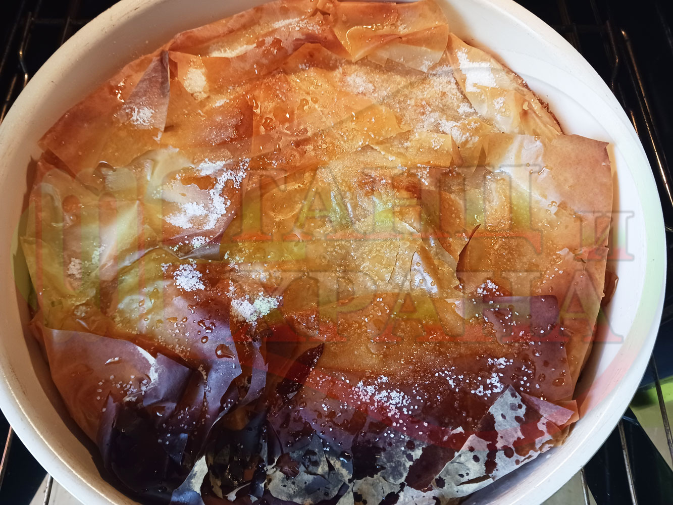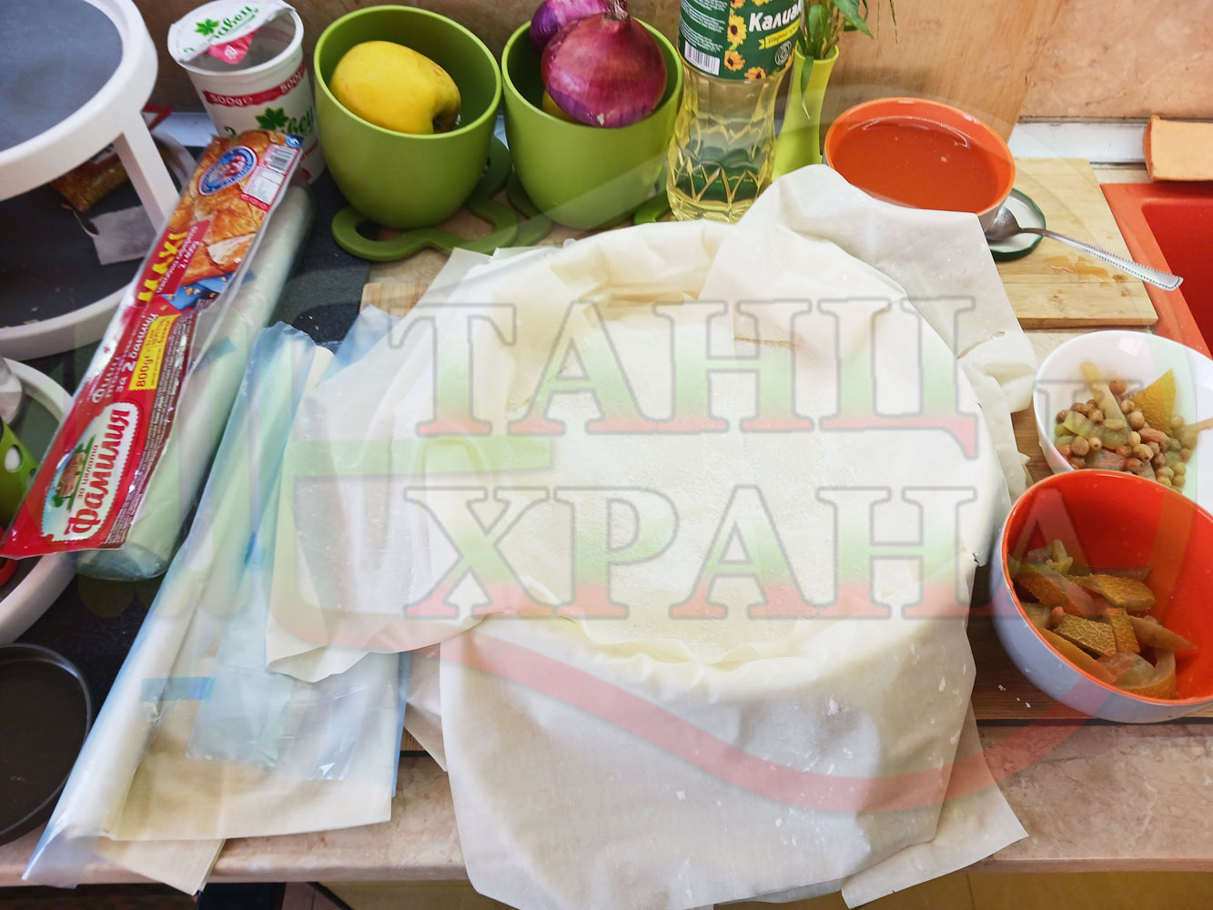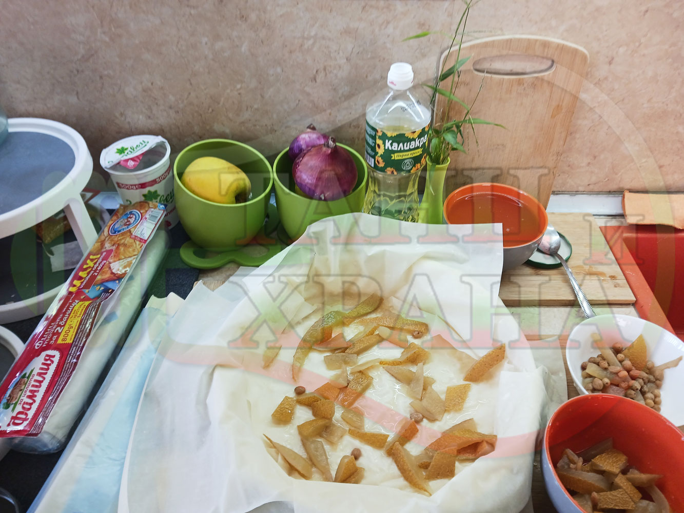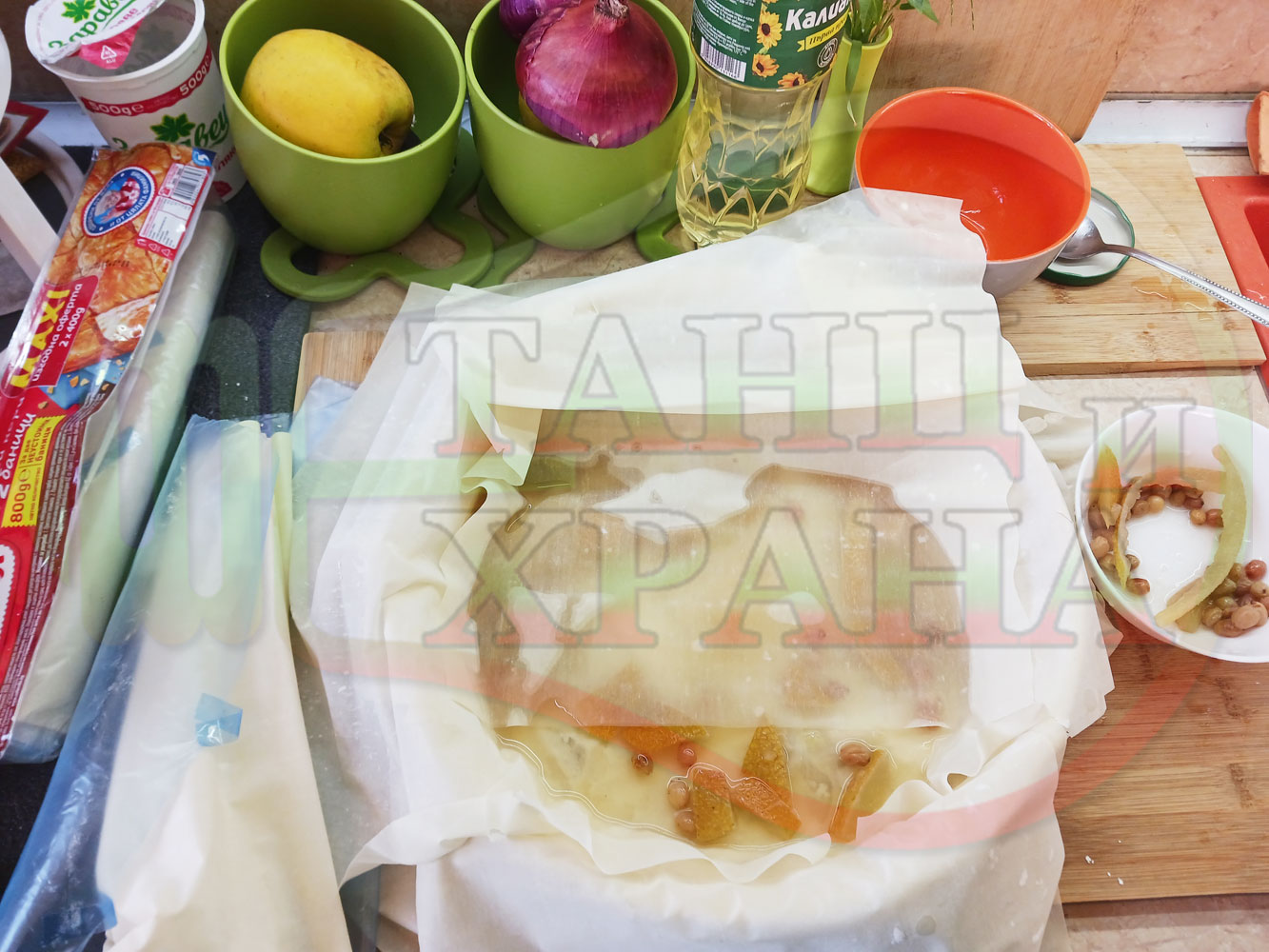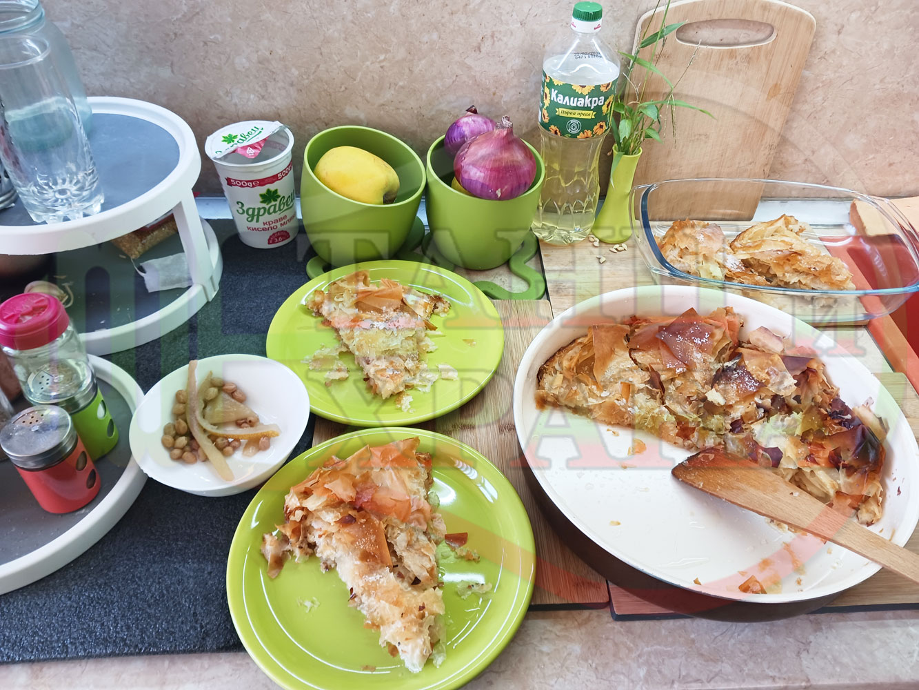 Пъпешова сладка баница "Пъпешовокора златностафидена" приготвена от готови кори с плънка от сладко от кори на пъпеш със златни стафиди, кристална захар и слънчогледово олио подходяща за постещи хора