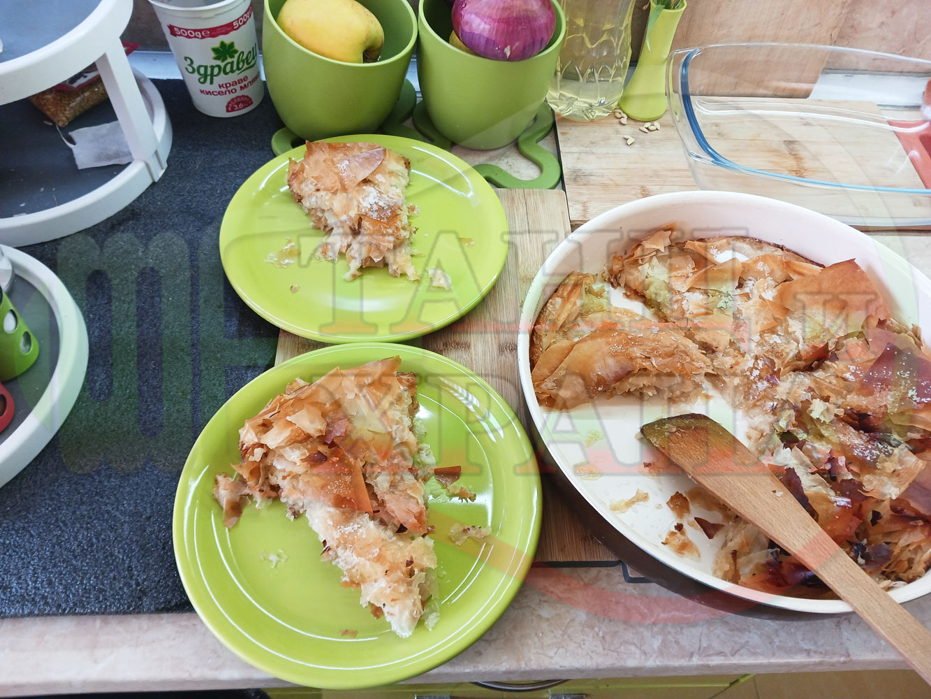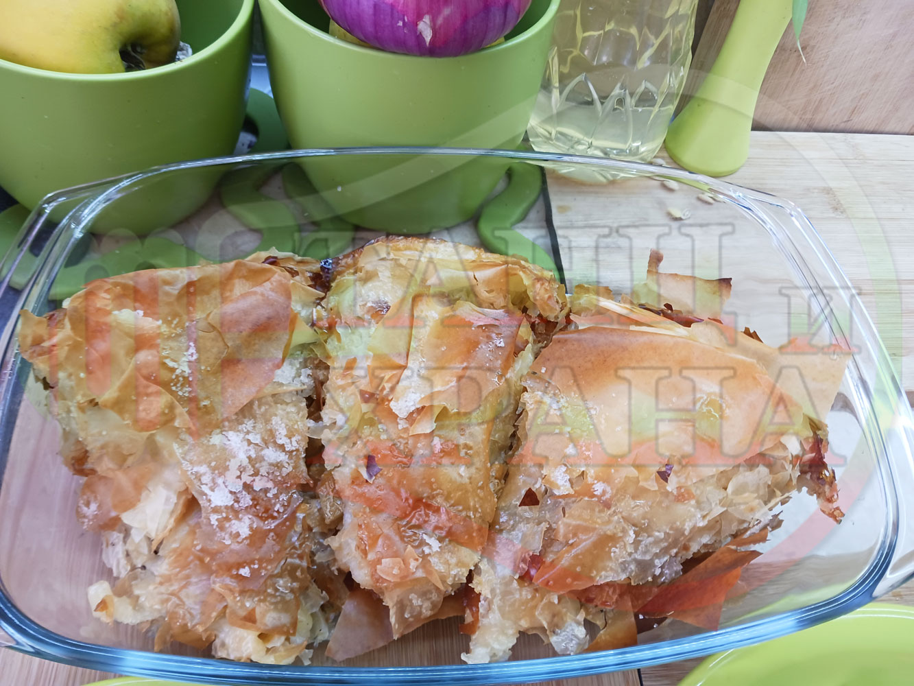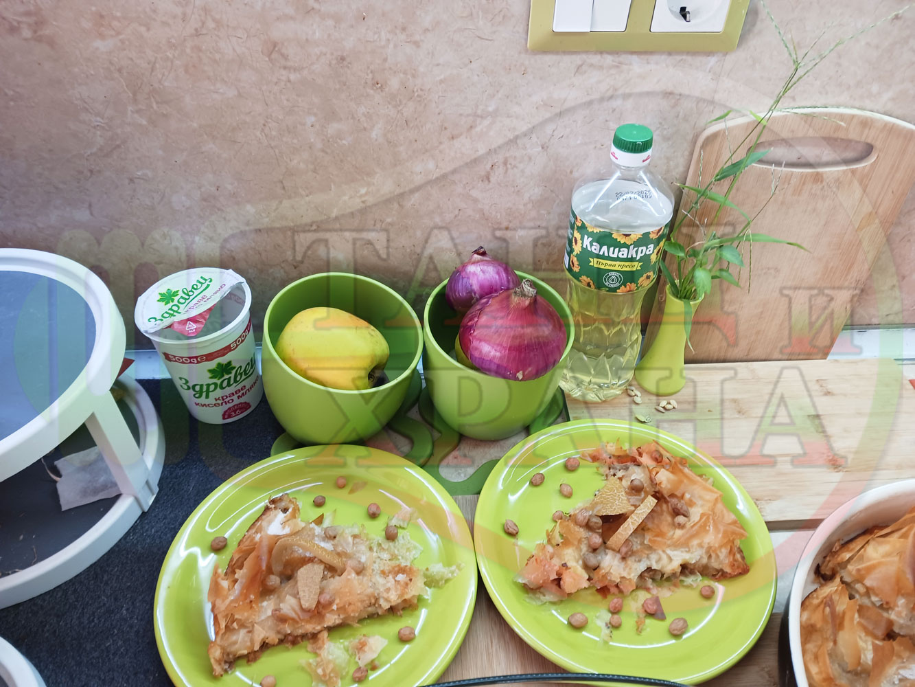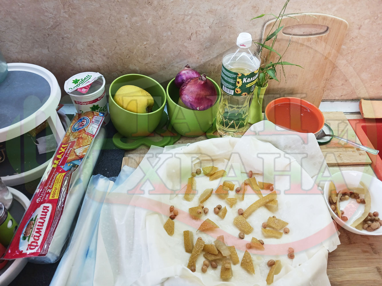 Пъпешова сладка баница "Пъпешовокора златностафидена" приготвена от готови кори с плънка от сладко от кори на пъпеш със златни стафиди, кристална захар и слънчогледово олио подходяща за постещи хора