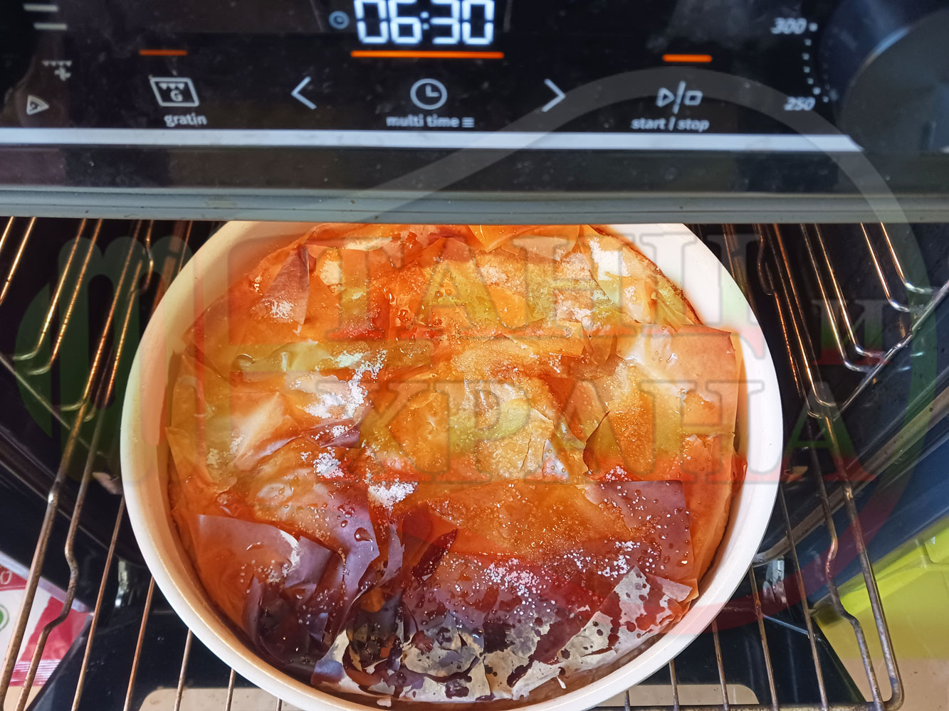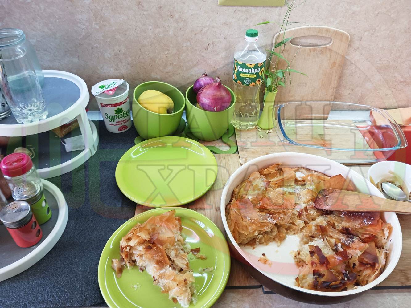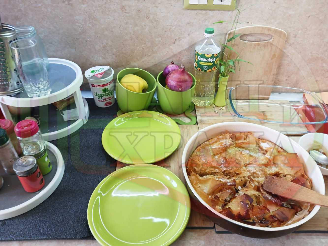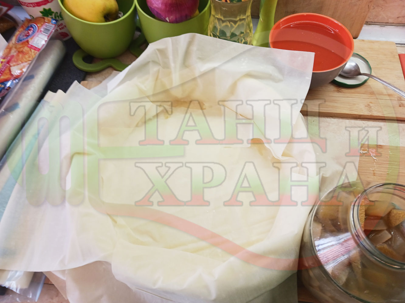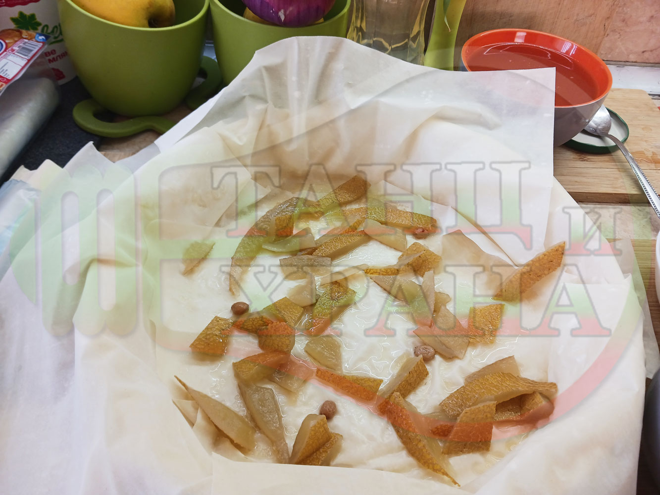 Пъпешова сладка баница "Пъпешовокора златностафидена" приготвена от готови кори с плънка от сладко от кори на пъпеш със златни стафиди, кристална захар и слънчогледово олио подходяща за постещи хора