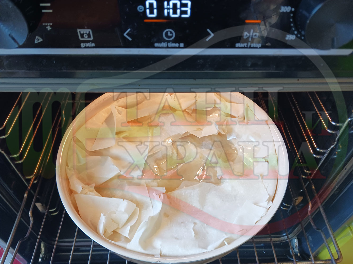 Поставете тавата в предварително загрятата фурна (загрейте я за поне 5 минути). Запечете на фурна без вентилатор на 180 градуса за около 60 минути.