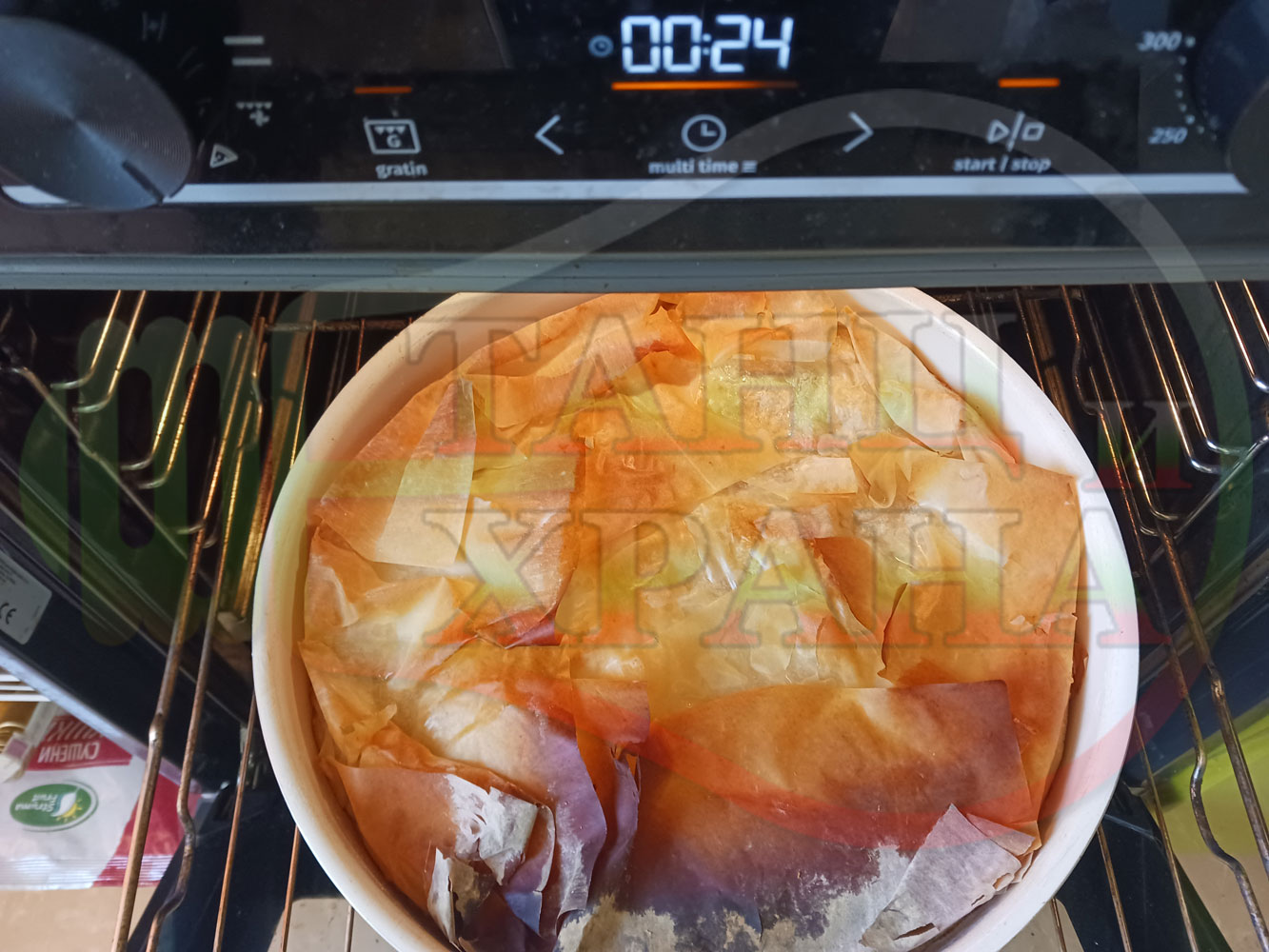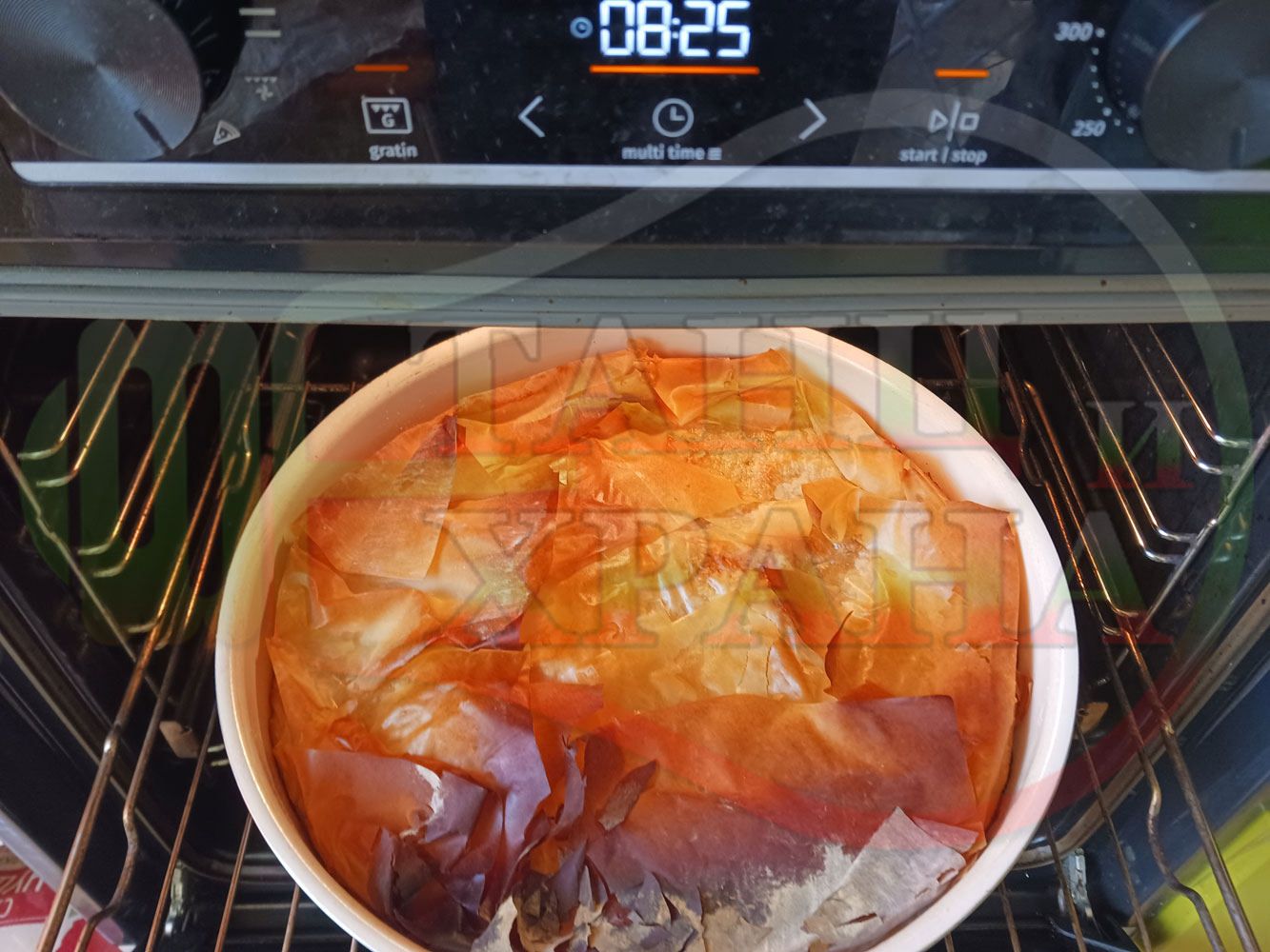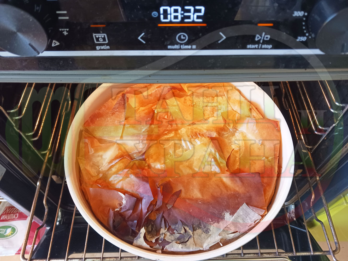 ВНИМАНИЕ: Фурните са различни и съответно времето за запичане е ориентировъчно. Наблюдавайте процеса на запичане и при необходимост, покрийте с хартия или фолио за печене. За по-равномерно изпичане е желателно да покриете баницата след 15-та минута или да я сложите на по-ниска скара под друг вид ястие (в случай, че готвите друг вид ястие заедно с баницата).