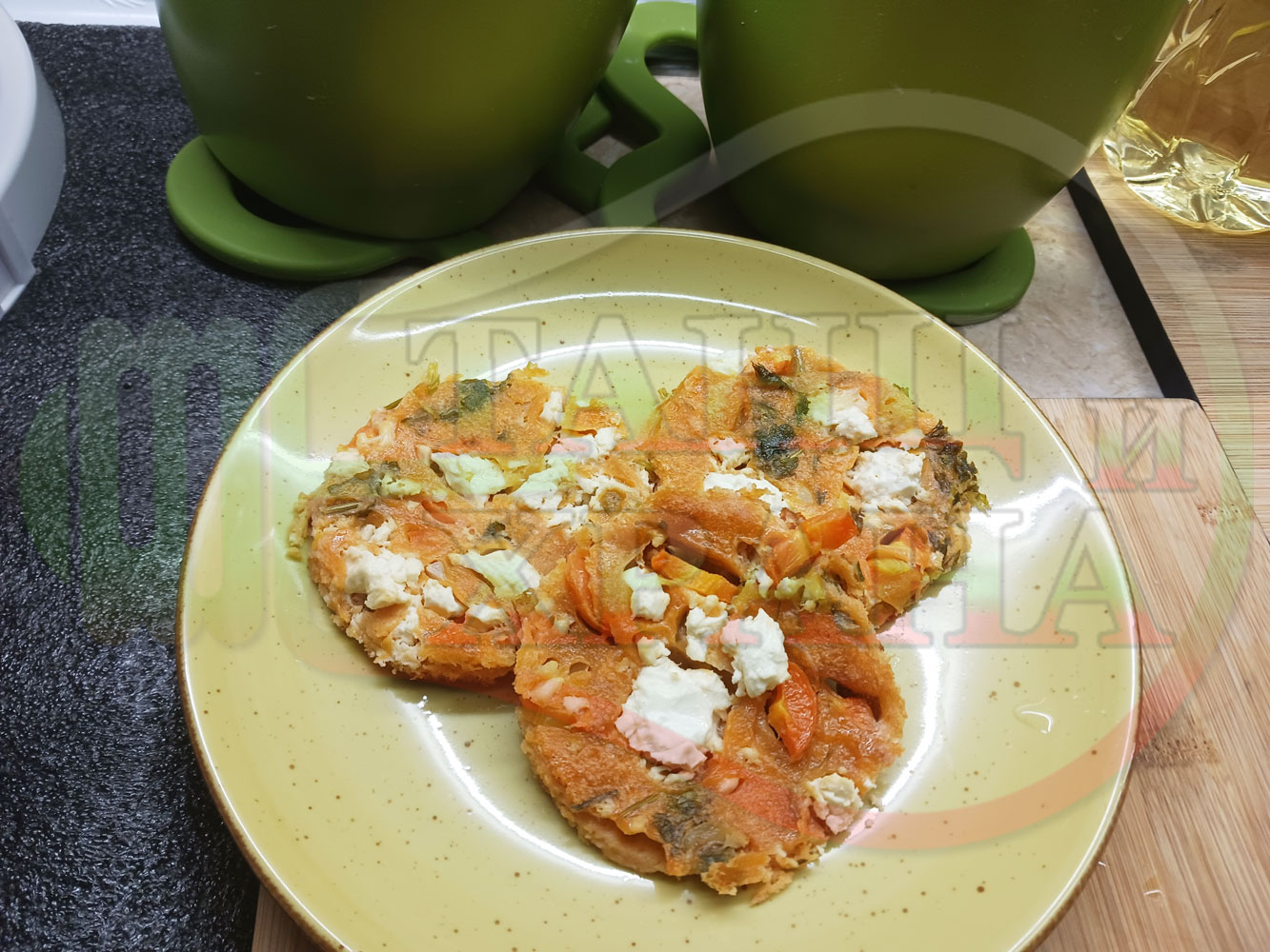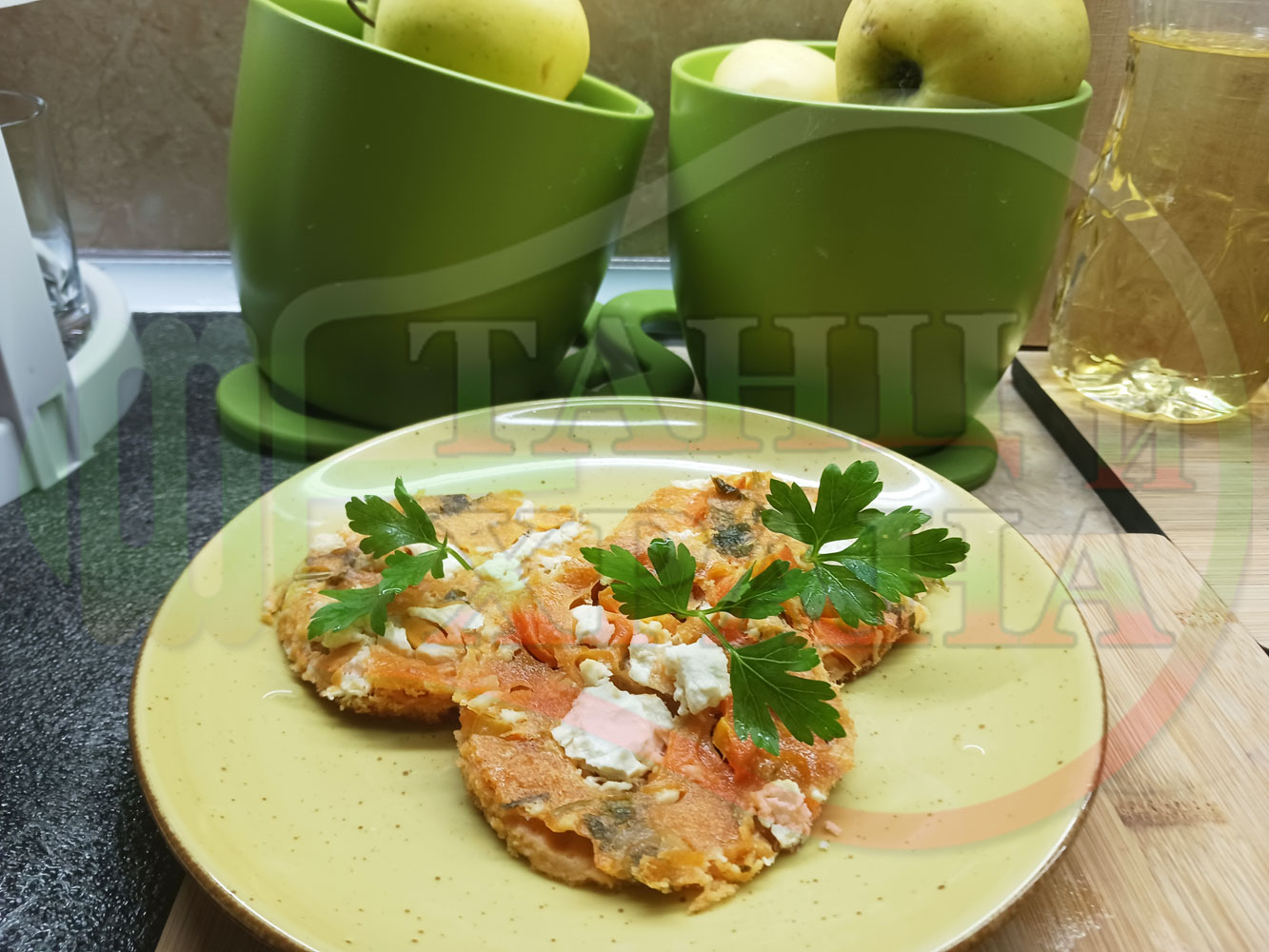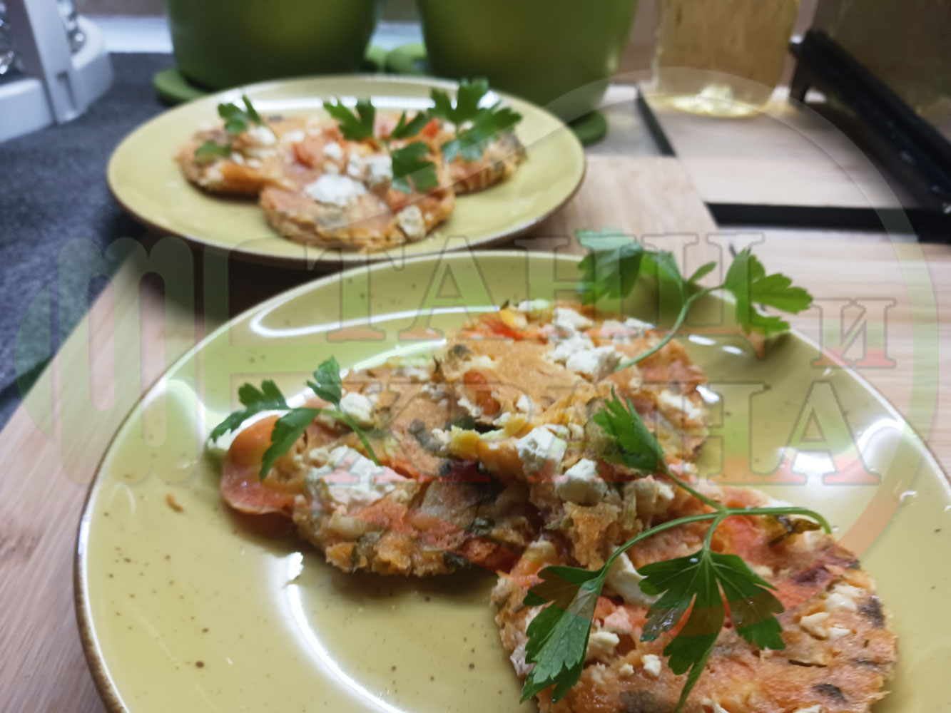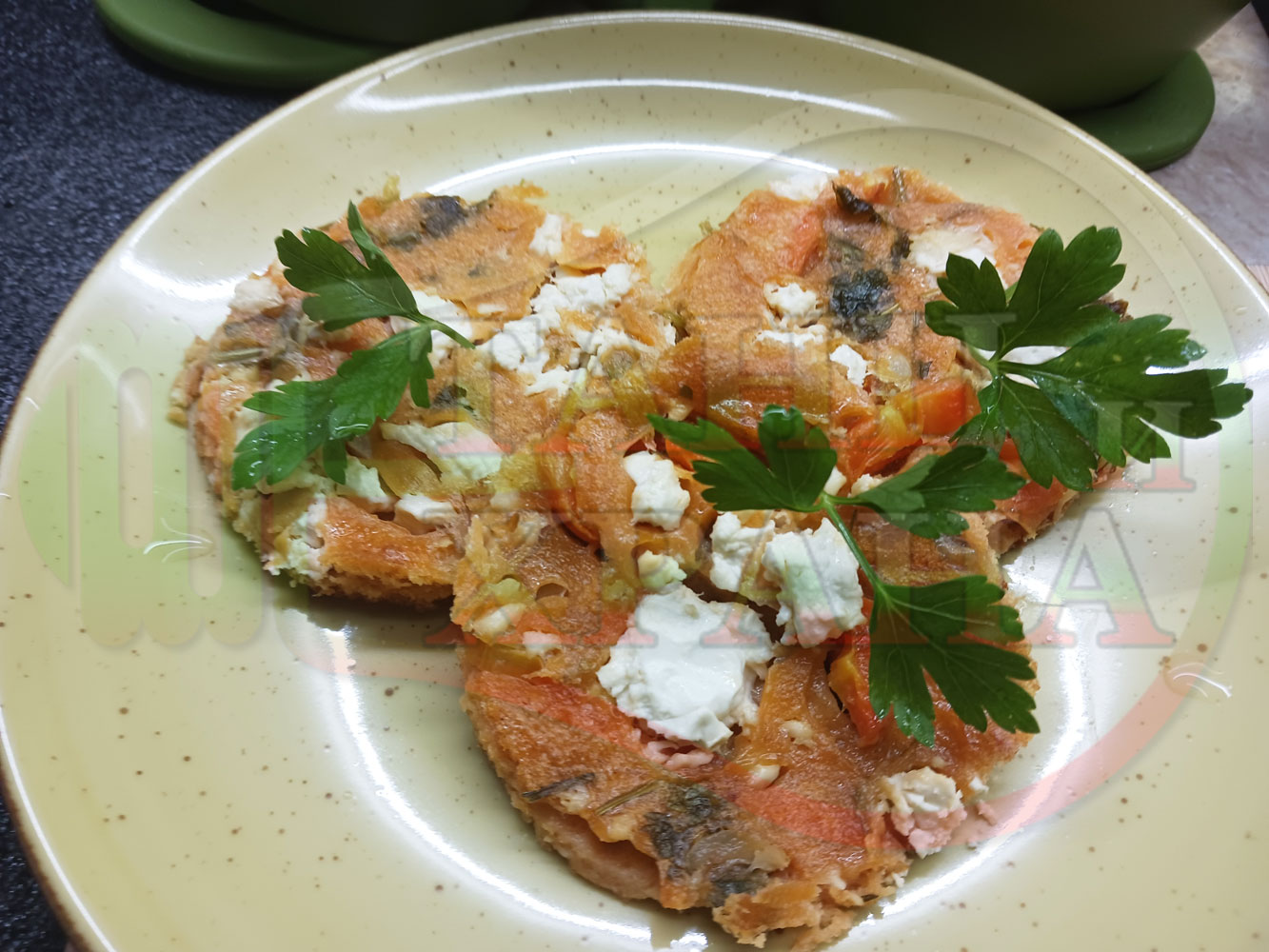 Бухтени палачинки "Морковени с БГсирене" запечени на фурна с краве бяло сирене (българско, саламурено), пресни моркови, червен сладък пипер, краве масло и свеж магданоз омесени с яйца и едросмляна лютеница