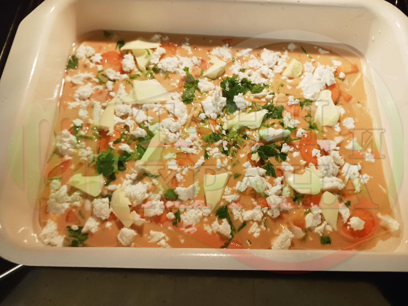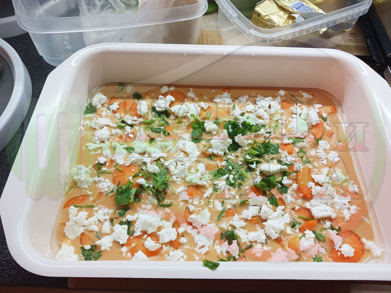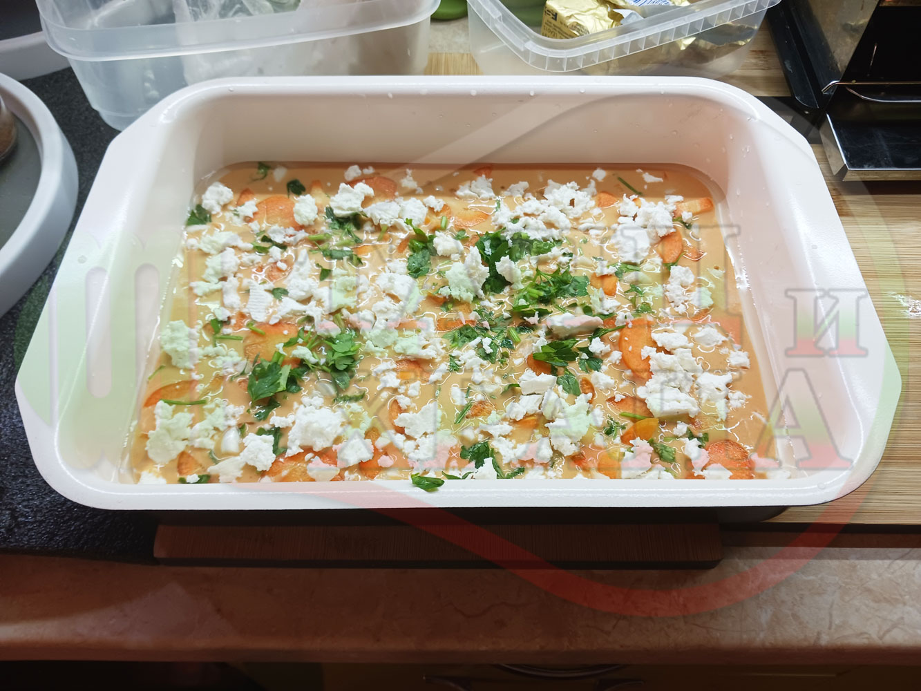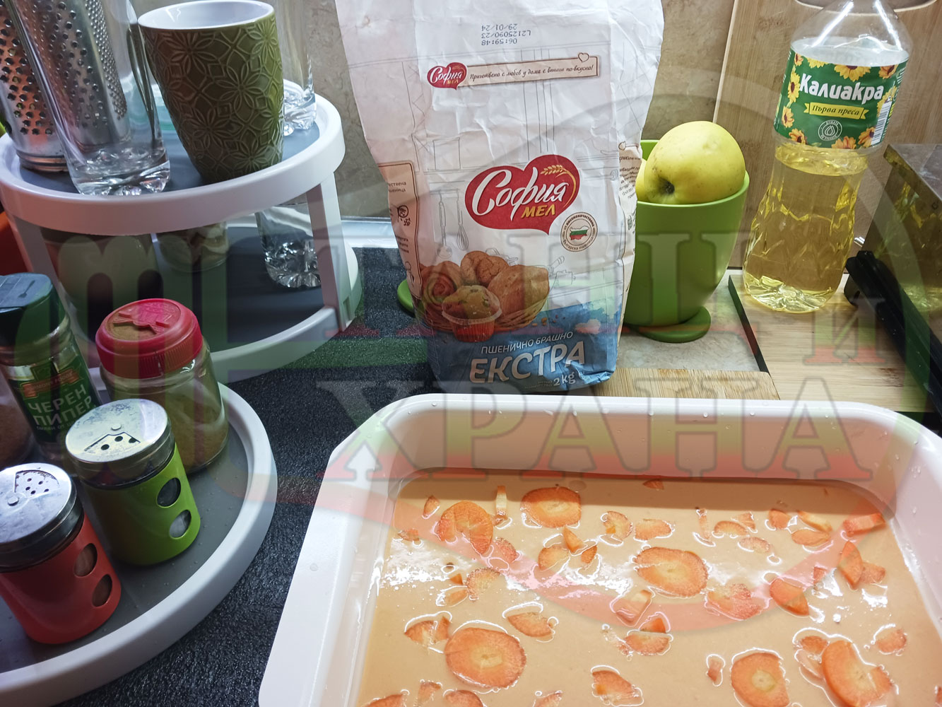 Бухтени палачинки "Морковени с БГсирене" запечени на фурна с краве бяло сирене (българско, саламурено), пресни моркови, червен сладък пипер, краве масло и свеж магданоз омесени с яйца и едросмляна лютеница
