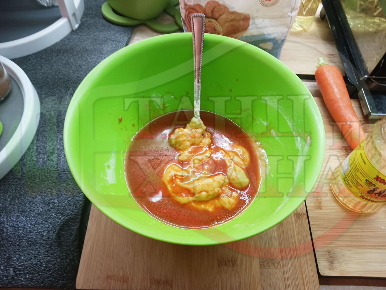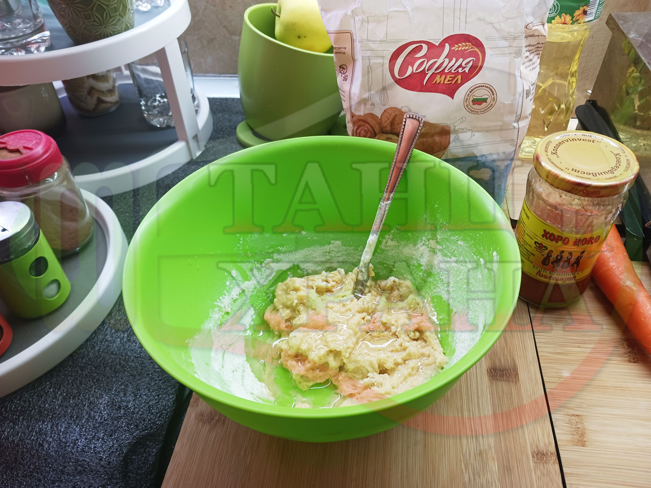 Разбийте яйцата в купа заедно със захарта, солта и слънчогледовото олио. Добавете брашното и разбъркайте (на този етап тестото е доста гъсто). Сипете лютеницата в чаша или купа или я оставете в бурканчето, в случай че е останала 1 супена лъжица, налейте топла към гореща вода от чешмата и разбъркайте до пълно разтваряне на лютеницата и "овкусяване" на водата (лютенично овкусяване (най-лесно се разтваря лютеницата, която е в бурканчето чрез затваряне на капачката и разтръскване)). Изсипете разтворената лютеница в купата с яйцата и брашното и разбъркайте с вилица или миксер до получаване на средно гъсто, хомогенизирано бухтено тесто (тестото трябва да е по-скоро течно отколкото гъсто, с една идея по-рядко от палачинковото).