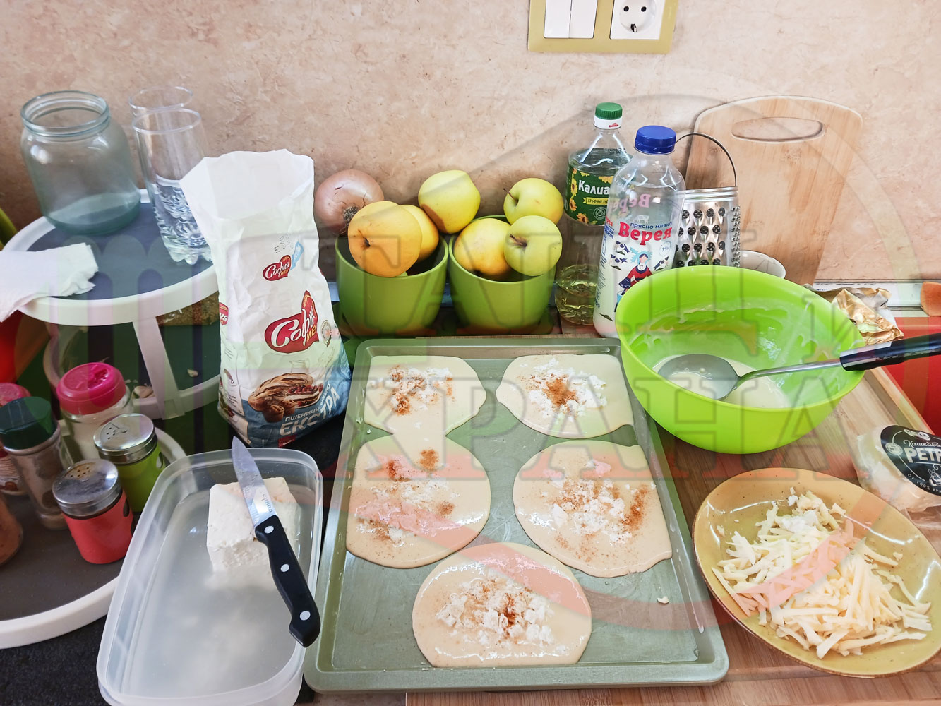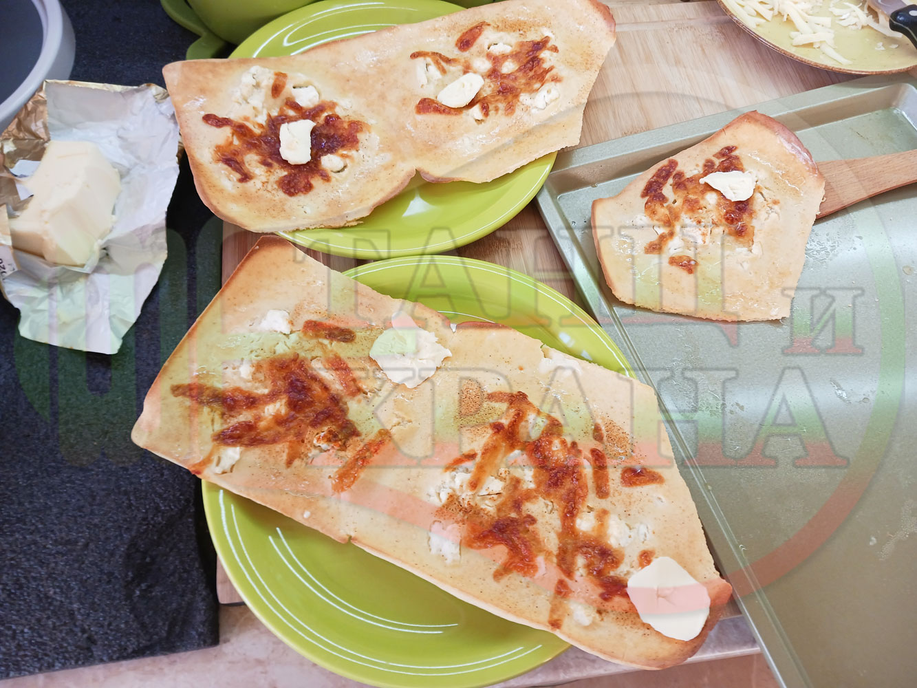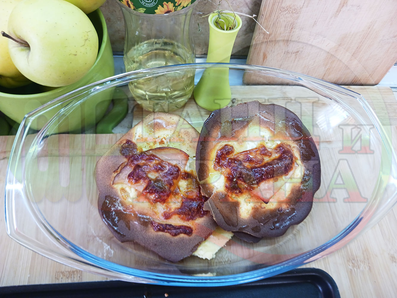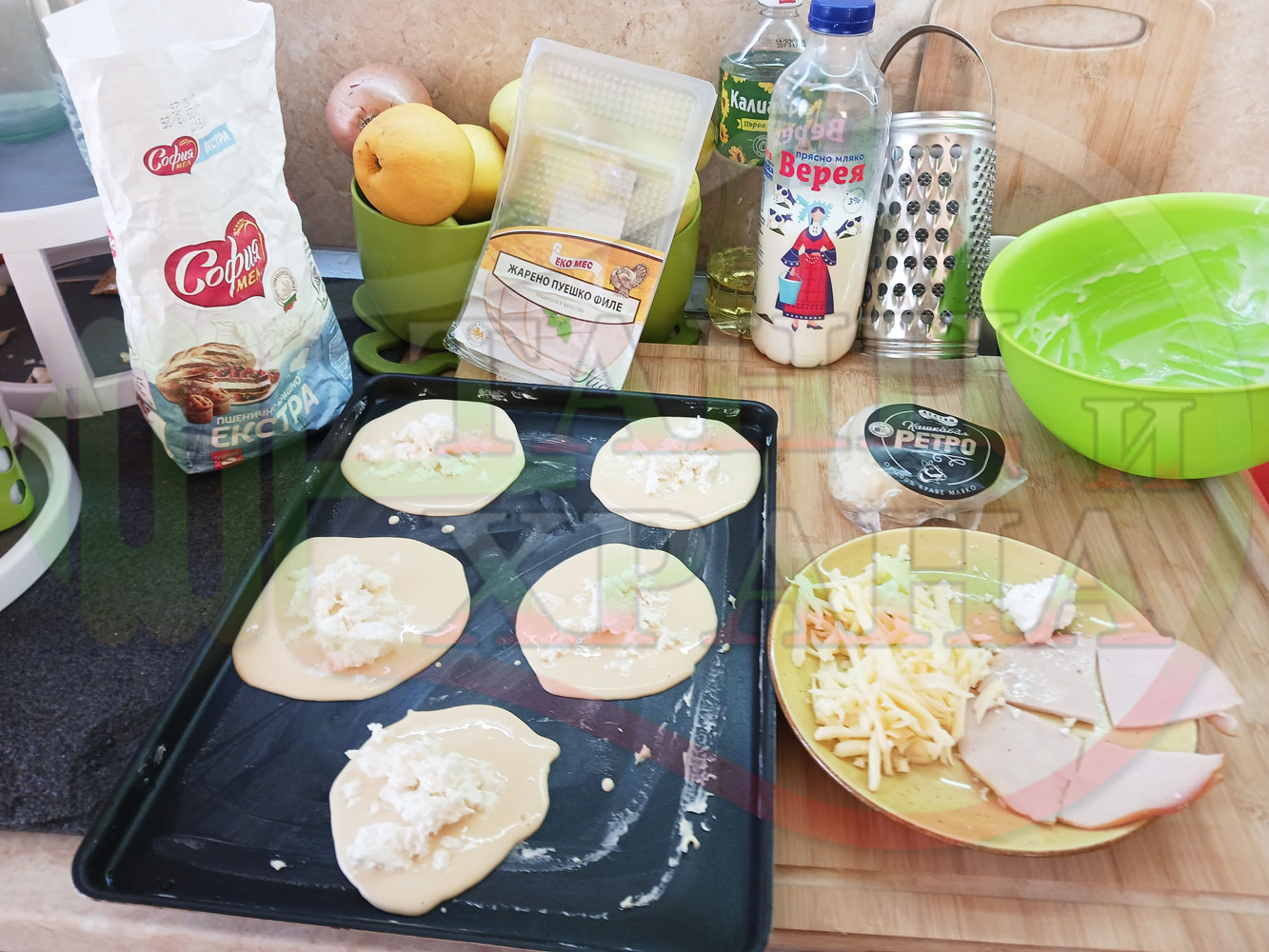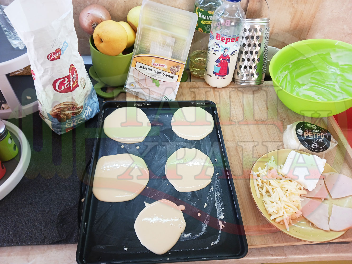 Спретнах необичайни по вид и на вкус палачинки, приготвени с прясно мляко, яйца и брашно, запечени с плънка от българско краве бяло сирене, млечен кашкавал и червен пипер. Към палачинките от едната тава, добавих пуешко жарено филе и макар да ги попрепекох се оказаха изключително вкусни. Ммммм... в кухнята се носи аромат на запечено масло с краве бяло сирене и вкусен, леко хрупкащ кашкавал. Отново се получи невероятна вкусно, вкусна, вкусотия (вкуснотия). ![]()