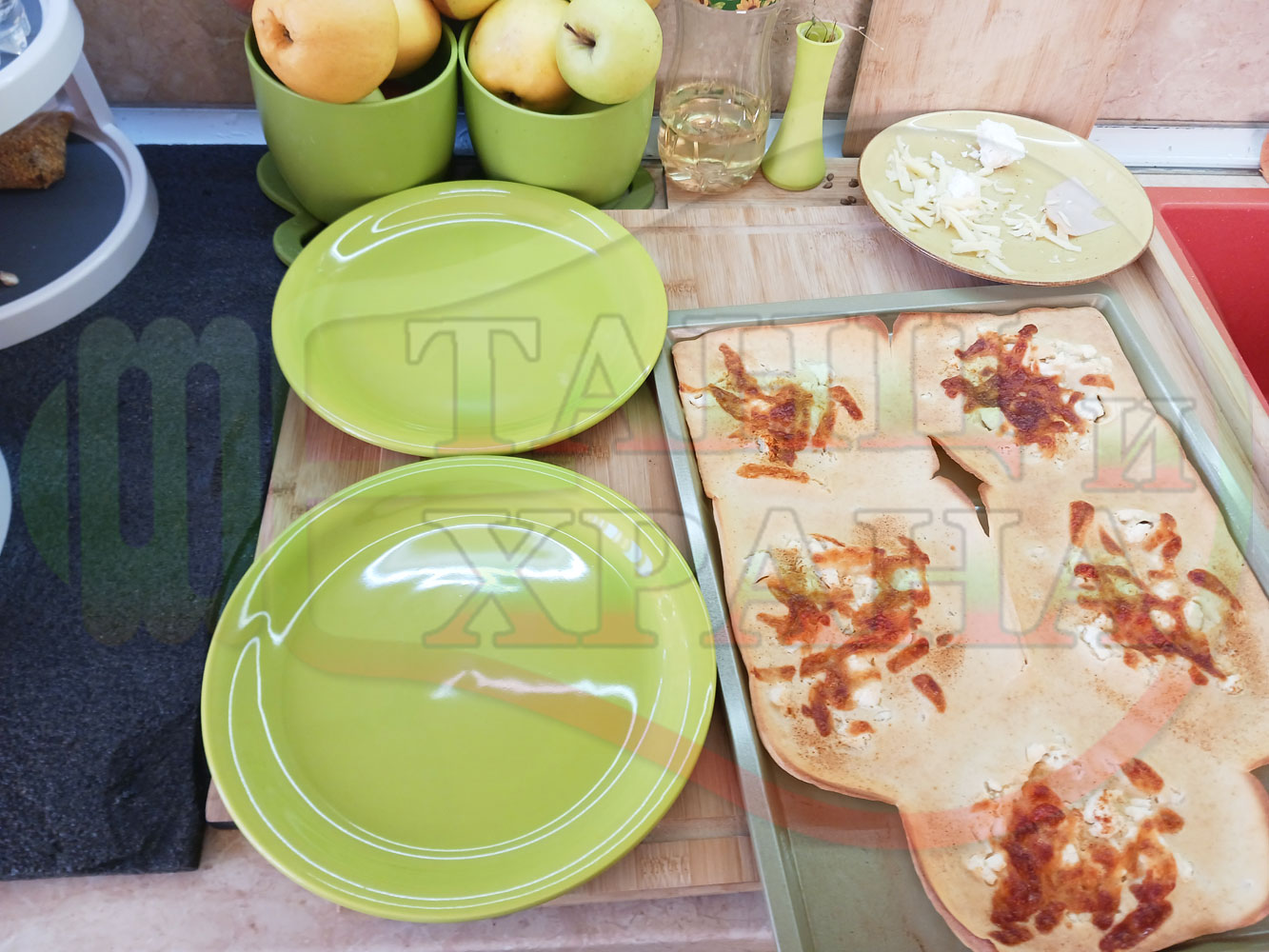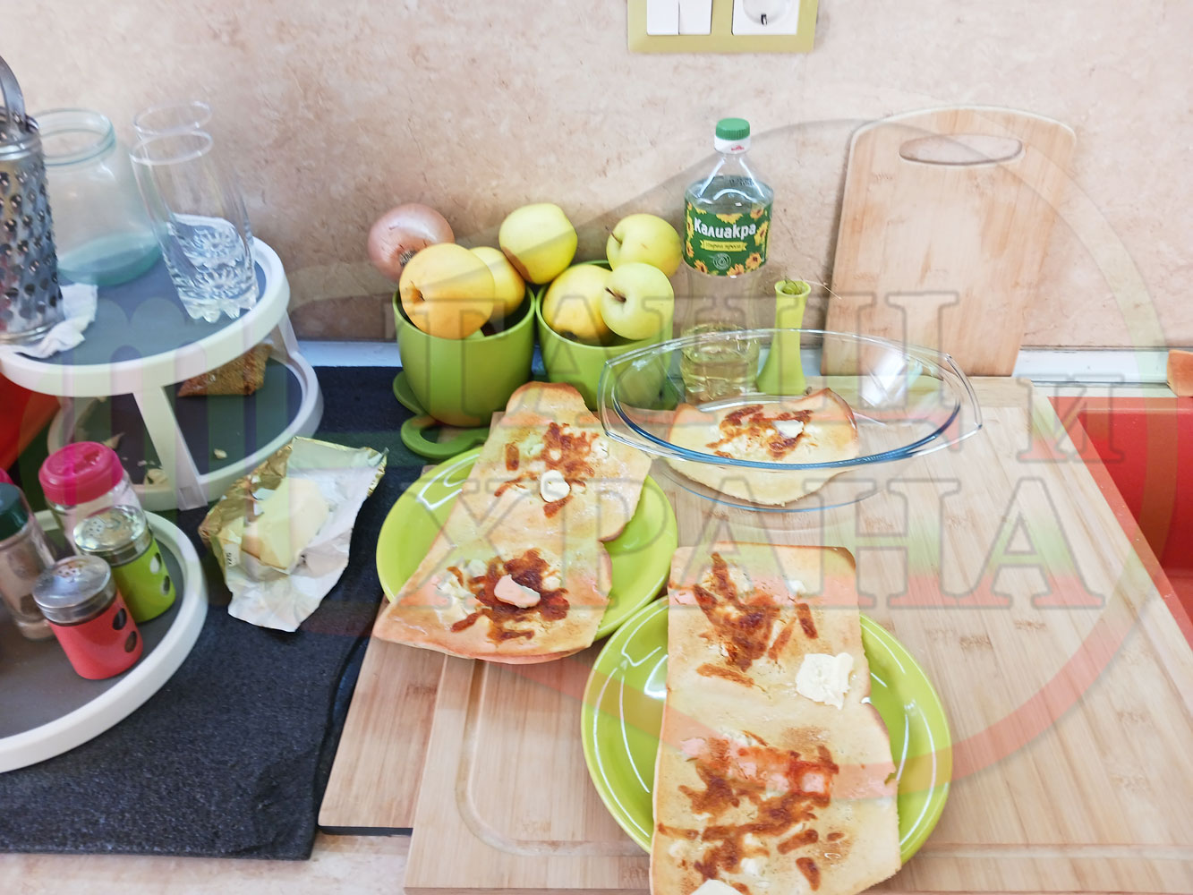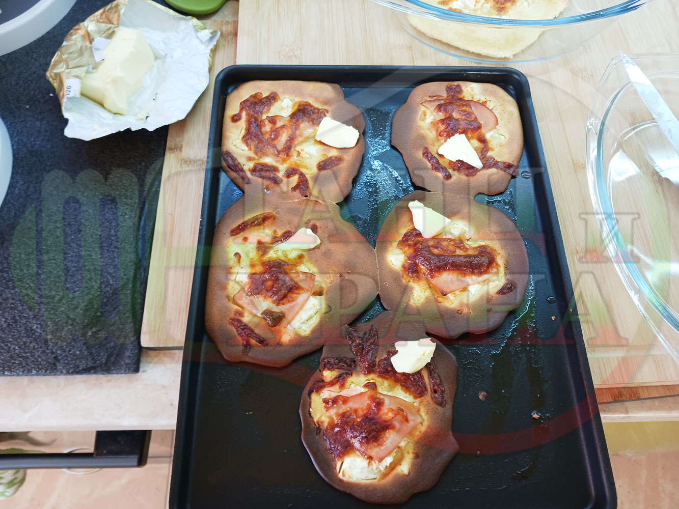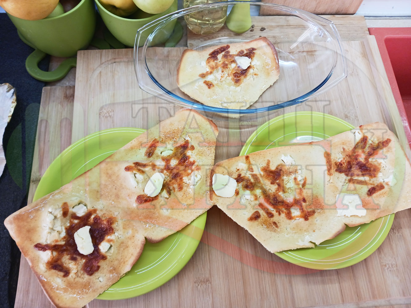 Спретнах необичайни по вид и на вкус палачинки, приготвени с прясно мляко, яйца и брашно, запечени с плънка от българско краве бяло сирене, млечен кашкавал и червен пипер. Към палачинките от едната тава, добавих пуешко жарено филе и макар да ги попрепекох се оказаха изключително вкусни. Ммммм... в кухнята се носи аромат на запечено масло с краве бяло сирене и вкусен, леко хрупкащ кашкавал. Отново се получи невероятна вкусно, вкусна, вкусотия (вкуснотия). ![]()