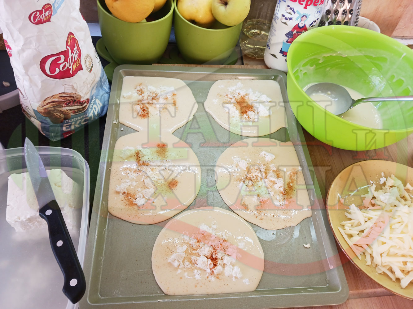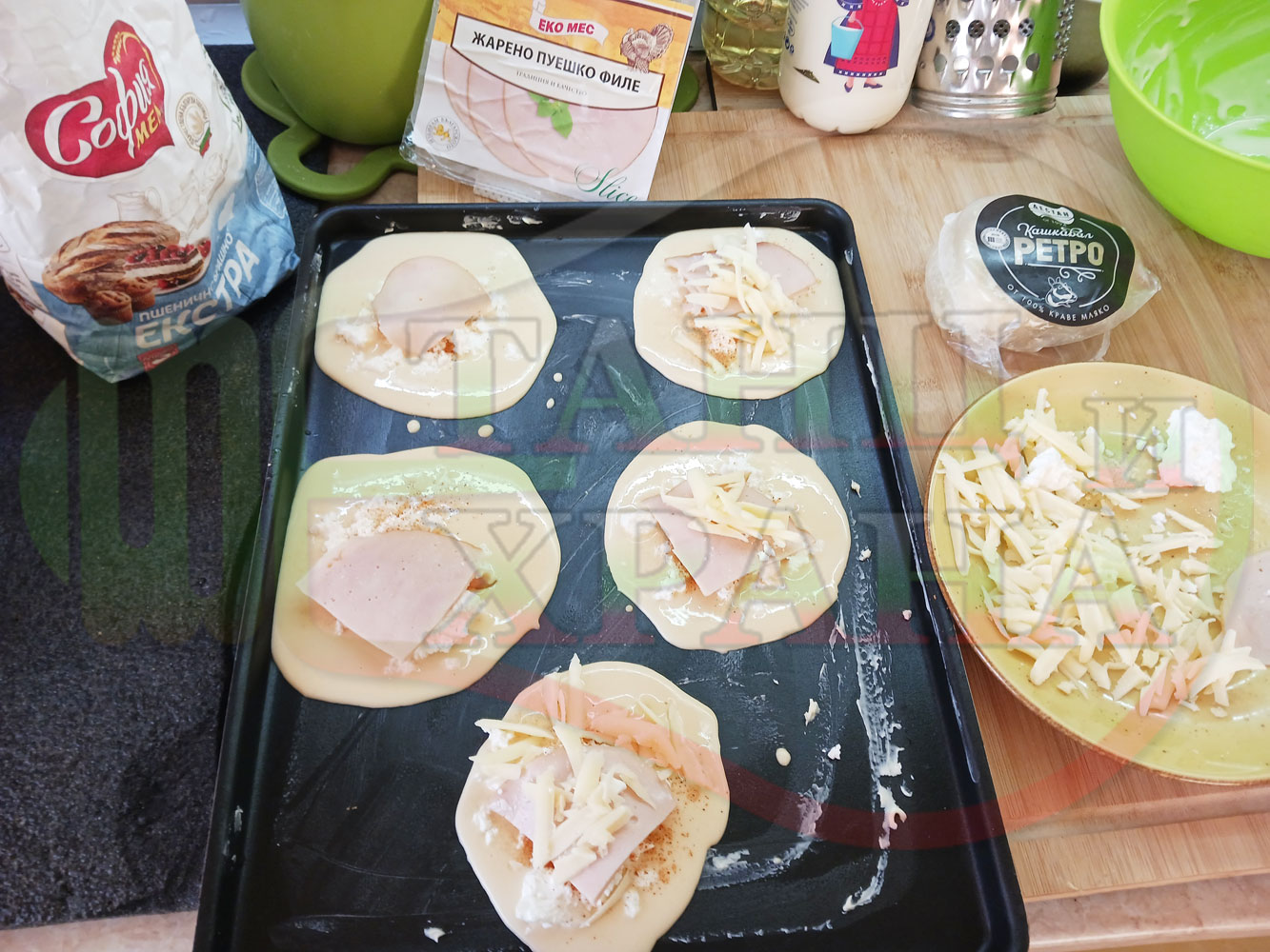 Сипете по няколко черпака от палачинковото тесто в намазана с краве масло тава за печене (имайте предвид, че палачинките се разтичат при запичането им). Надробете част от сиренето върху всяка палачинка, поръсете с червения сладък пипер и разпределете равномерно настъргания на едро кашкавал. Процедирайте по същия начин с палачинките от втората тава и добавете пуешко жарено филе, нарязано на средно големи парчета под кашкавала (подредете слоевете от плънката по ваше желание и усмотрение). Поставете тавите в предварително загрятата фурна (загрейте я за поне 5 минути). Запечете на фурна без вентилатор на 180 градуса за около 20 минути.