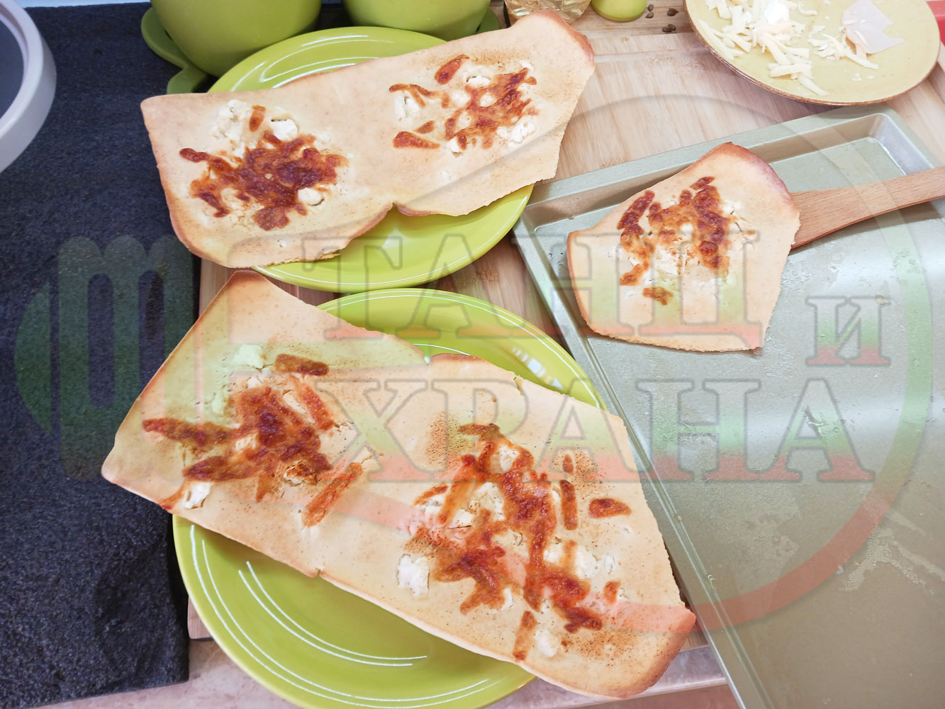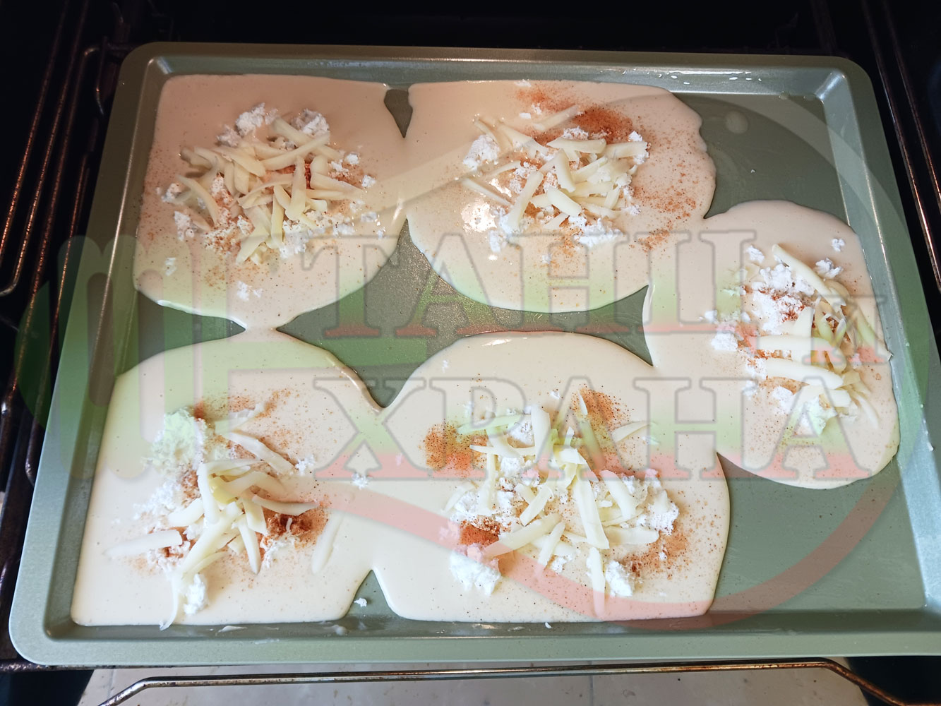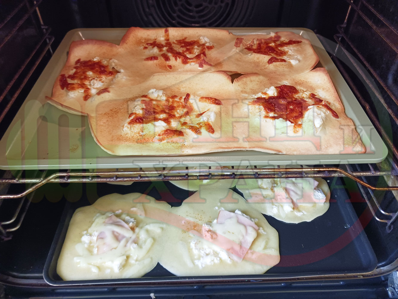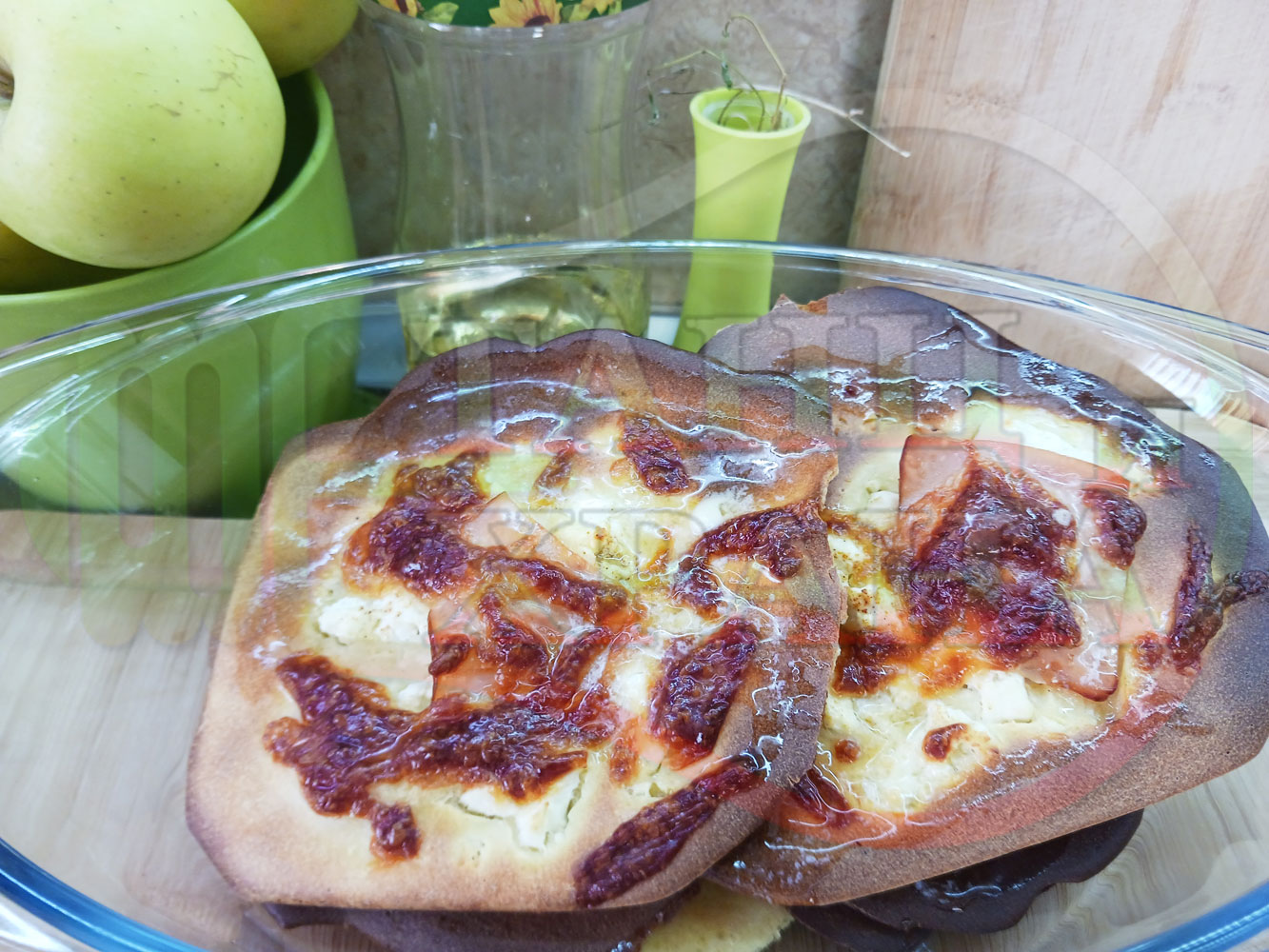 Двузапечени палачинки "Пуешкокашкавалени прясномлечни с БГсирене" запечени на фурна с краве бяло сирене (българско, саламурено), млечен кашкавал, червен сладък пипер и пуешко жарено филе намазани с краве масло омесени с яйца и прясно мляко