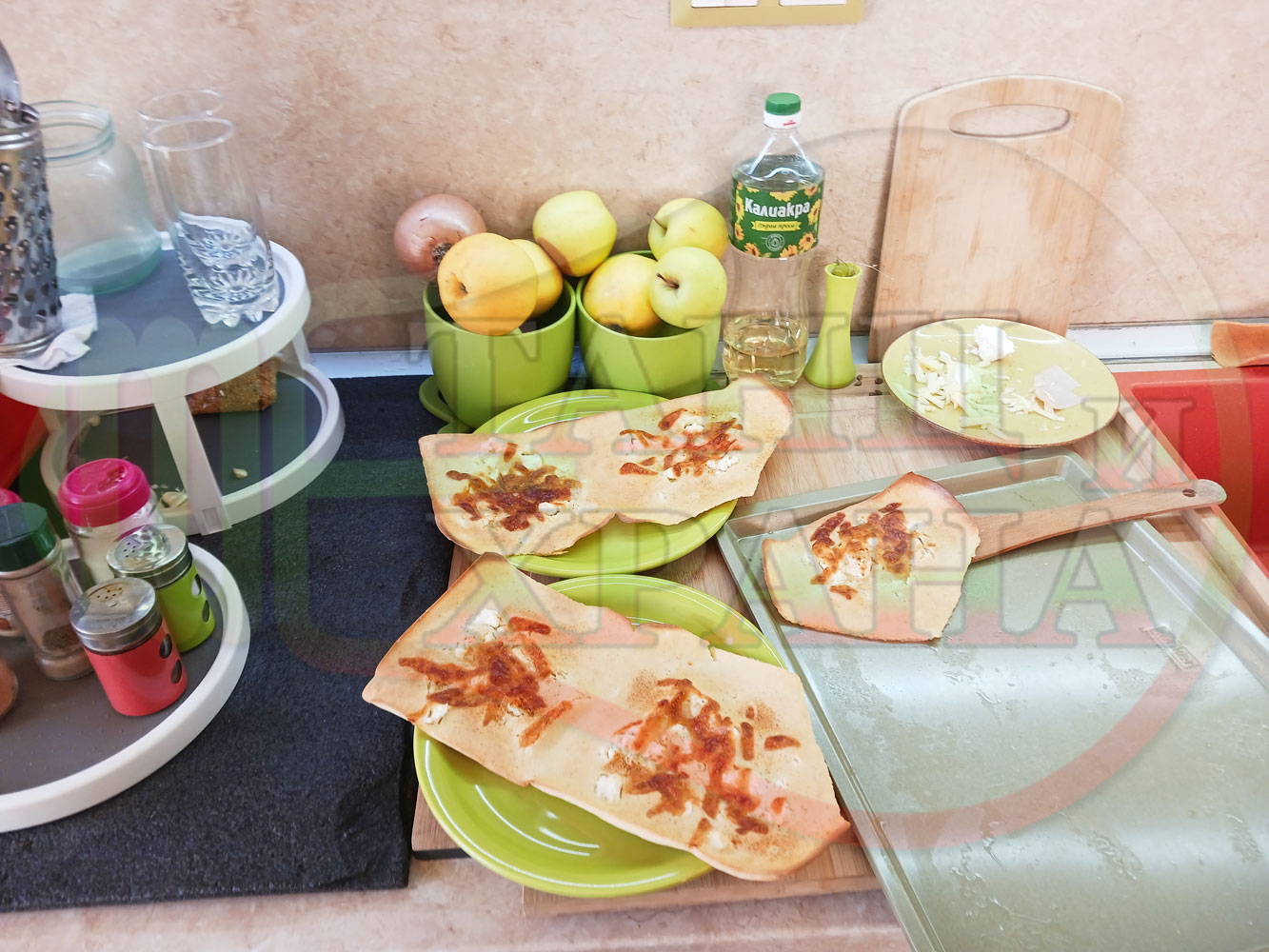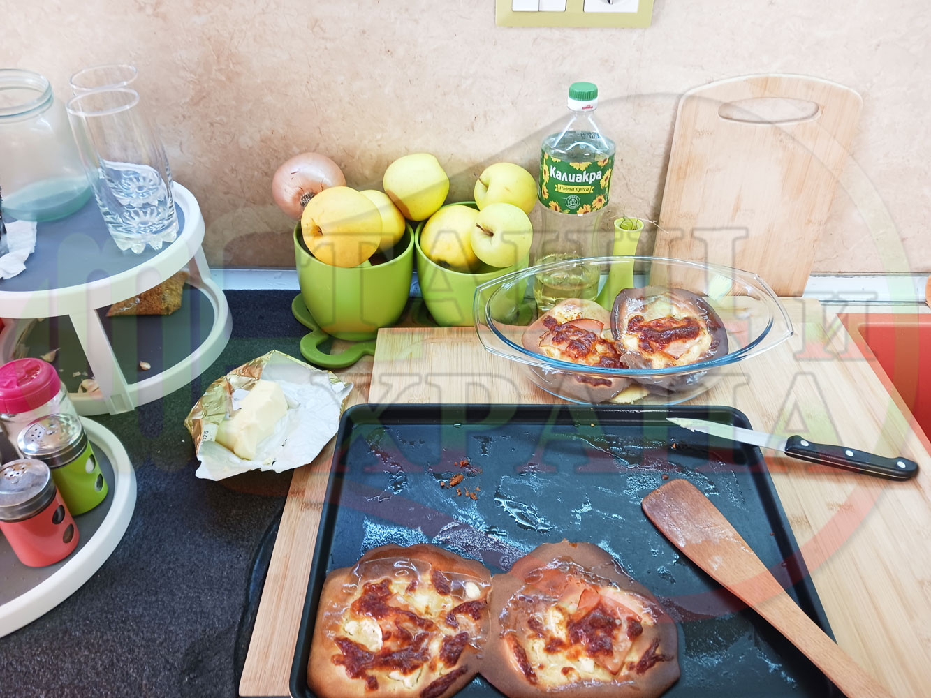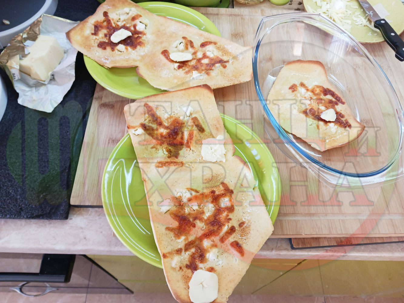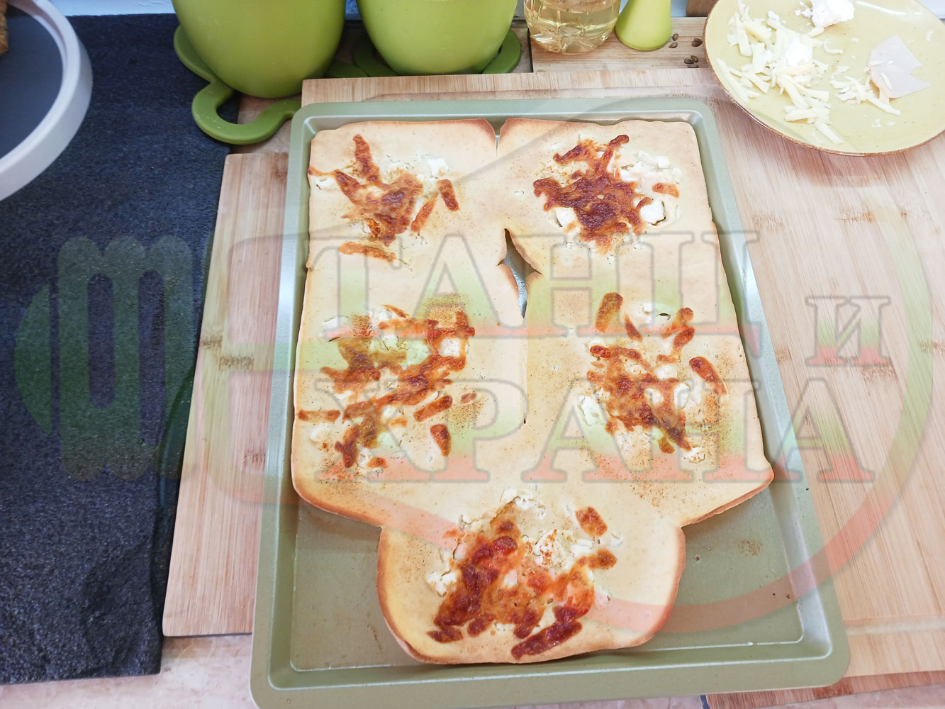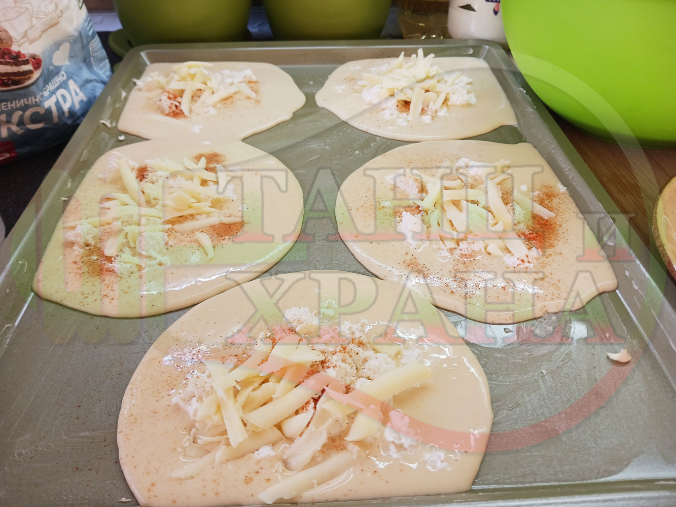 Двузапечени палачинки "Пуешкокашкавалени прясномлечни с БГсирене" запечени на фурна с краве бяло сирене (българско, саламурено), млечен кашкавал, червен сладък пипер и пуешко жарено филе намазани с краве масло омесени с яйца и прясно мляко