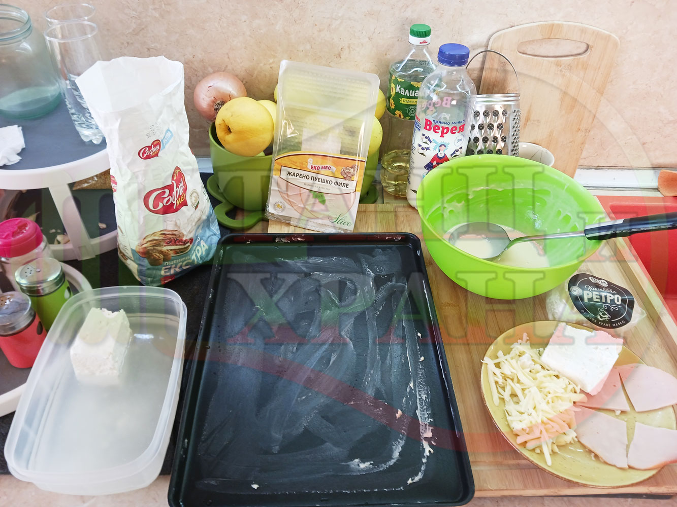 ПРОДУКТИ: Приблизителни количества за двузапечени палачинки "Пуешкокашкавалени прясномлечни с БГсирене" запечени на фурна с краве бяло сирене (българско, саламурено), млечен кашкавал, червен сладък пипер и пуешко жарено филе намазани с краве масло омесени с яйца и прясно мляко