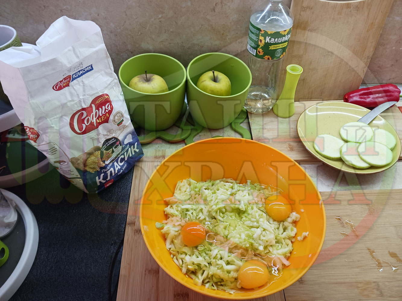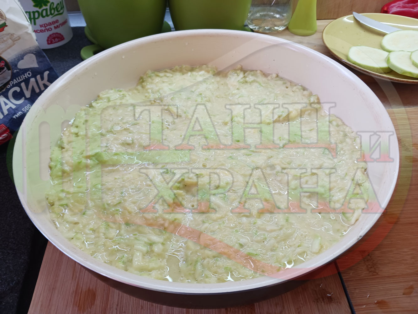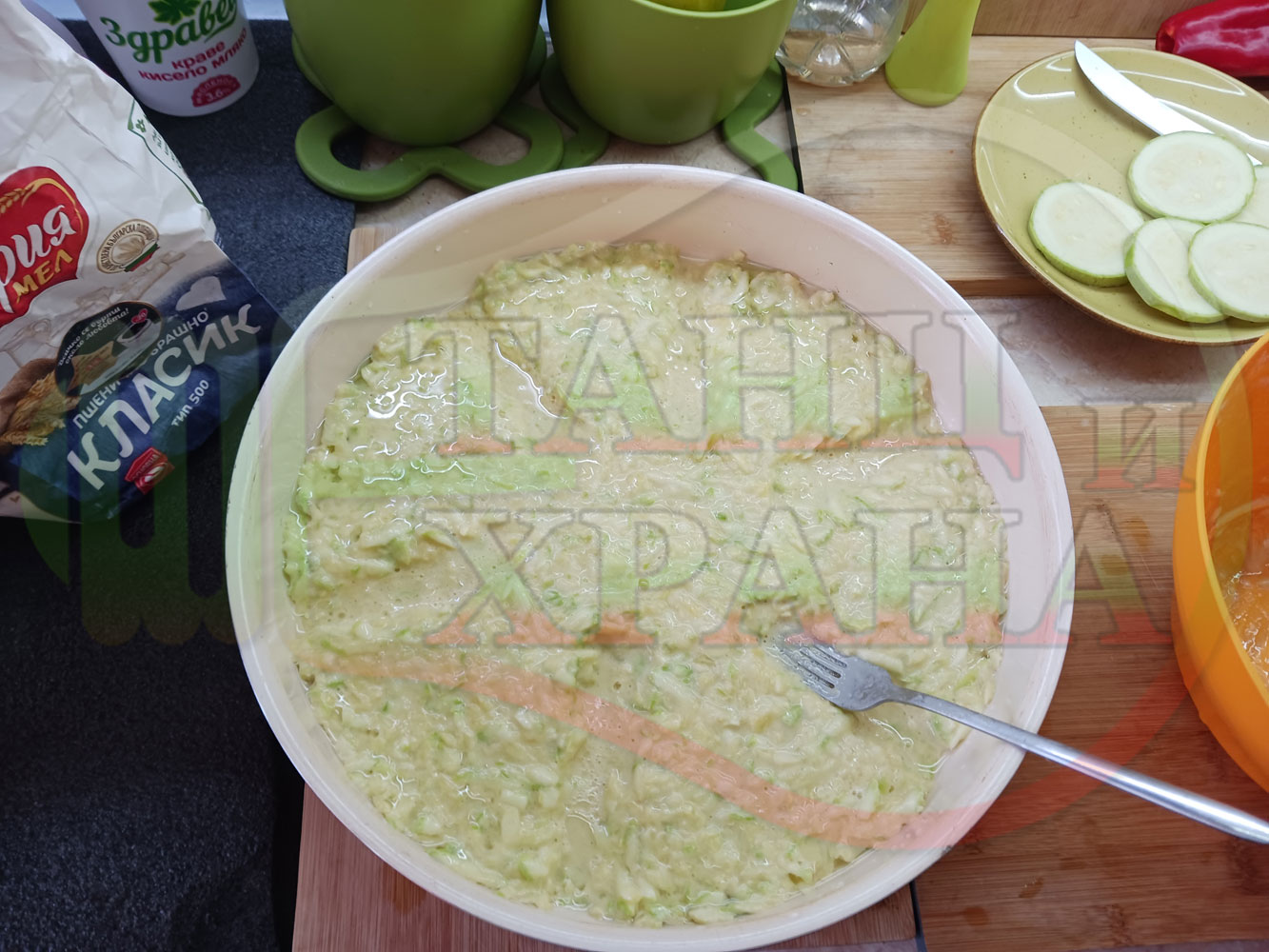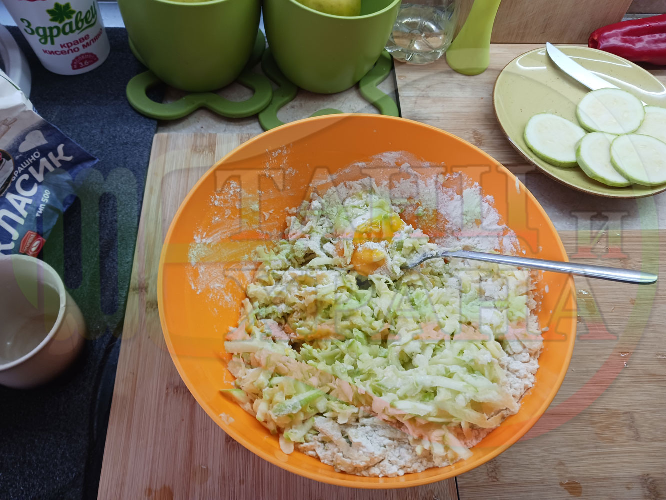 Измийте тиквичките, почистете ги от нараняванията, дръжките и предната твърда част и ги настържете на едро в купа (нарежете част от тиквичките на кръгчета за украса). Добавете яйцата, брашното, захарта и солта и разбъркайте и намачкайте с вилица до получаване на средно гъста тиквичково яйчена, хомогенизирана смес с брашно (увеличете количеството на брашното, в случай че тиквичките са с по-голямо водно съдържание).