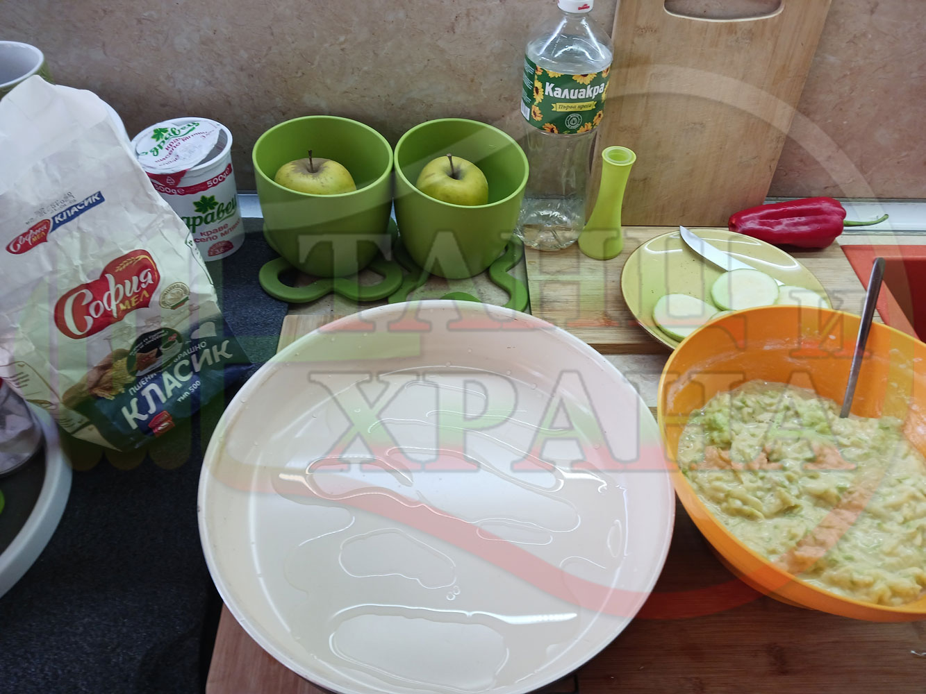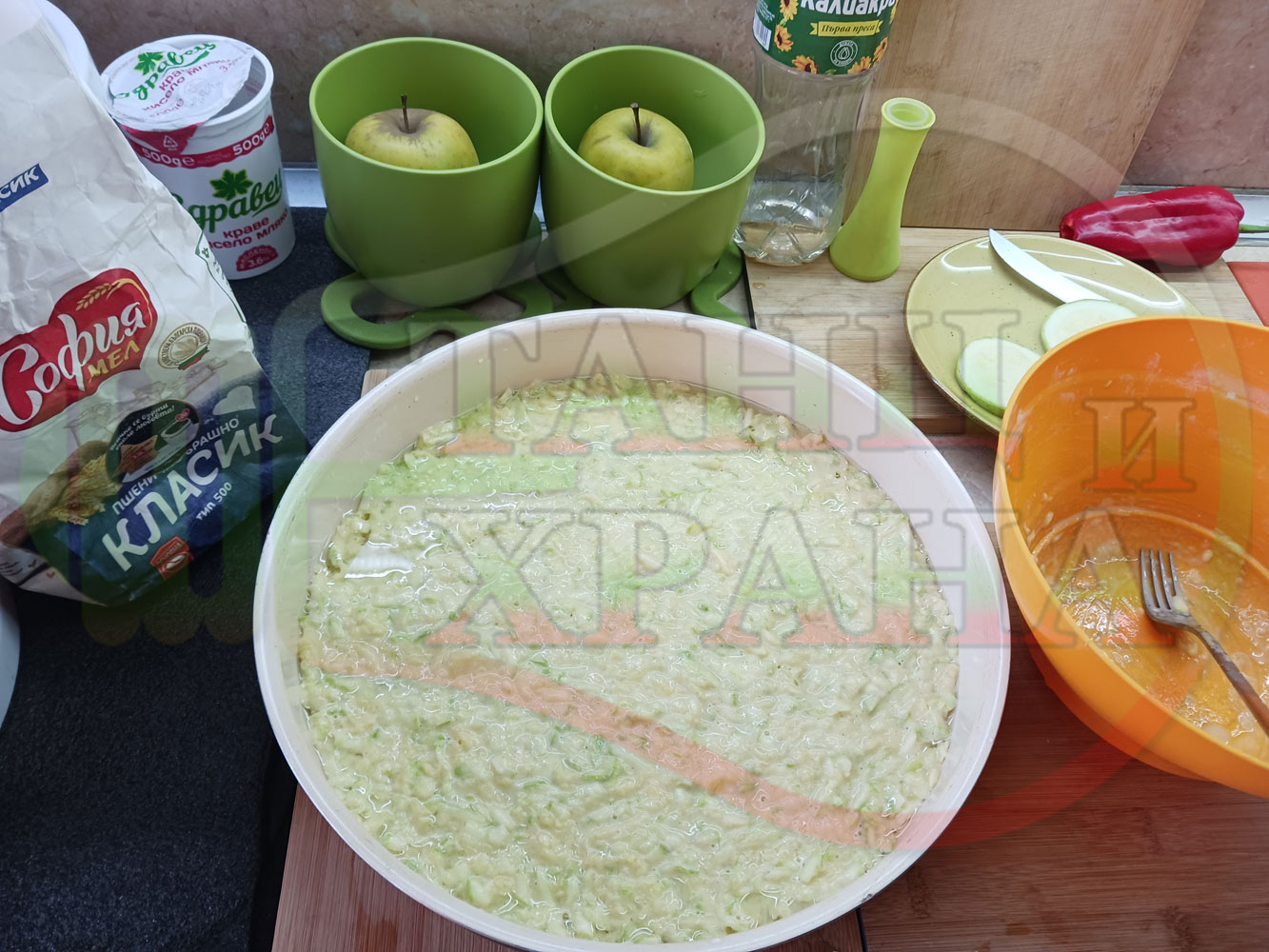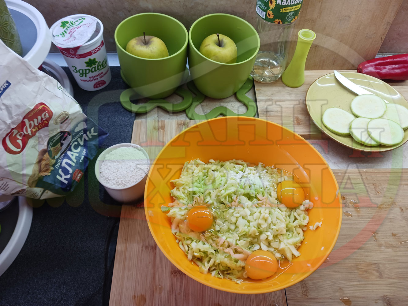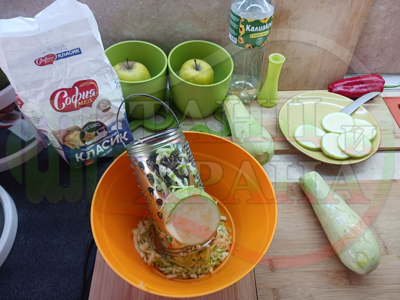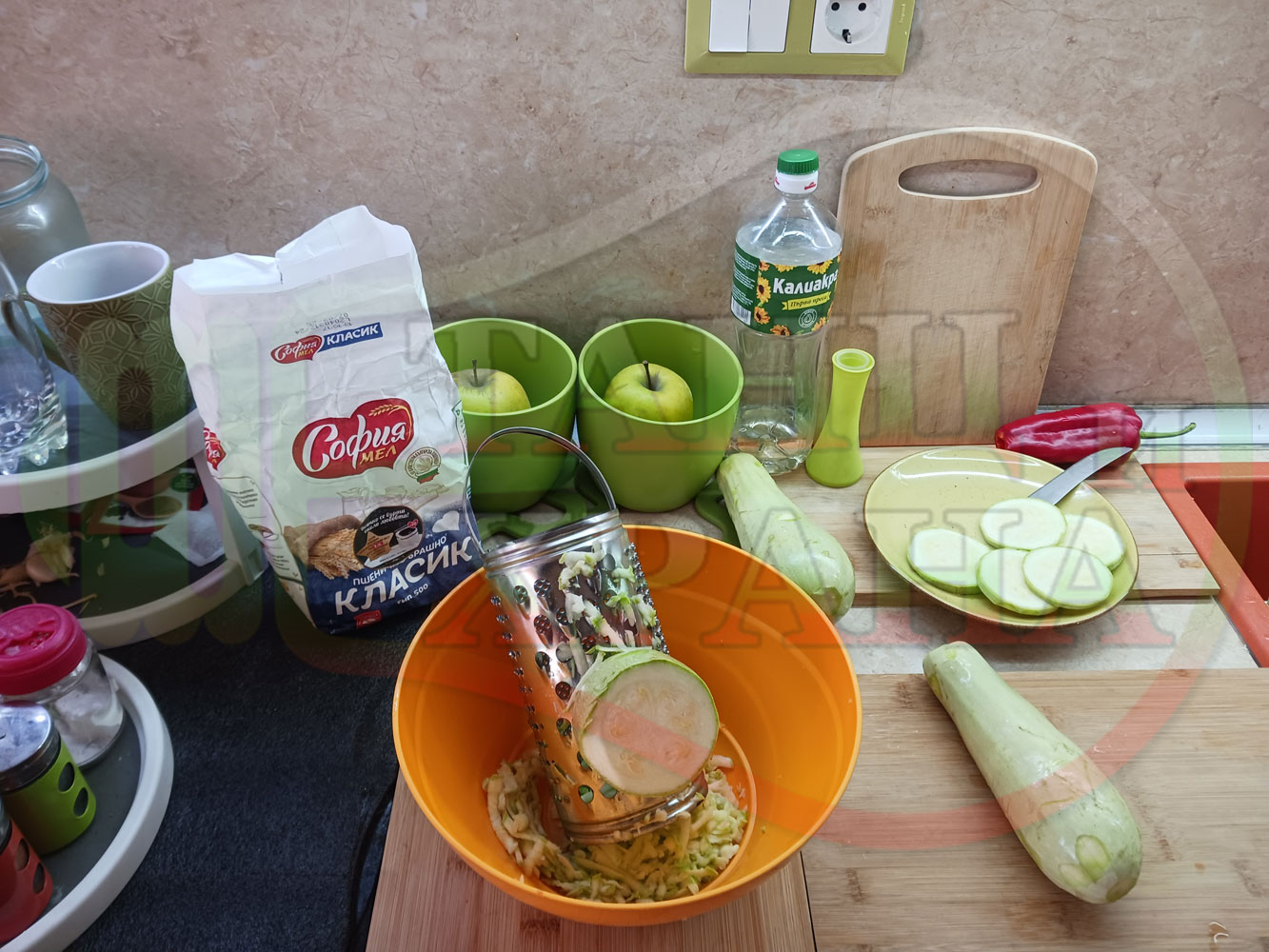 Измийте тиквичките, почистете ги от нараняванията, дръжките и предната твърда част и ги настържете на едро в купа (нарежете част от тиквичките на кръгчета за украса). Добавете яйцата, брашното, захарта и солта и разбъркайте и намачкайте с вилица до получаване на средно гъста тиквичково яйчена, хомогенизирана смес с брашно (увеличете количеството на брашното, в случай че тиквичките са с по-голямо водно съдържание).