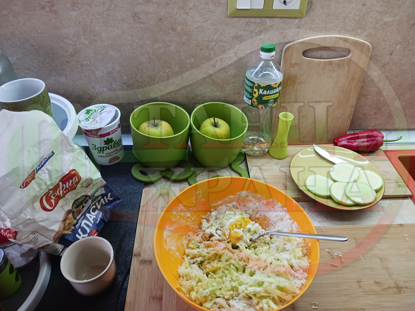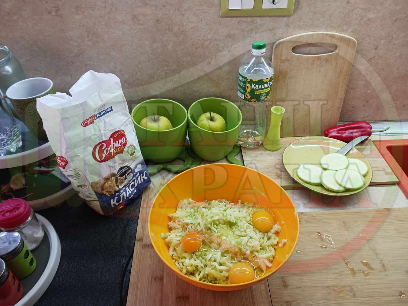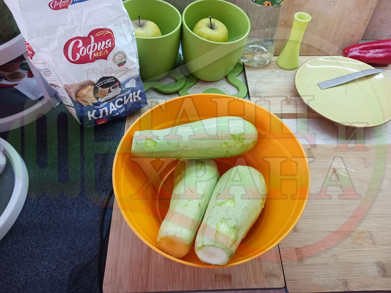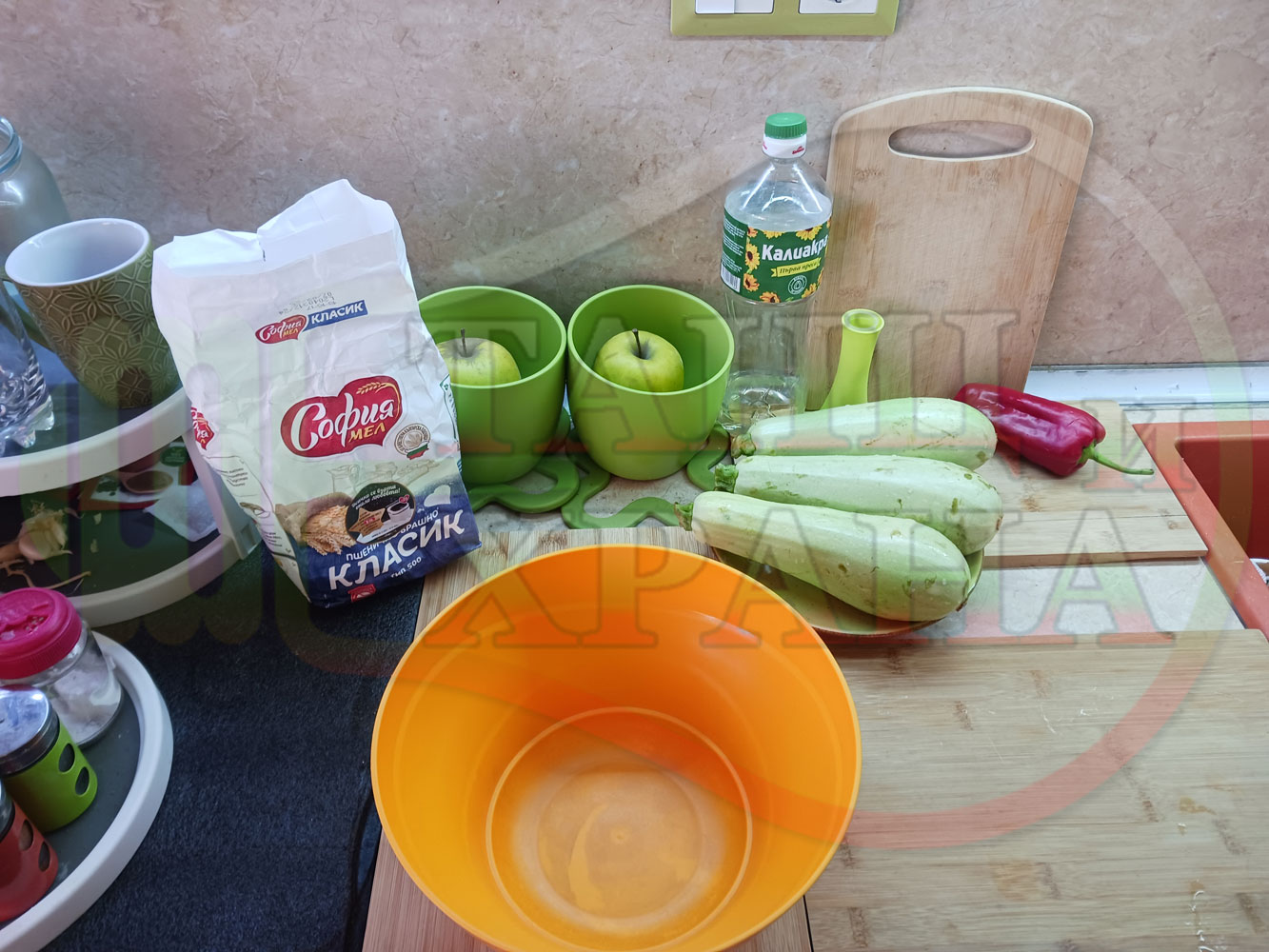 Измийте тиквичките, почистете ги от нараняванията, дръжките и предната твърда част и ги настържете на едро в купа (нарежете част от тиквичките на кръгчета за украса). Добавете яйцата, брашното, захарта и солта и разбъркайте и намачкайте с вилица до получаване на средно гъста тиквичково яйчена, хомогенизирана смес с брашно (увеличете количеството на брашното, в случай че тиквичките са с по-голямо водно съдържание).