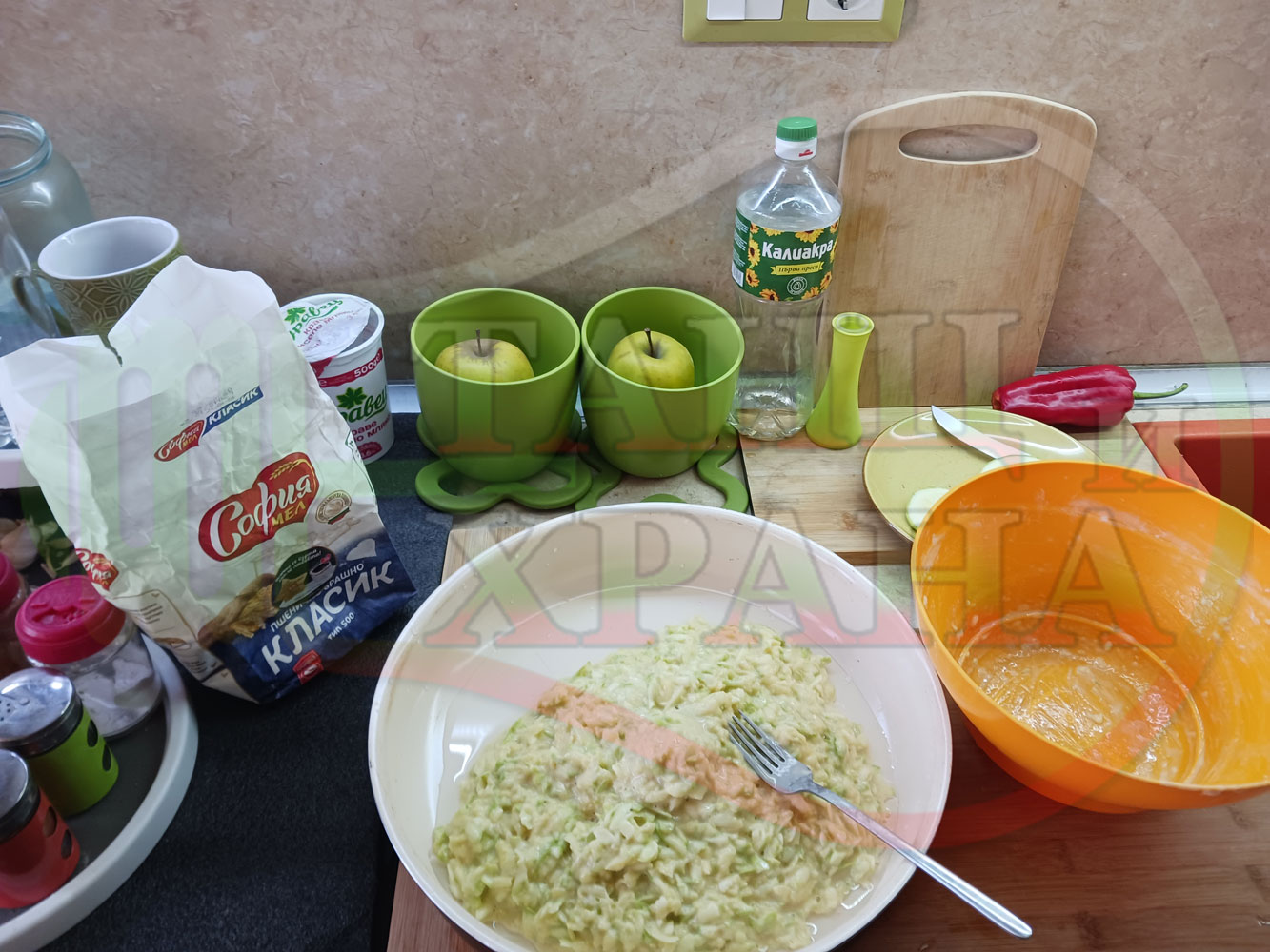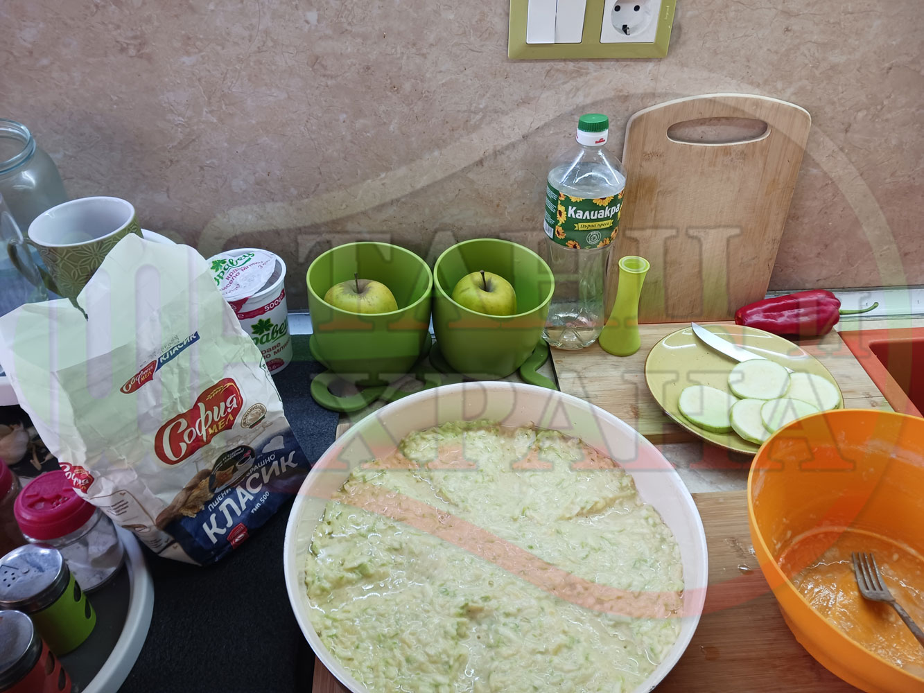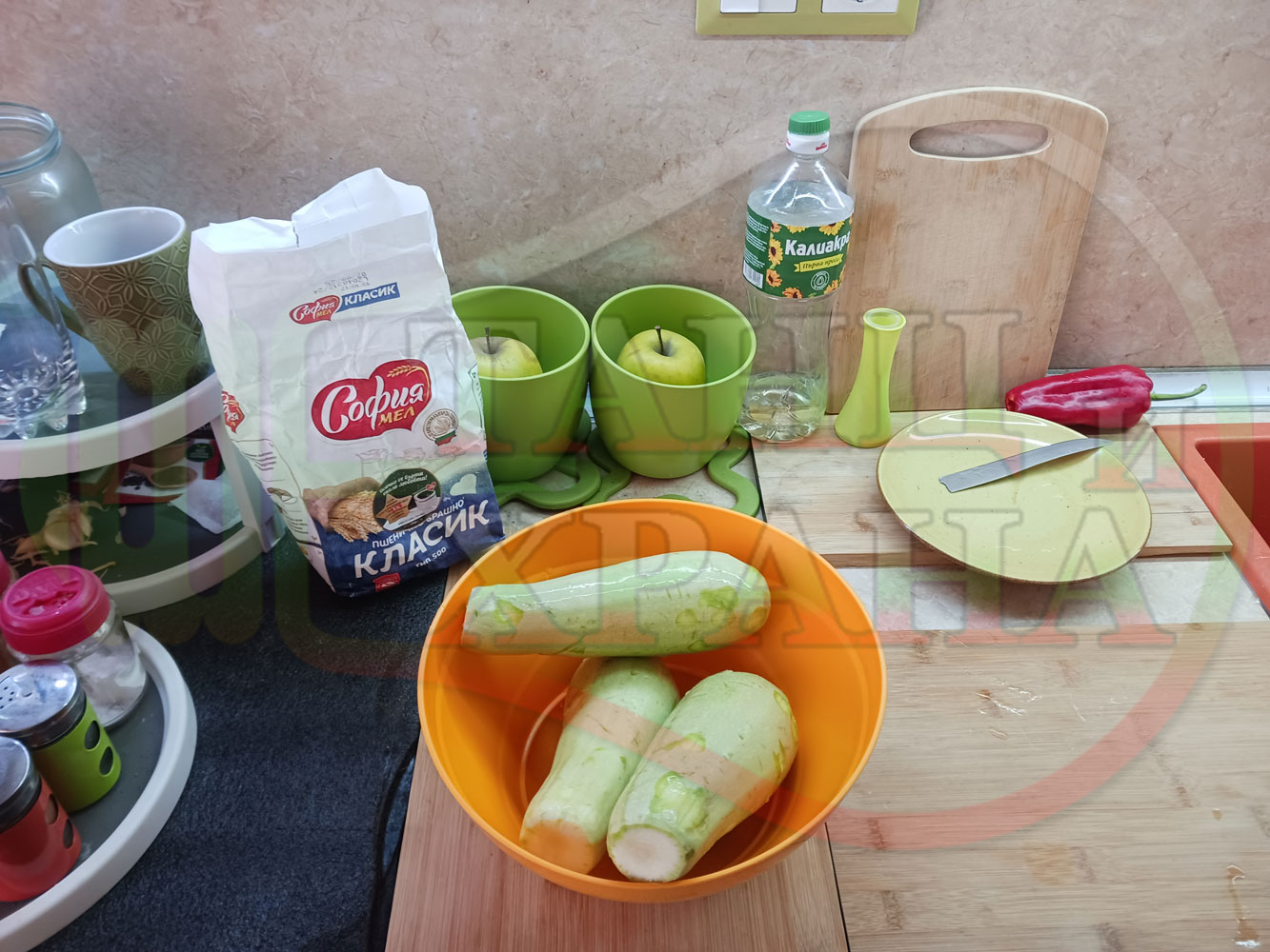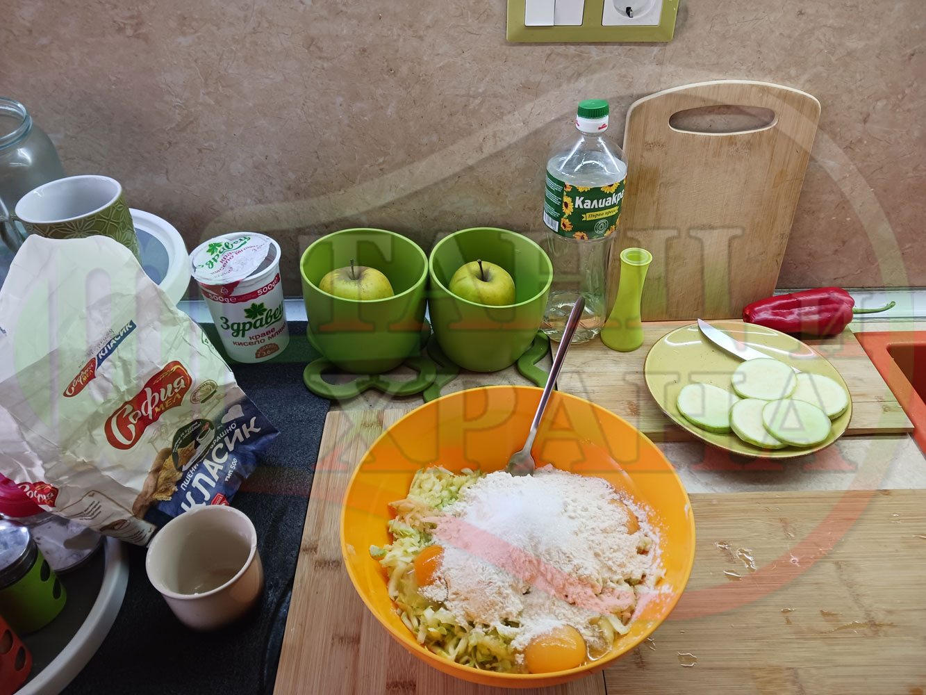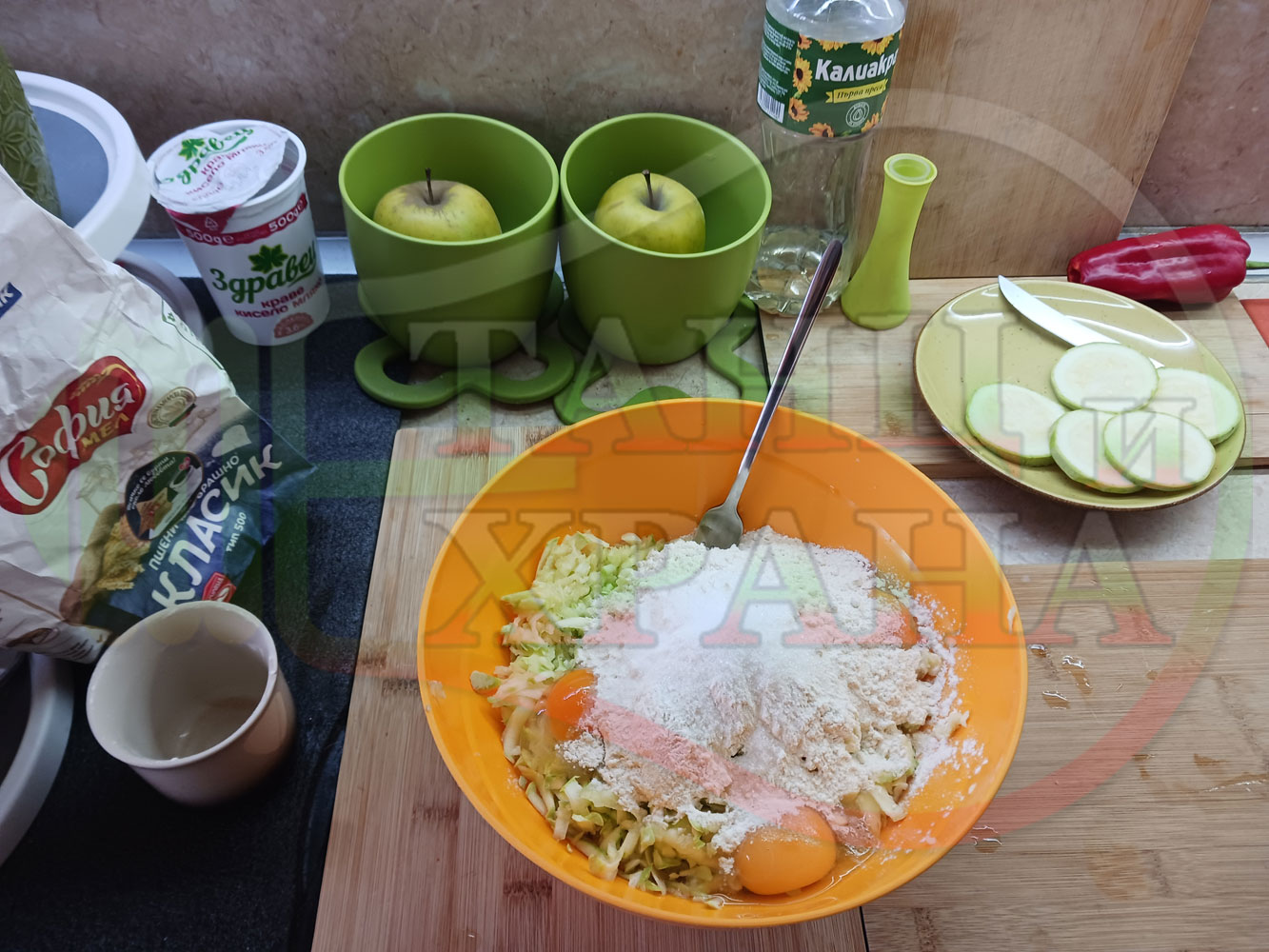 Измийте тиквичките, почистете ги от нараняванията, дръжките и предната твърда част и ги настържете на едро в купа (нарежете част от тиквичките на кръгчета за украса). Добавете яйцата, брашното, захарта и солта и разбъркайте и намачкайте с вилица до получаване на средно гъста тиквичково яйчена, хомогенизирана смес с брашно (увеличете количеството на брашното, в случай че тиквичките са с по-голямо водно съдържание).