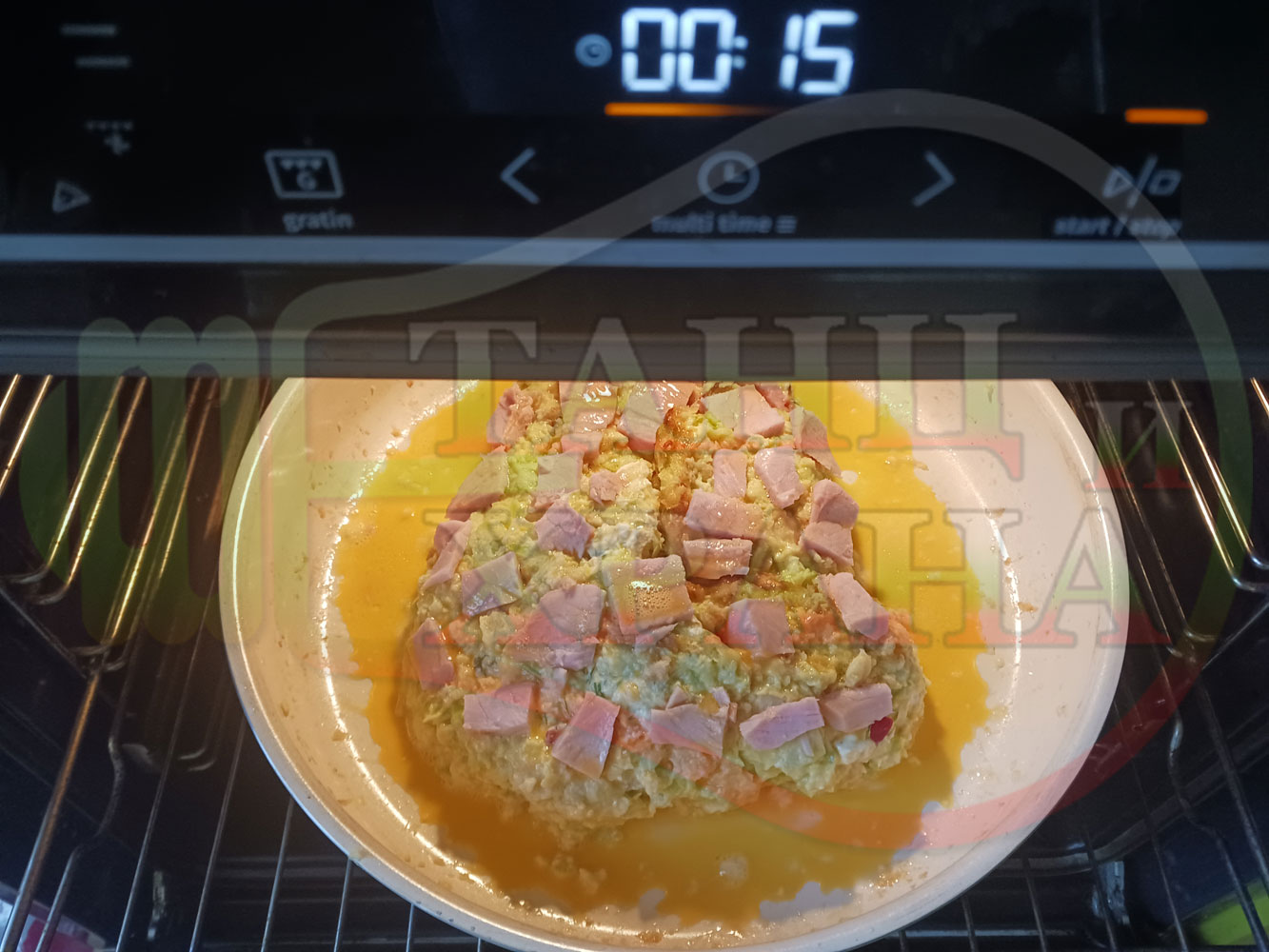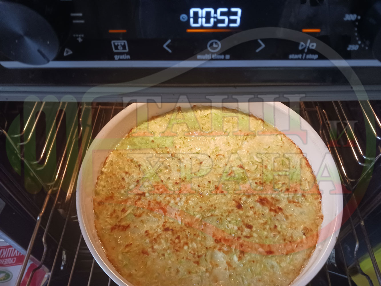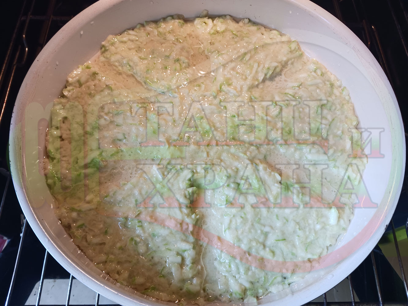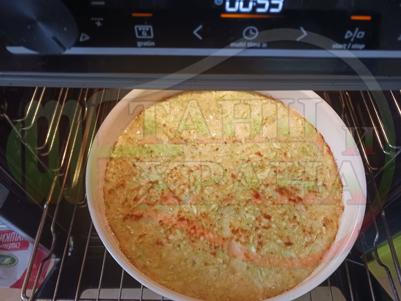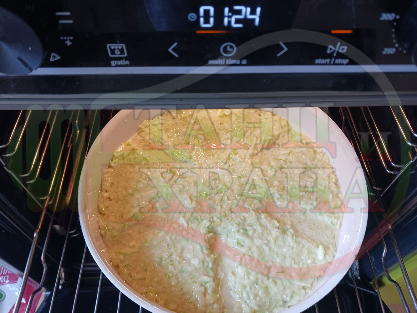 Изсипете тиквичковата смес в намазана със слънчогледово олио тава за печене и я заравнете (и/или оформете фигури с вилицата). Поставете тавата в предварително загрятата фурна (загрейте я за поне 5 минути). Запечете на фурна без вентилатор на 180 градуса за около 60 минути.