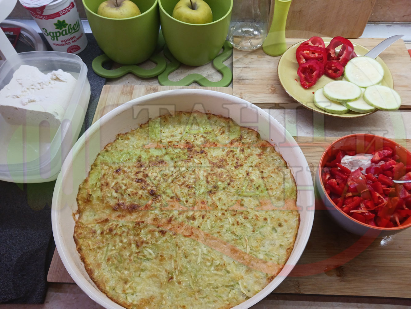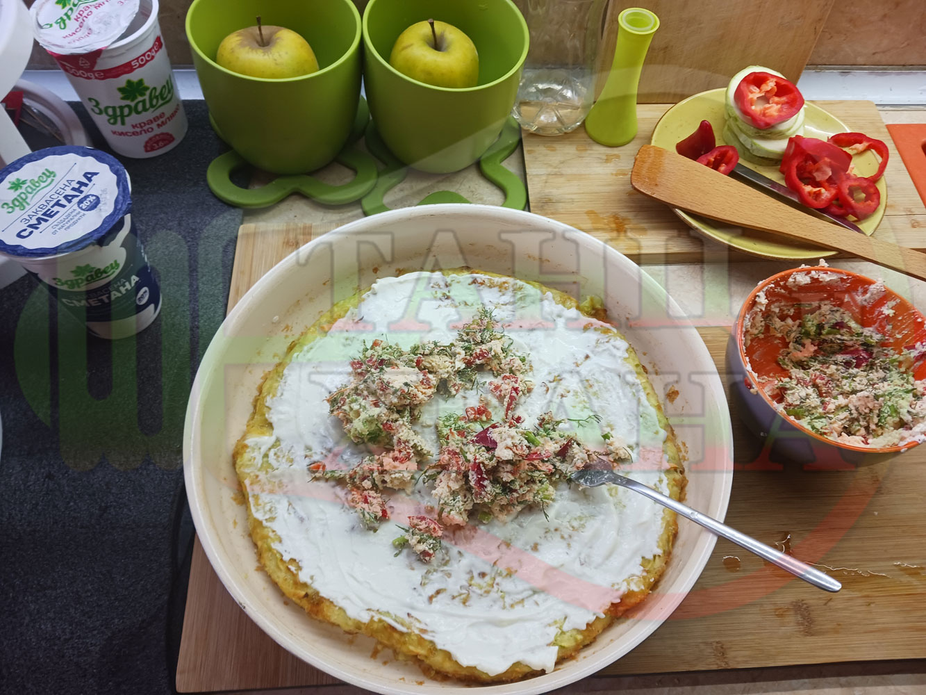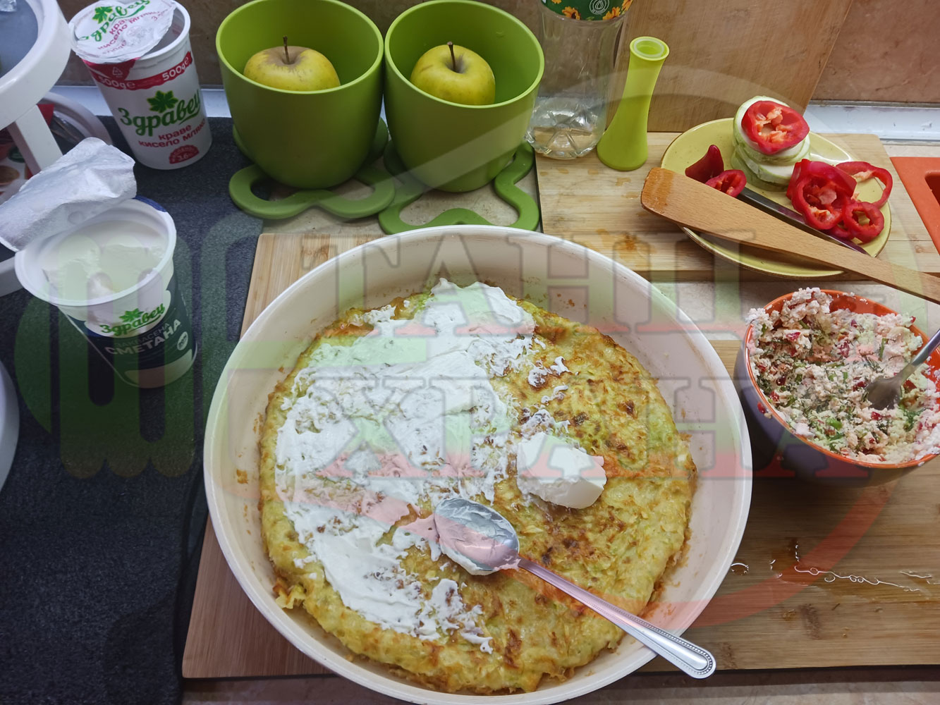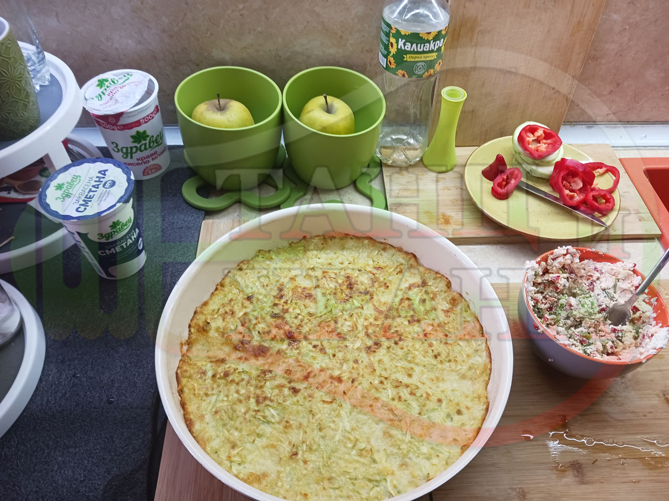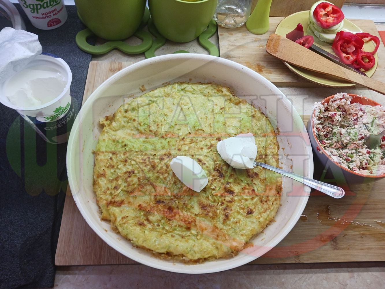 Тиквичкова сметанова пита "Тиквичковопиперкова копърова филежаренова с БГсирене" изпечена на фурна с пресни тиквички, яйца и жарено филе гарнирана със заквасена сметана и сиренов крем от червени пресни чушки, копър, чесън и краве бяло сирене