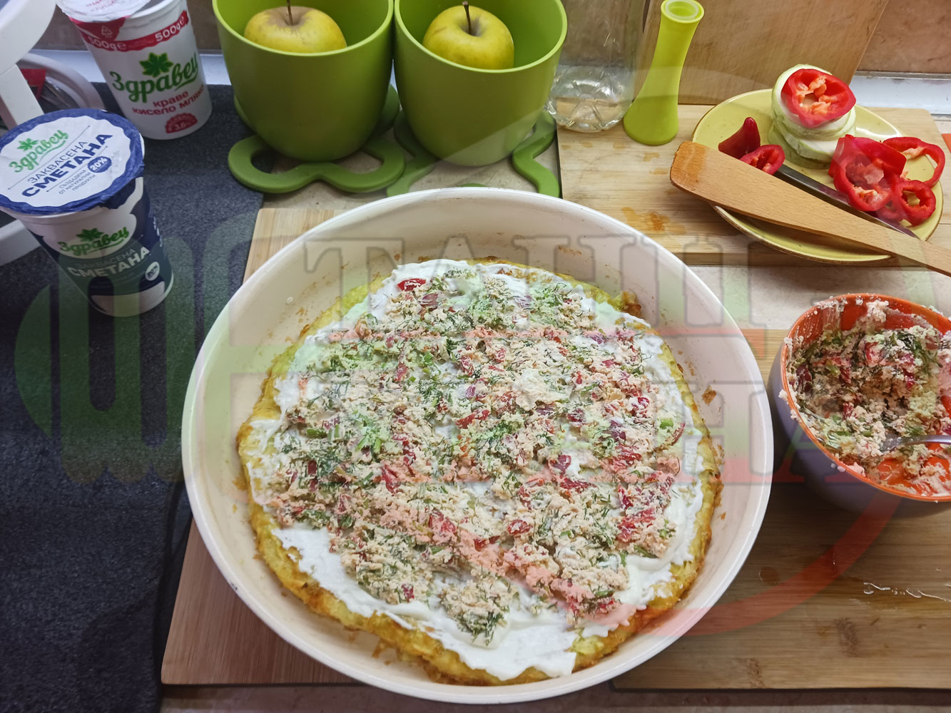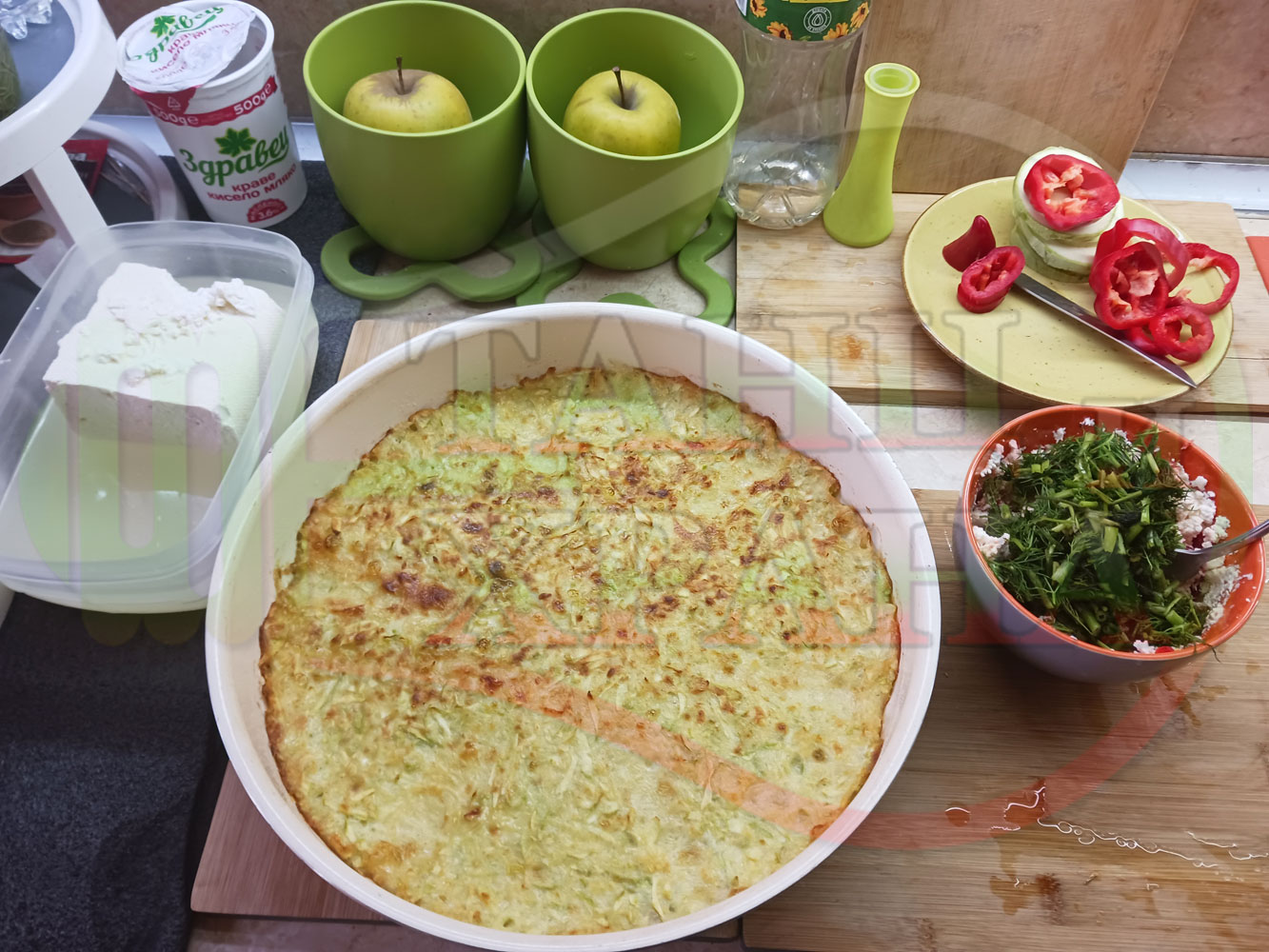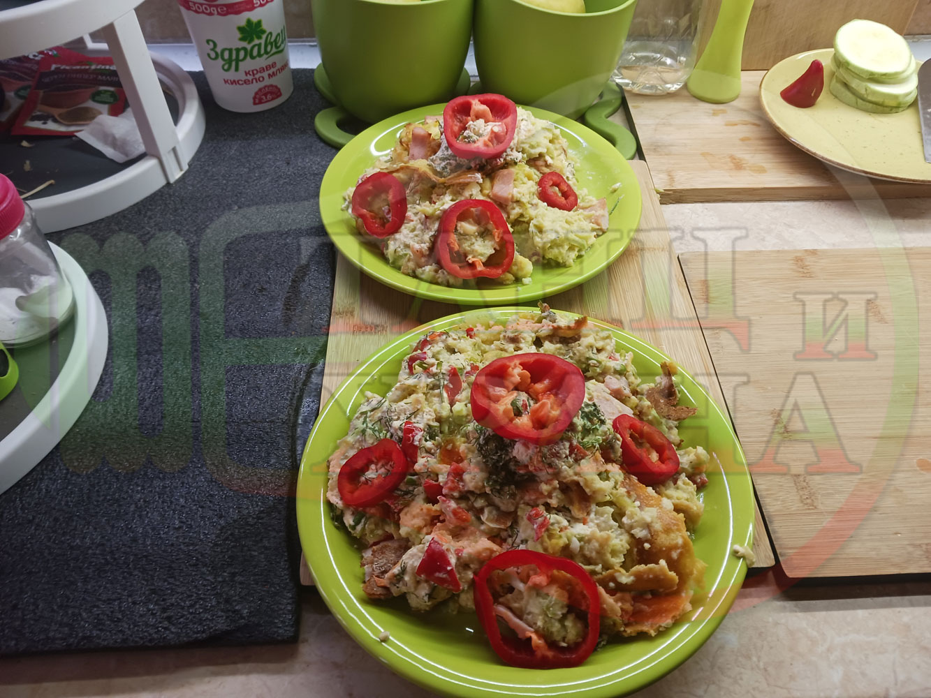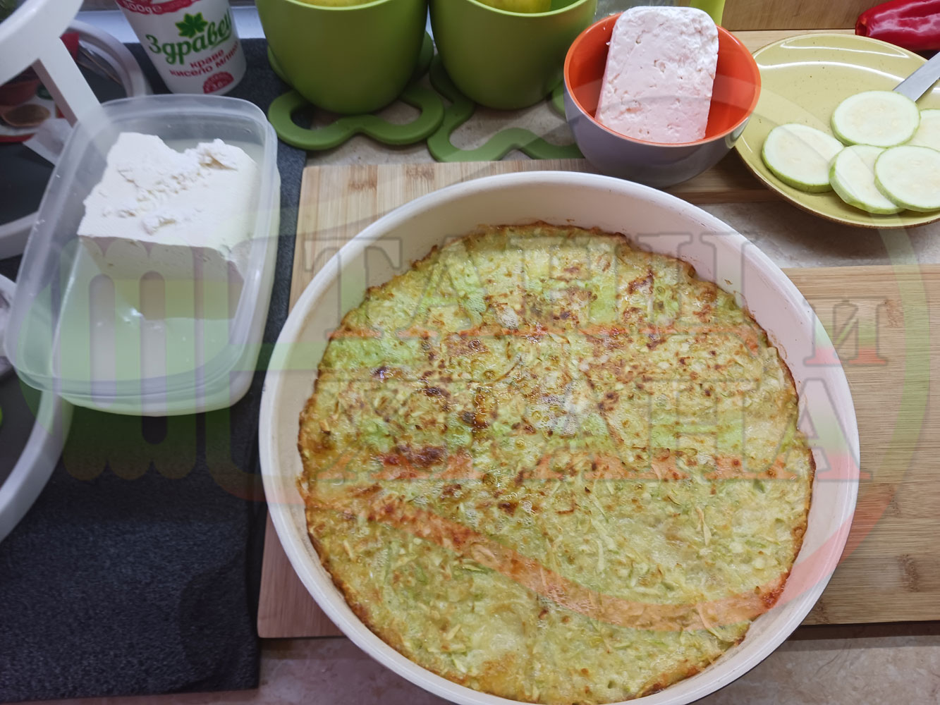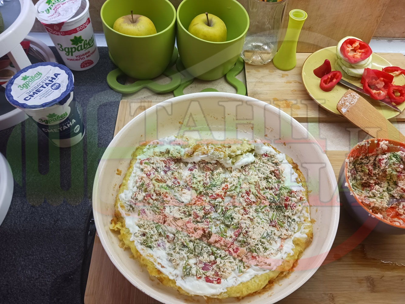 Тиквичкова сметанова пита "Тиквичковопиперкова копърова филежаренова с БГсирене" изпечена на фурна с пресни тиквички, яйца и жарено филе гарнирана със заквасена сметана и сиренов крем от червени пресни чушки, копър, чесън и краве бяло сирене