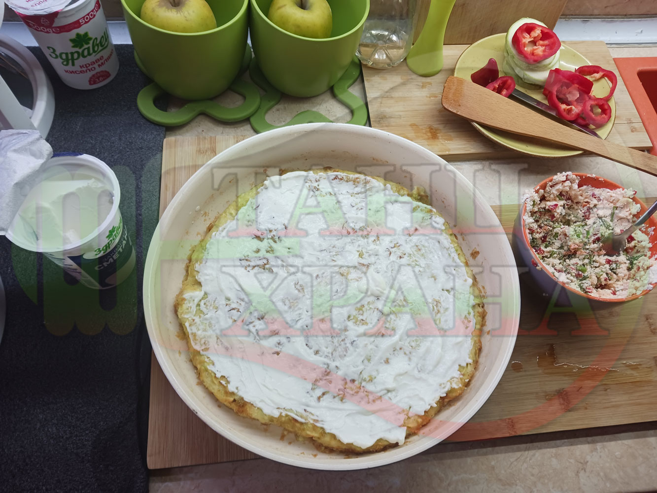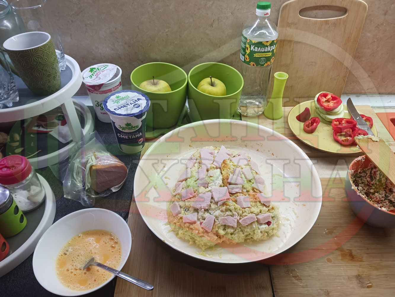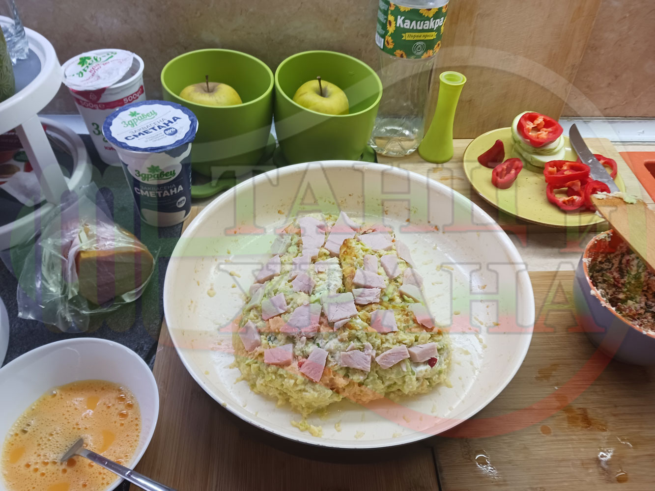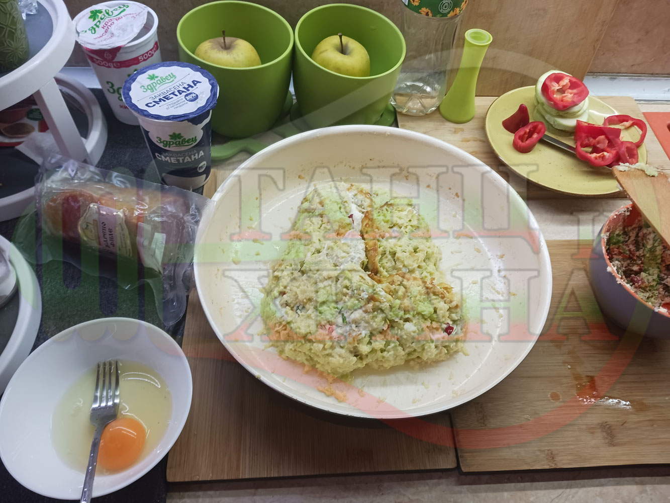 Тиквичкова сметанова пита "Тиквичковопиперкова копърова филежаренова с БГсирене" изпечена на фурна с пресни тиквички, яйца и жарено филе гарнирана със заквасена сметана и сиренов крем от червени пресни чушки, копър, чесън и краве бяло сирене