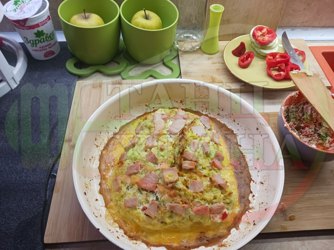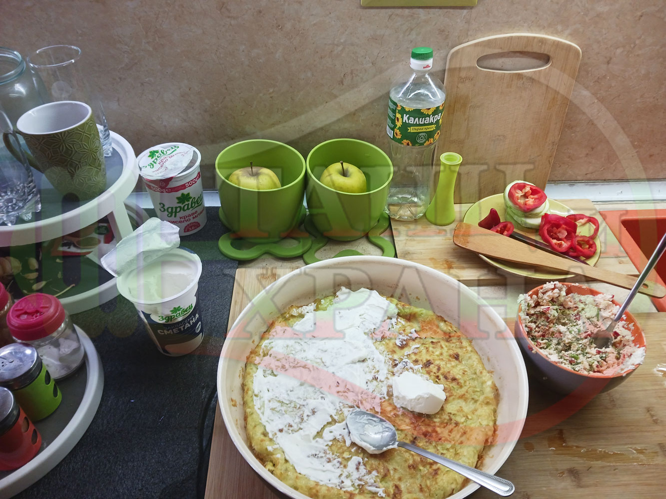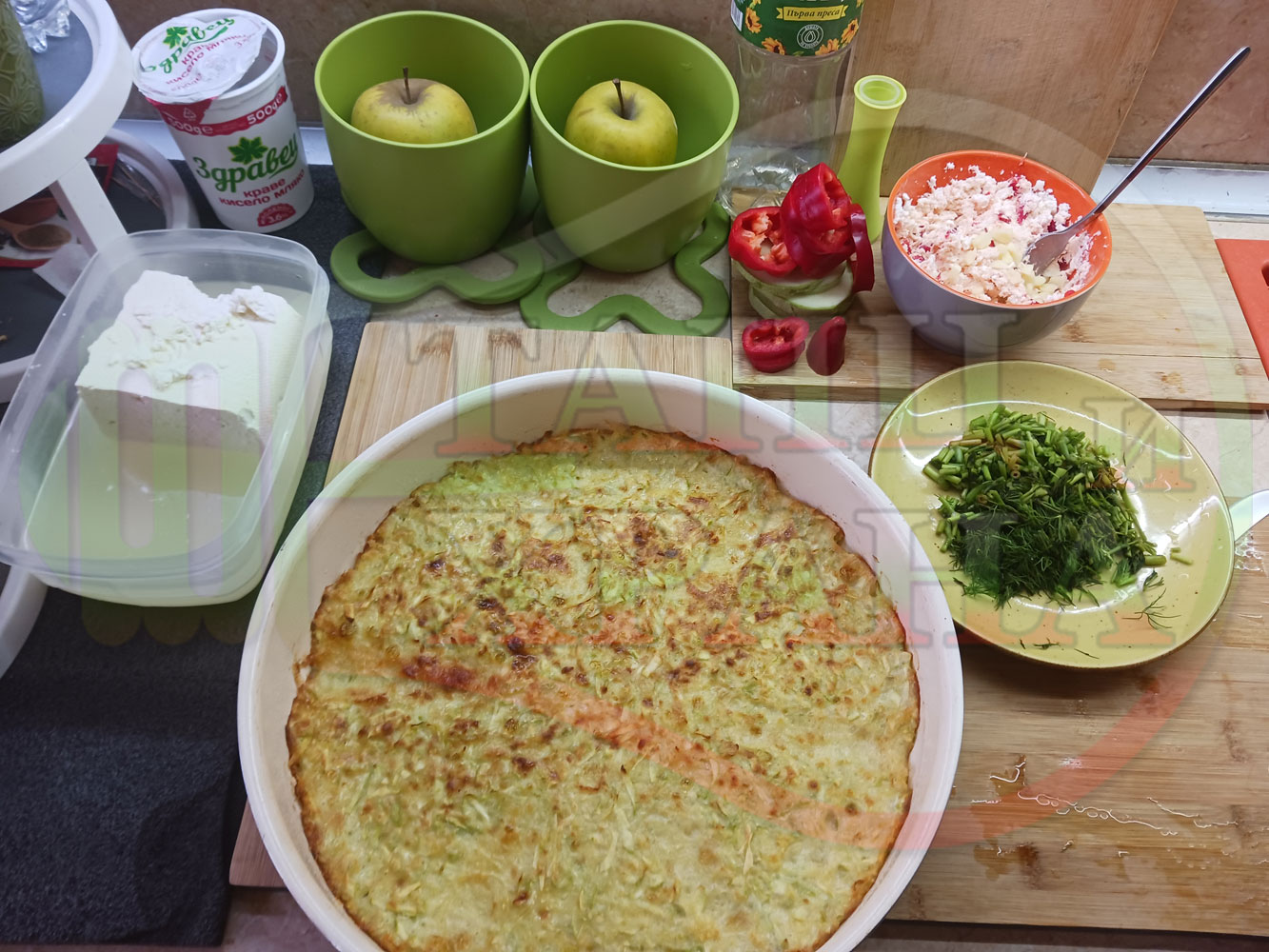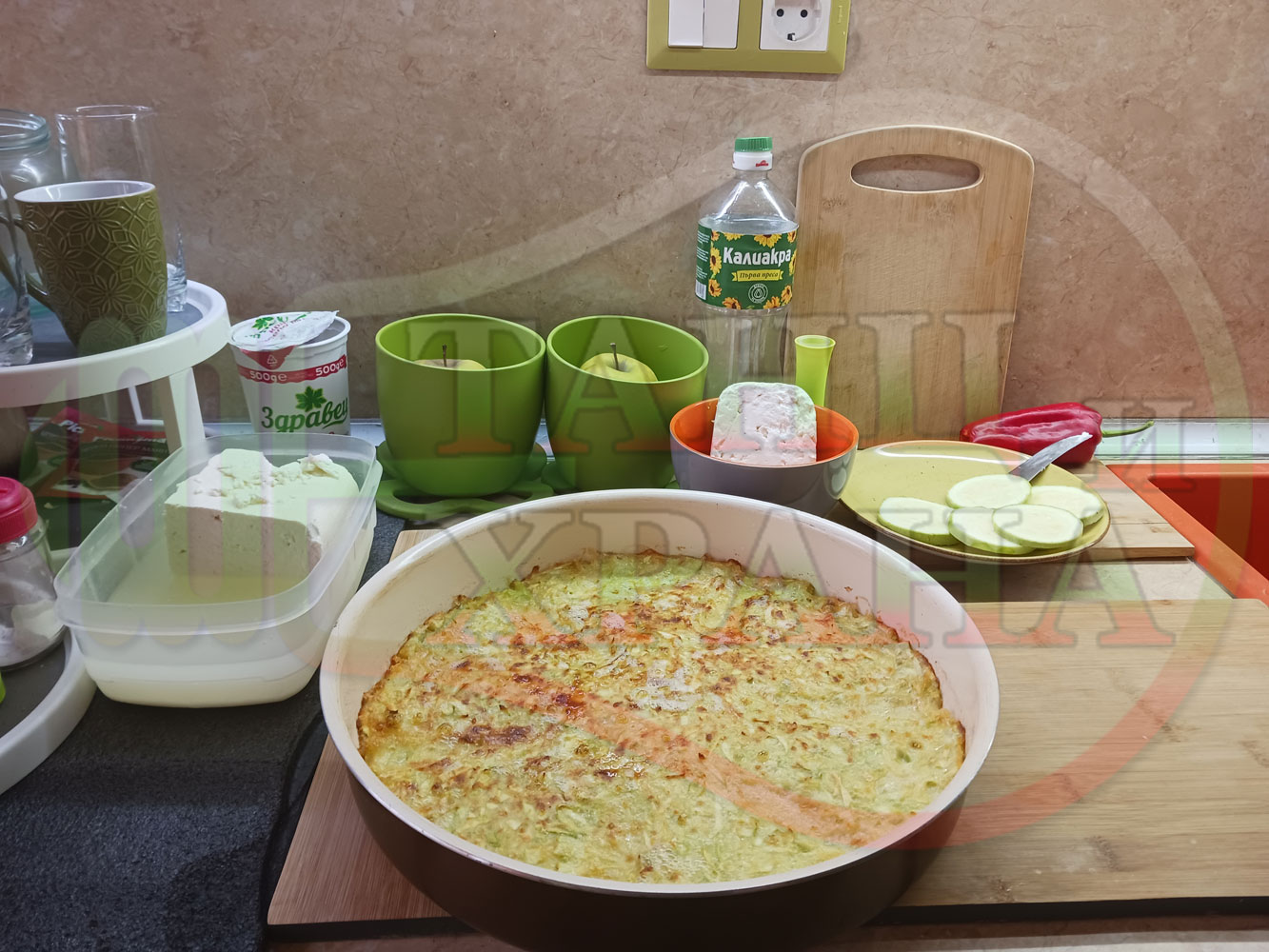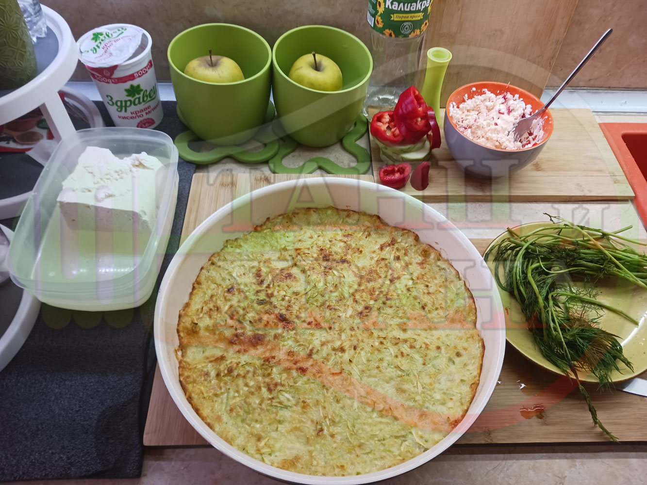 Тиквичкова сметанова пита "Тиквичковопиперкова копърова филежаренова с БГсирене" изпечена на фурна с пресни тиквички, яйца и жарено филе гарнирана със заквасена сметана и сиренов крем от червени пресни чушки, копър, чесън и краве бяло сирене