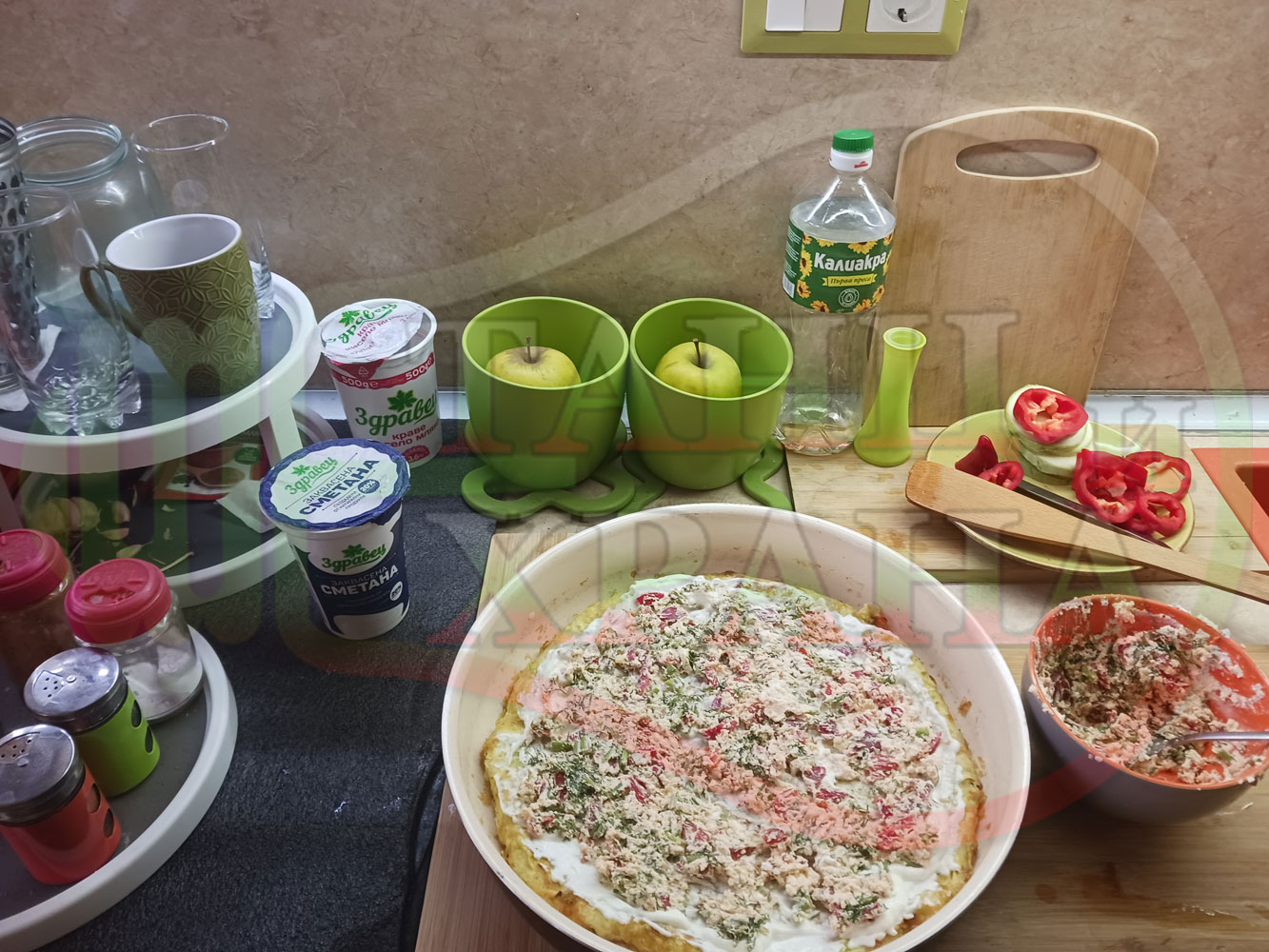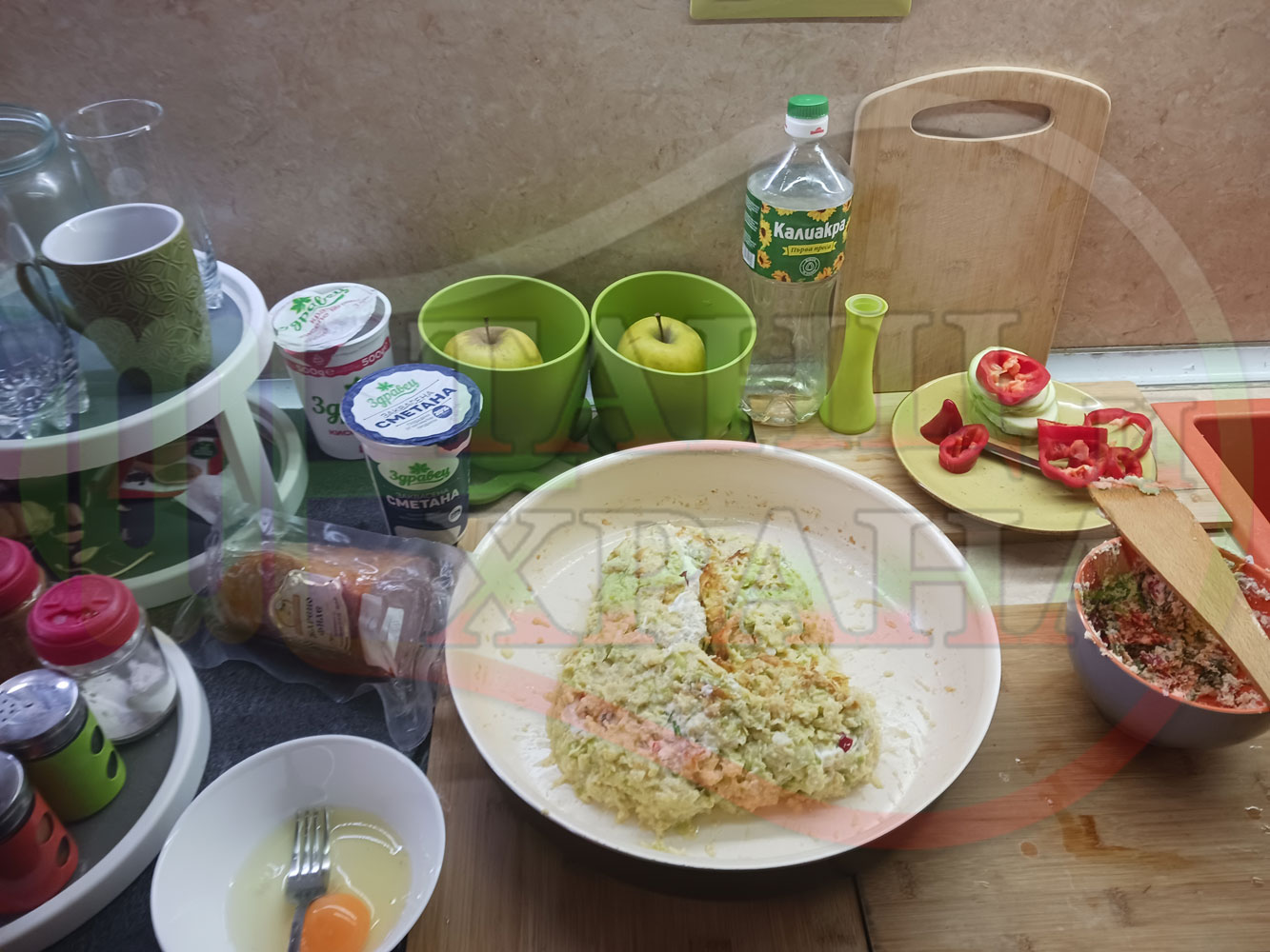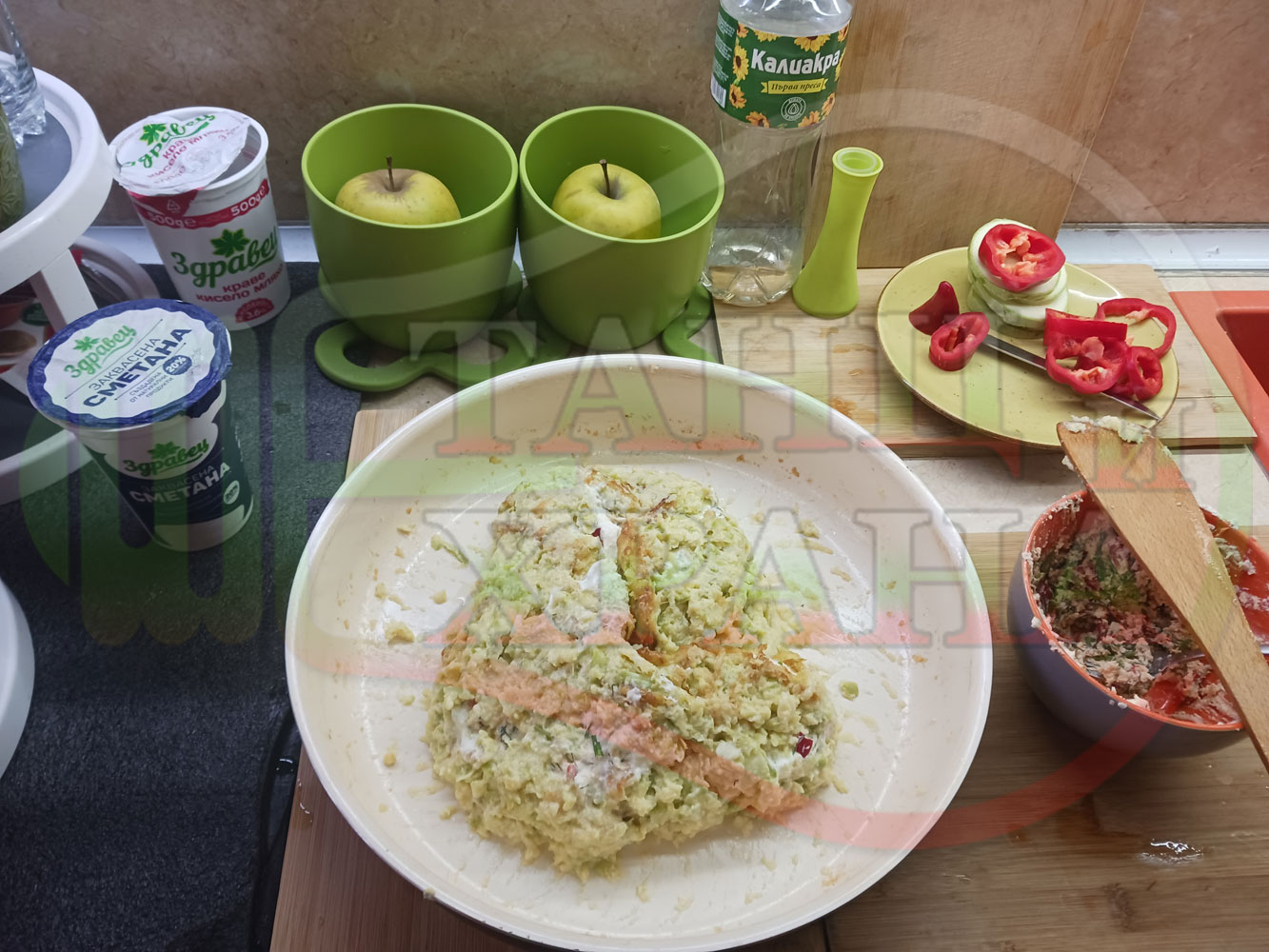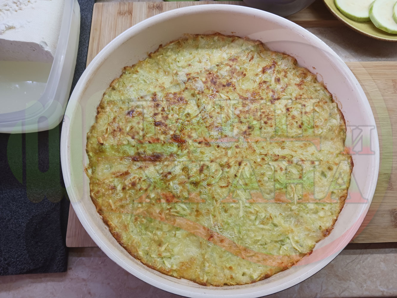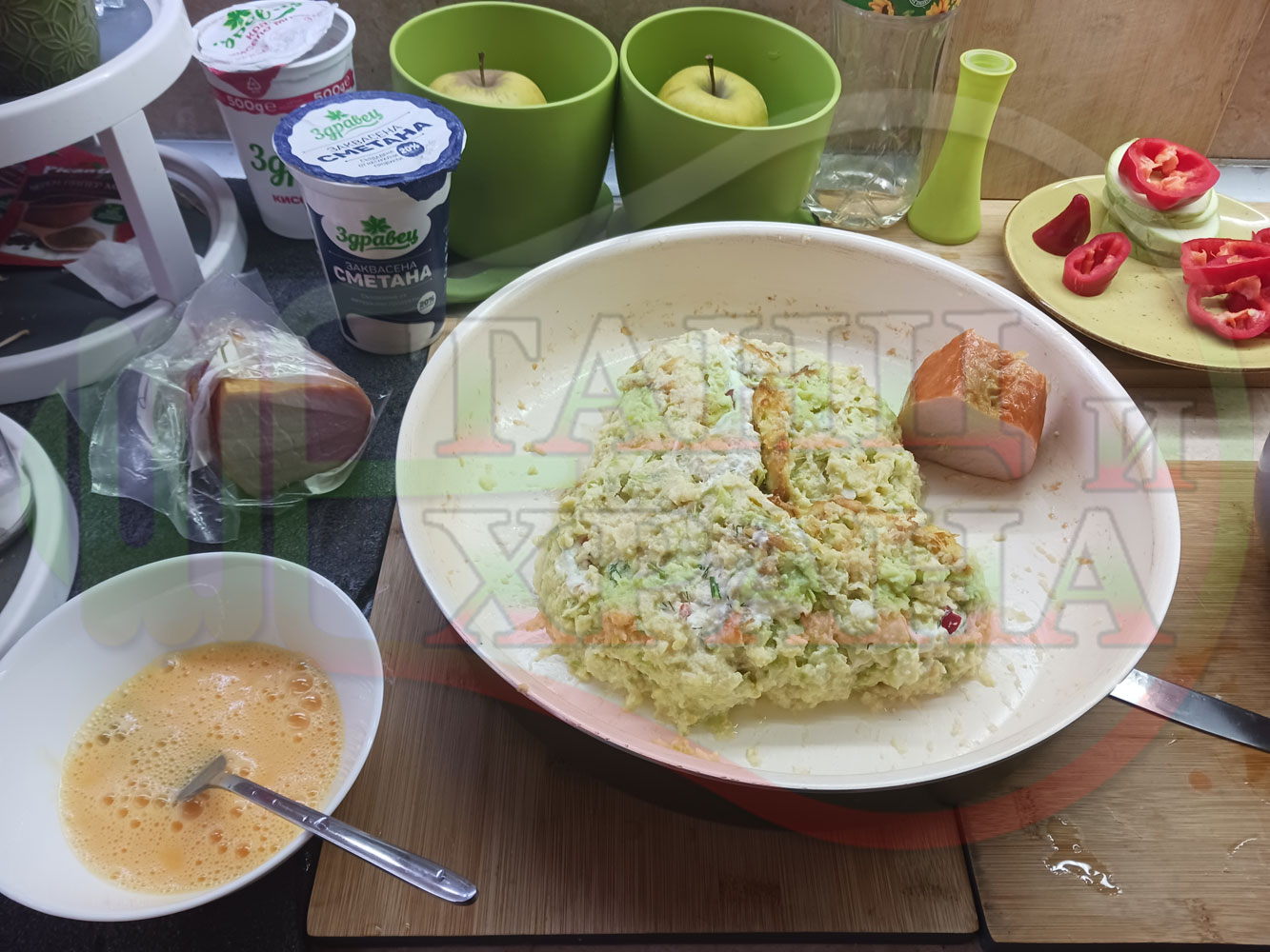 Тиквичкова сметанова пита "Тиквичковопиперкова копърова филежаренова с БГсирене" изпечена на фурна с пресни тиквички, яйца и жарено филе гарнирана със заквасена сметана и сиренов крем от червени пресни чушки, копър, чесън и краве бяло сирене