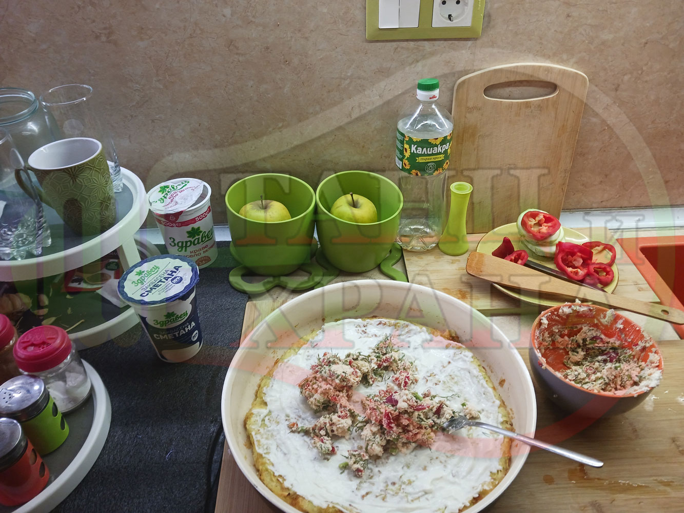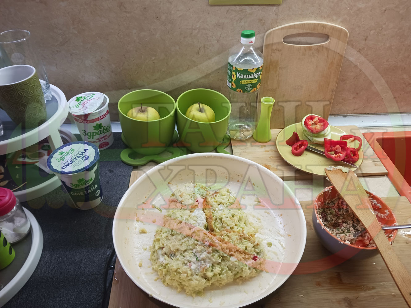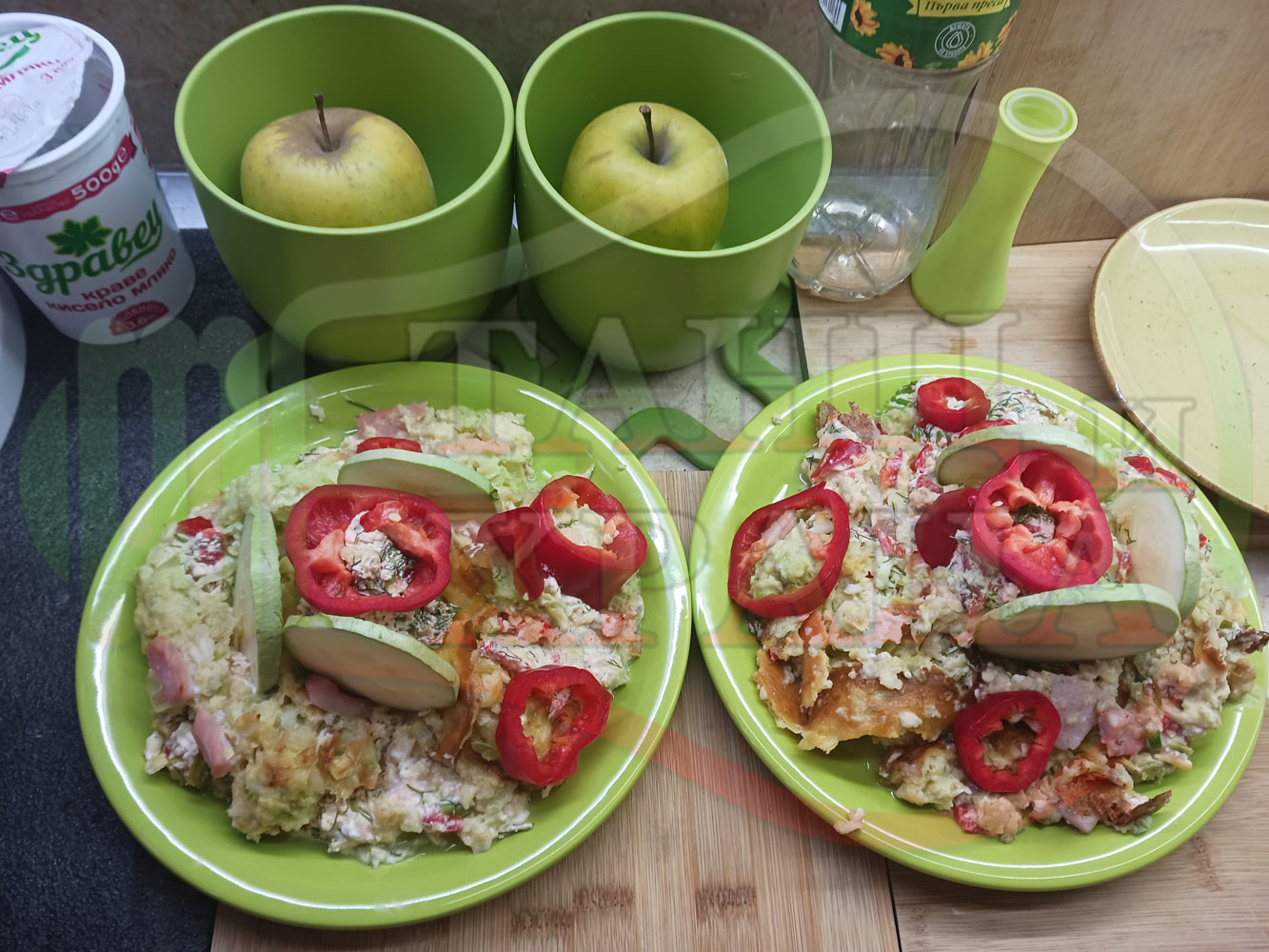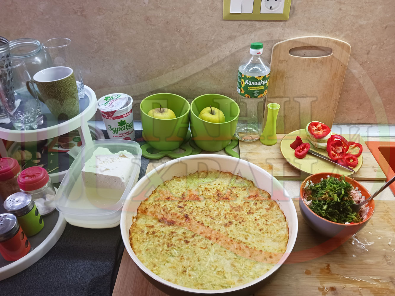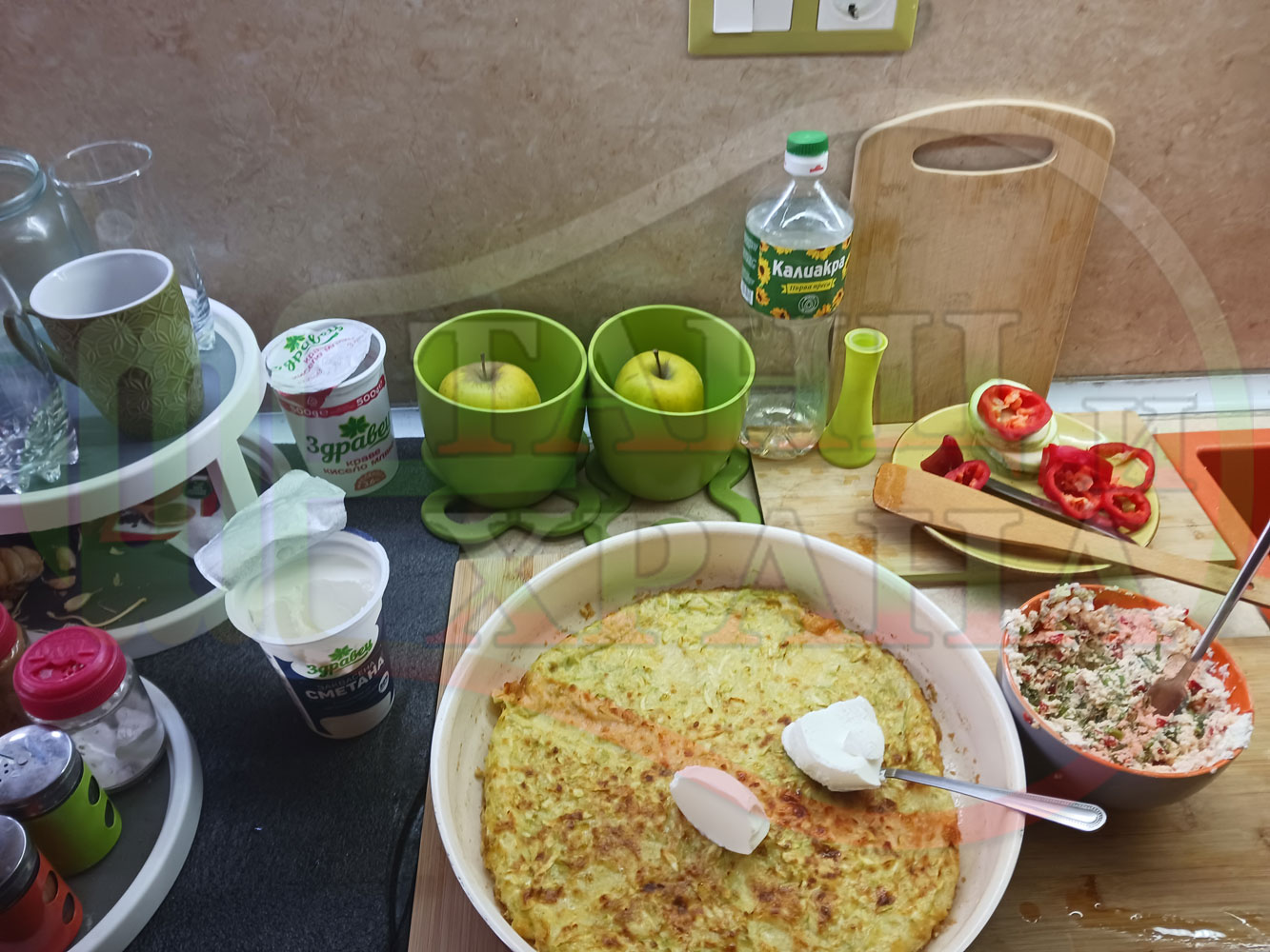 Тиквичкова сметанова пита "Тиквичковопиперкова копърова филежаренова с БГсирене" изпечена на фурна с пресни тиквички, яйца и жарено филе гарнирана със заквасена сметана и сиренов крем от червени пресни чушки, копър, чесън и краве бяло сирене