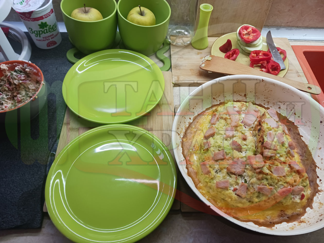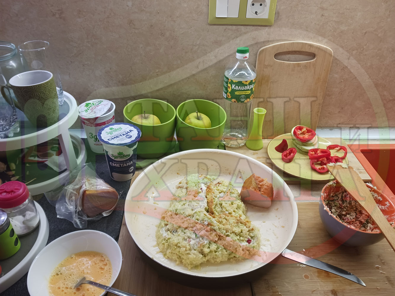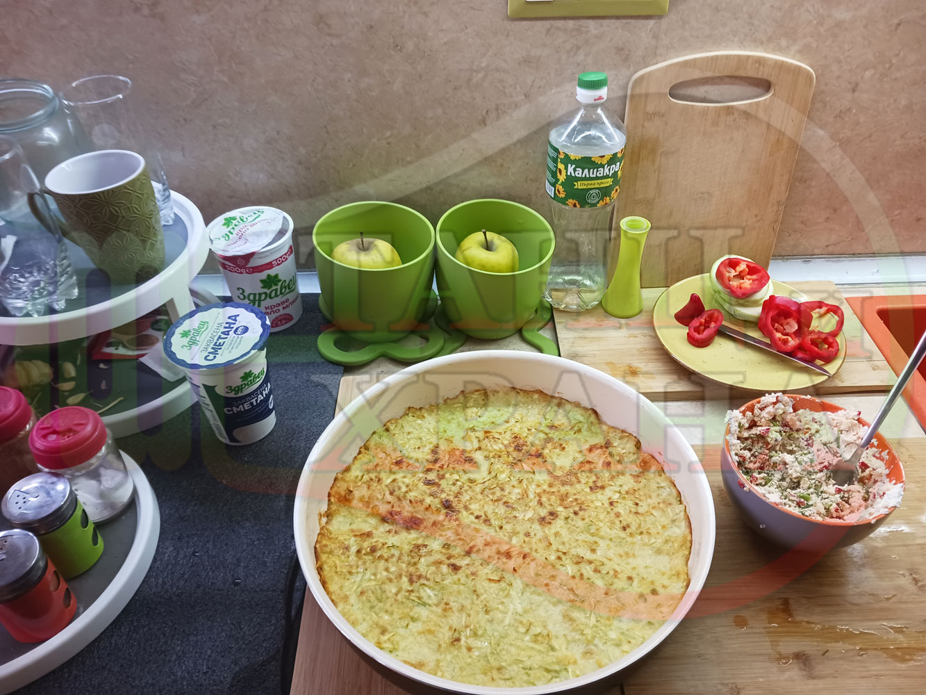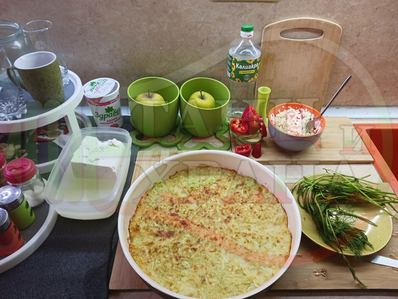 Тиквичкова сметанова пита "Тиквичковопиперкова копърова филежаренова с БГсирене" изпечена на фурна с пресни тиквички, яйца и жарено филе гарнирана със заквасена сметана и сиренов крем от червени пресни чушки, копър, чесън и краве бяло сирене