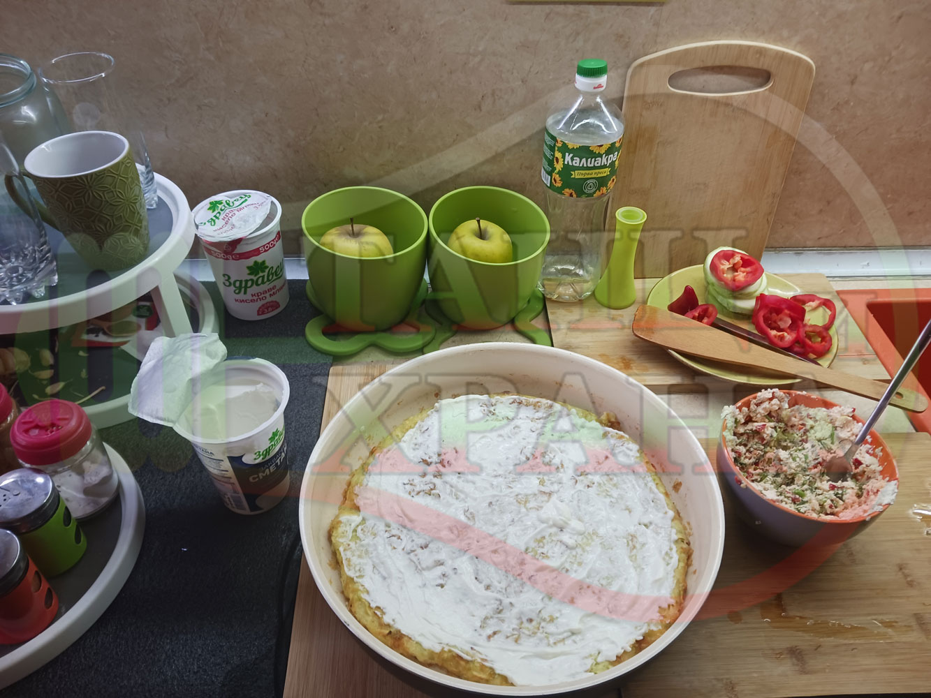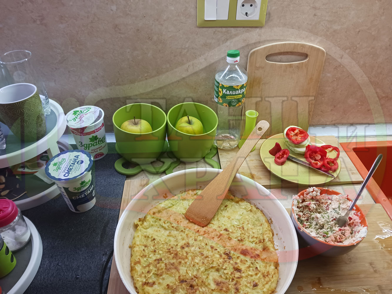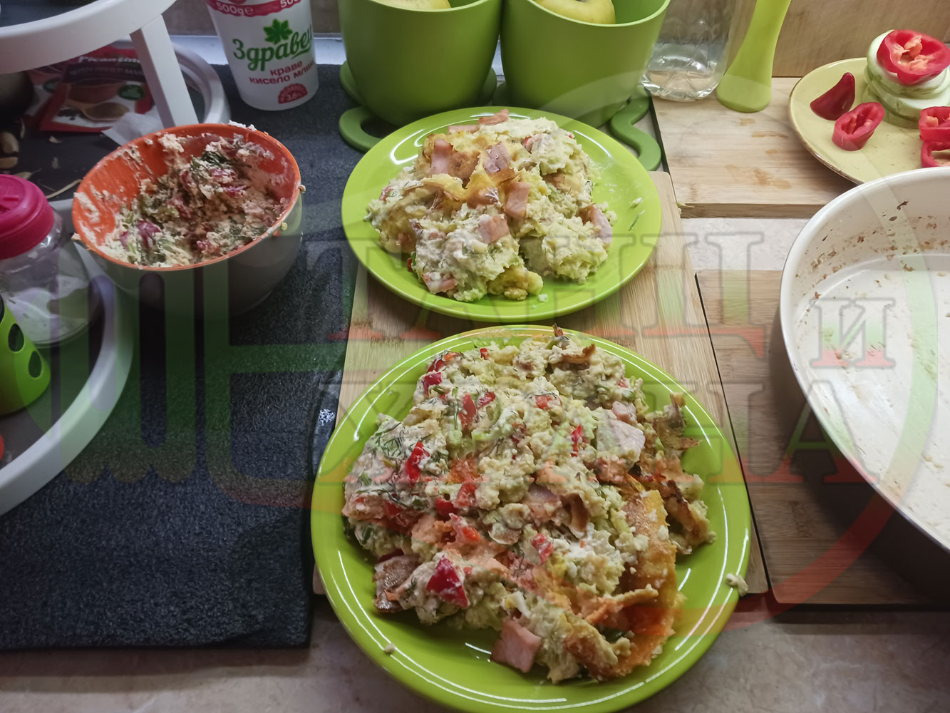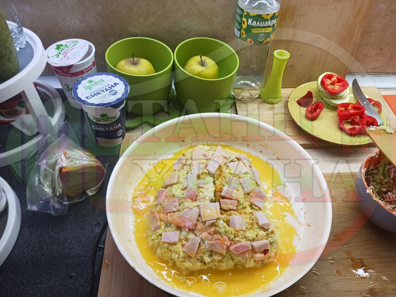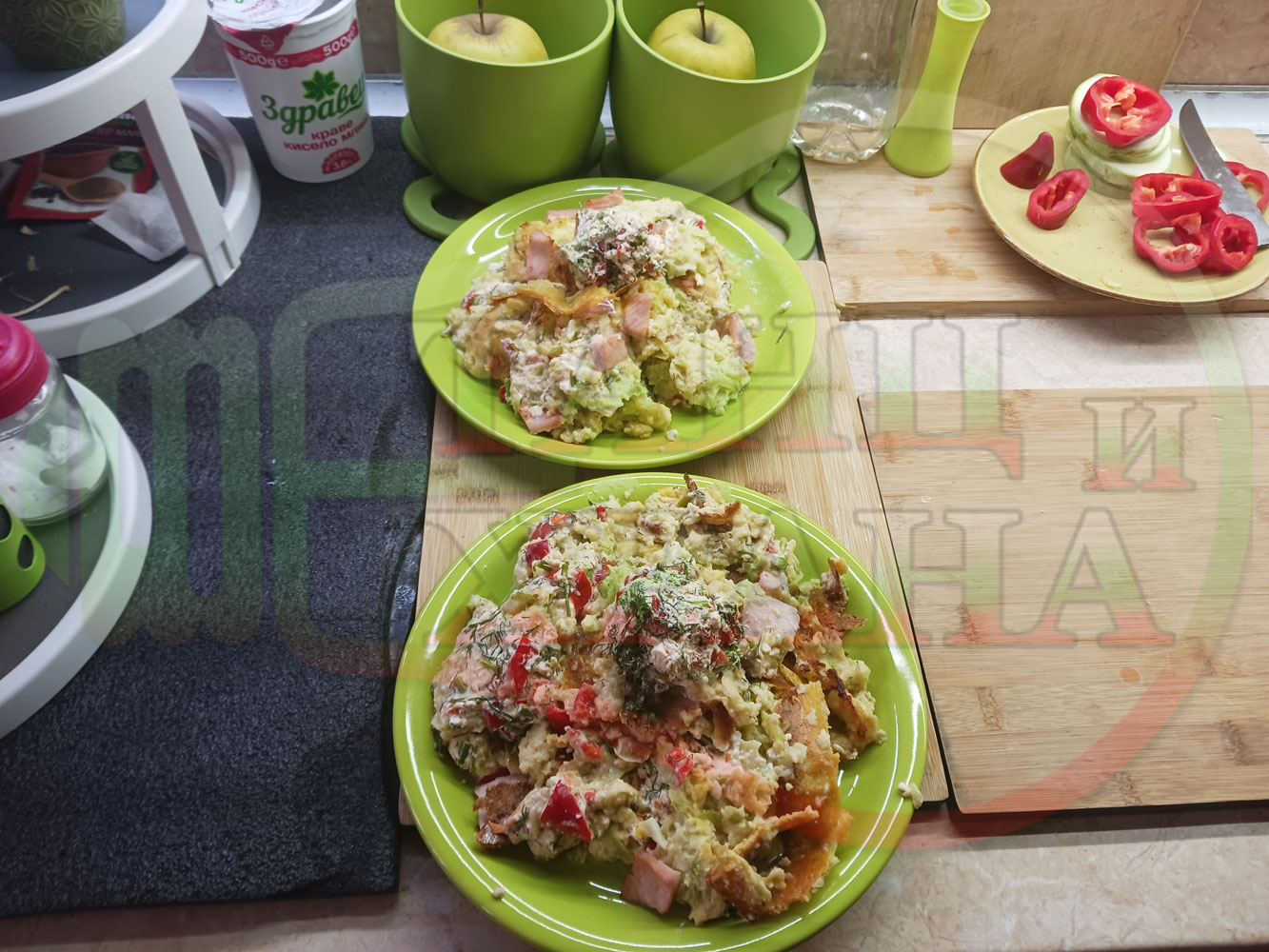 Тиквичкова сметанова пита "Тиквичковопиперкова копърова филежаренова с БГсирене" изпечена на фурна с пресни тиквички, яйца и жарено филе гарнирана със заквасена сметана и сиренов крем от червени пресни чушки, копър, чесън и краве бяло сирене