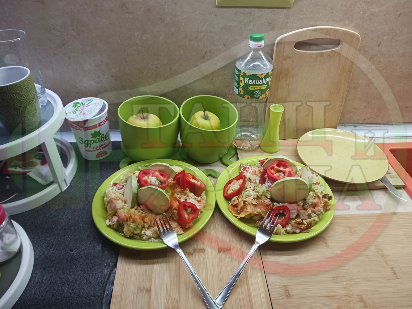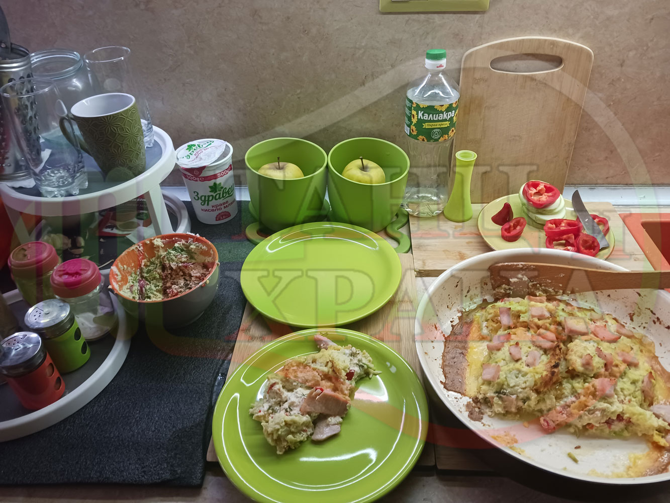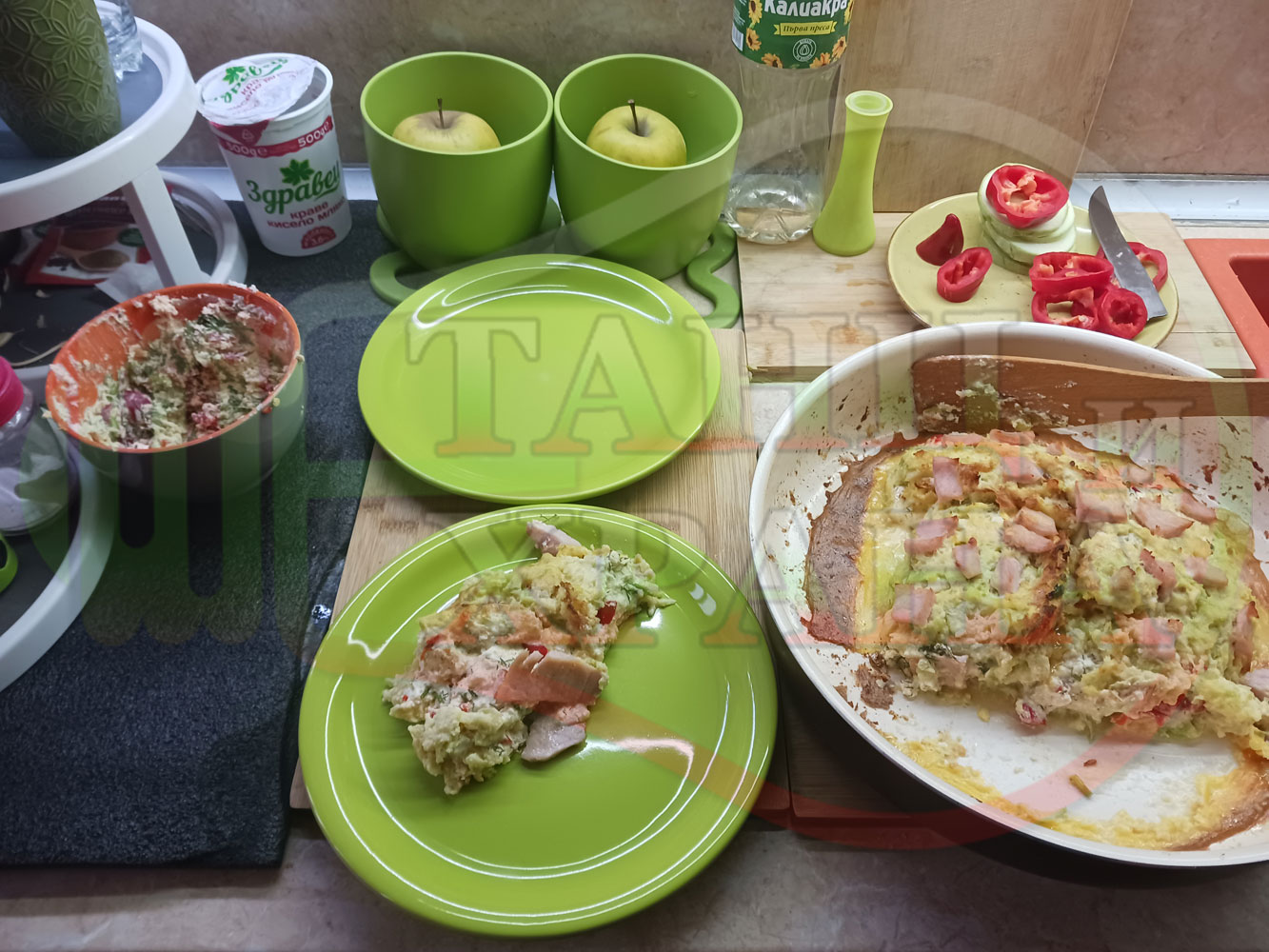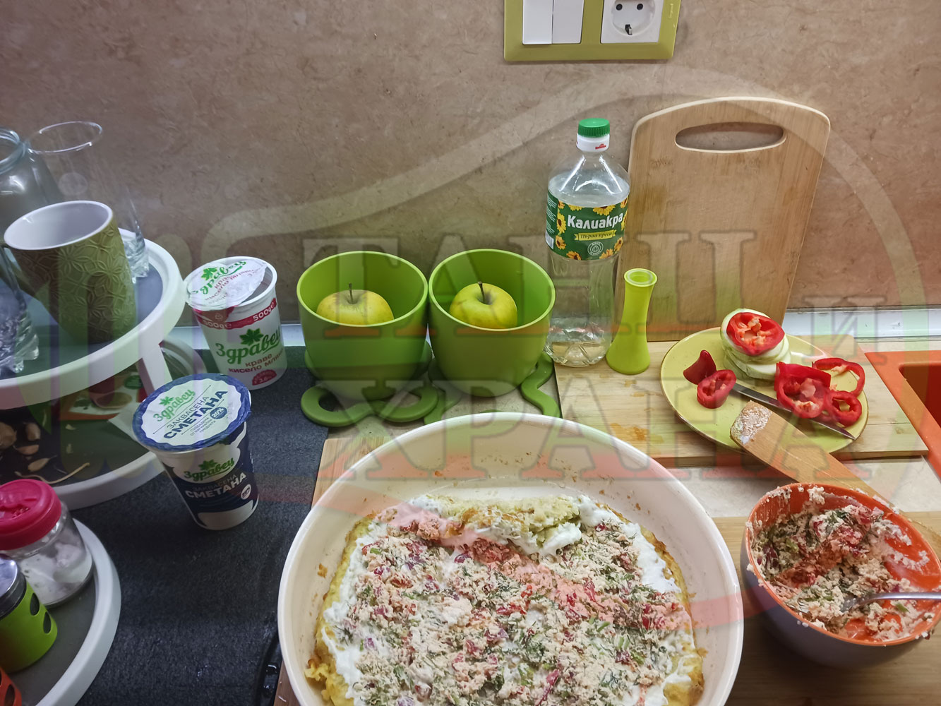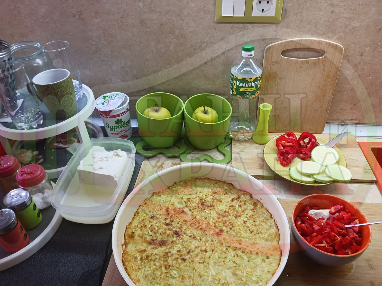 Тиквичкова сметанова пита "Тиквичковопиперкова копърова филежаренова с БГсирене" изпечена на фурна с пресни тиквички, яйца и жарено филе гарнирана със заквасена сметана и сиренов крем от червени пресни чушки, копър, чесън и краве бяло сирене
