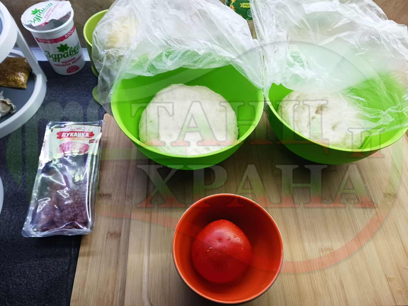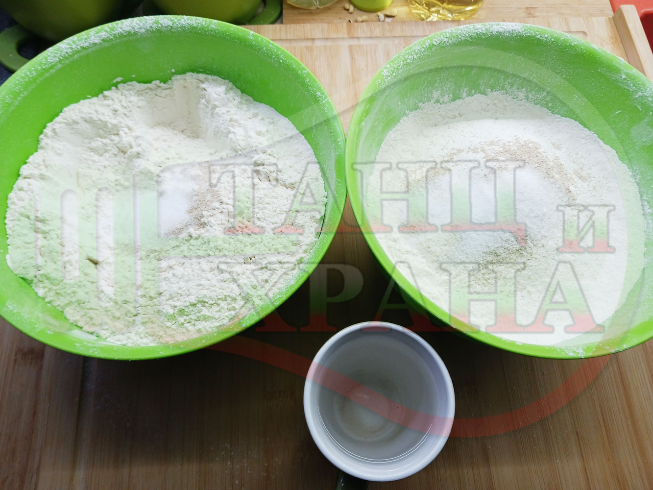 Пресейте брашното в купата и сипете половин пакетче суха мая, захарта, солта и хладка вода от чешмата. Започнете да замесвате тестото от средата на купата и със замесването оформете "топка" докато тестото се отлепи напълно от купата и намали лепкавостта си. Поръсвайте с брашно при необходимост докато замесвате (отлепянето на тестото от купата означава, че е омесено). Намажете купата и тестото с олио и покрийте купата с прозрачен найлонов плик (оставете отвор в единия край на плика за да "диша" тестото докато втасва). Поставете купата на топло място за около 70 минути за да втаса тестото и удвои обема си (времето за втасване зависи от топлината в кухнята).