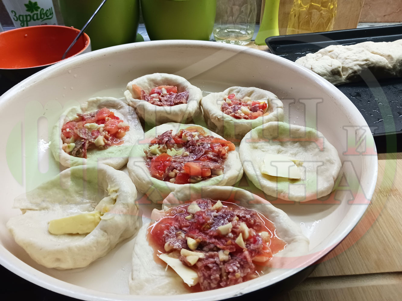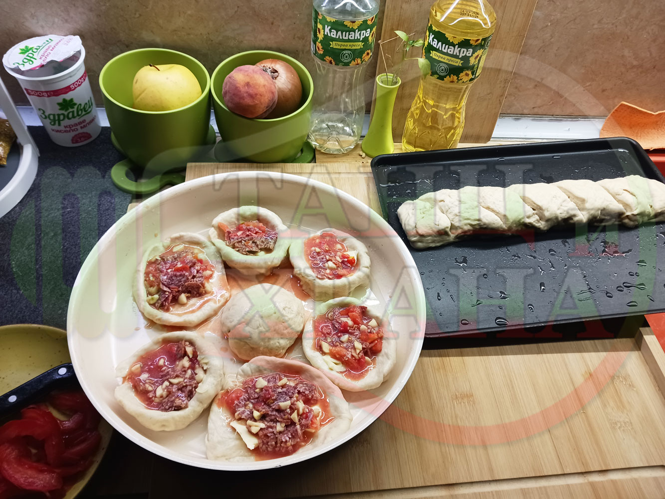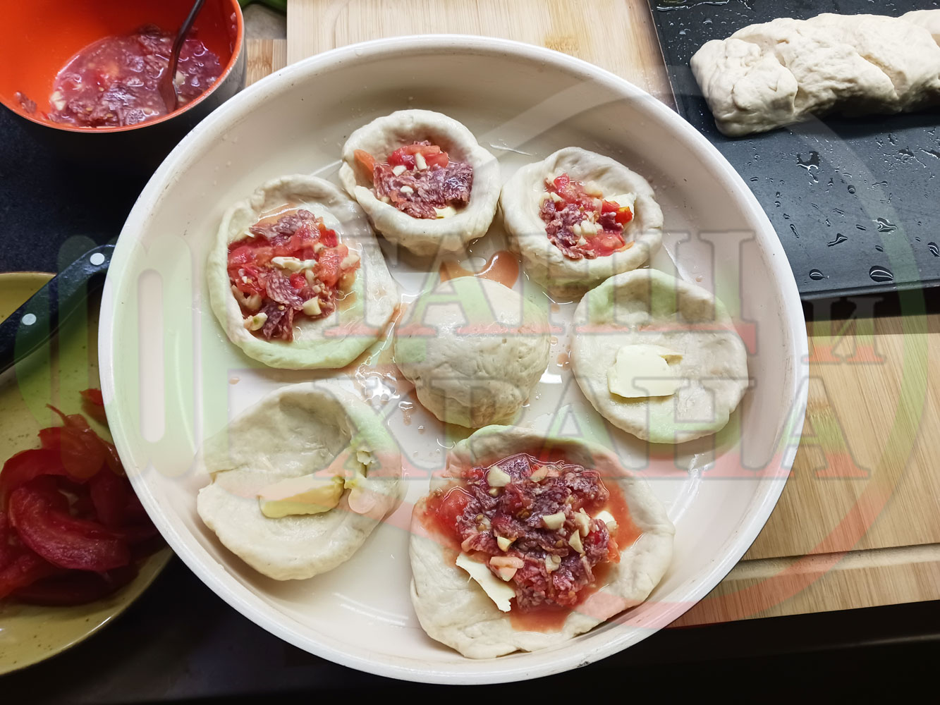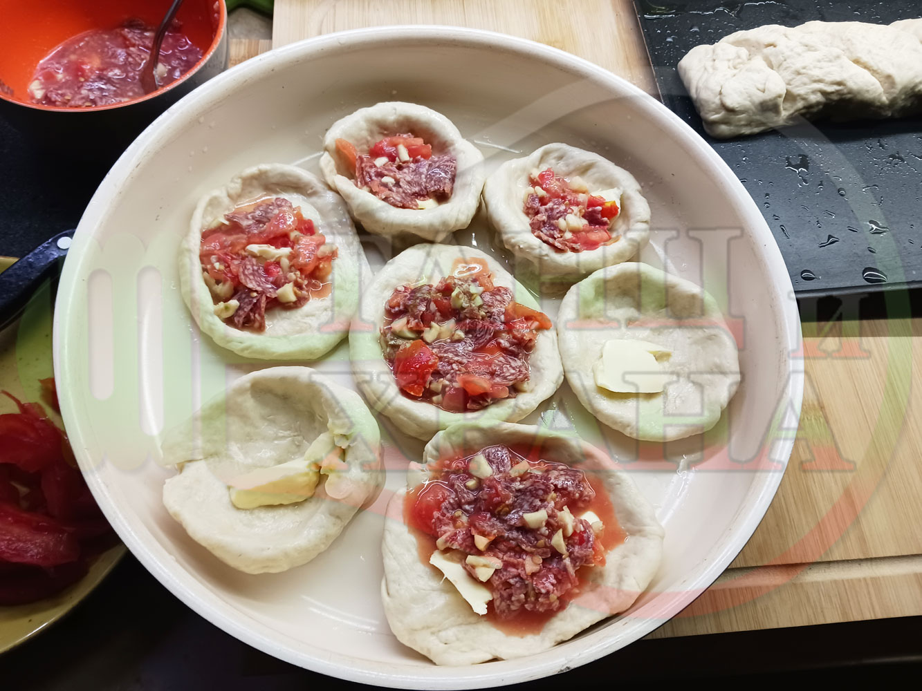 Пълнени питки "Смядовсколуканкови доматеночеснови" запечени на фурна с масло и яйчено доматена плънка от пресни домати, стар чесън, яйца и смядовска луканка омесени със суха мая