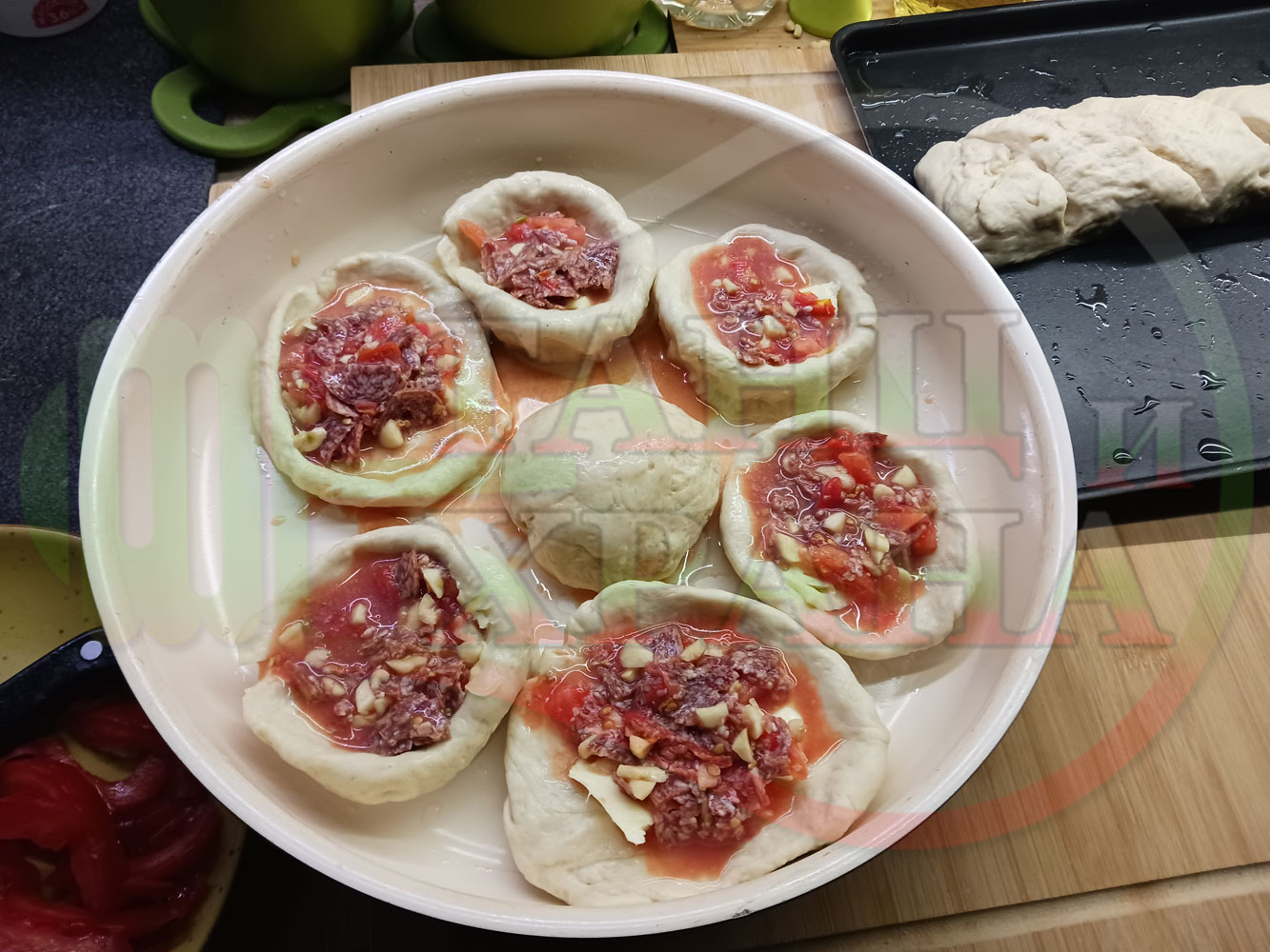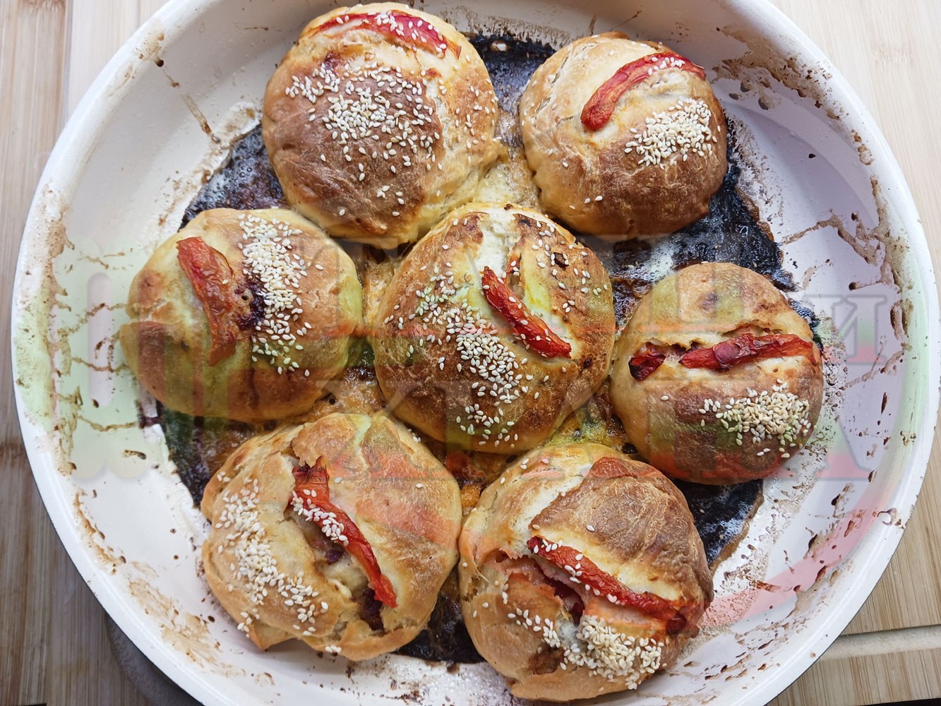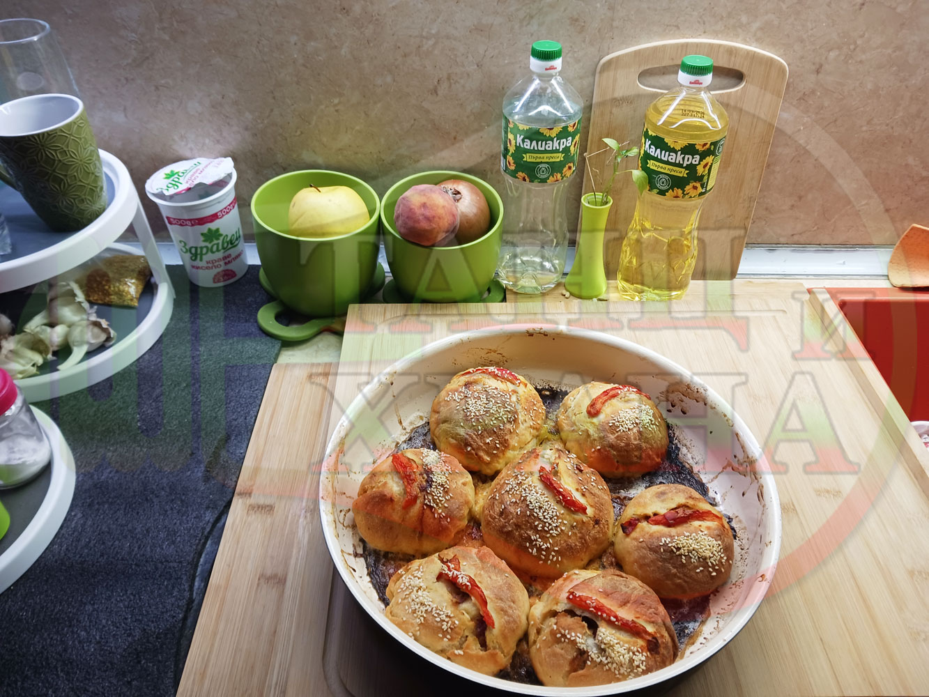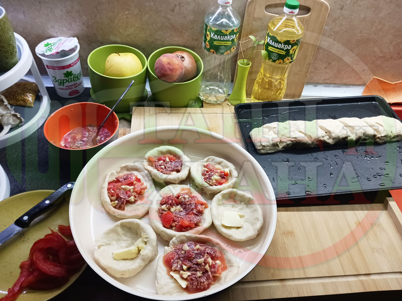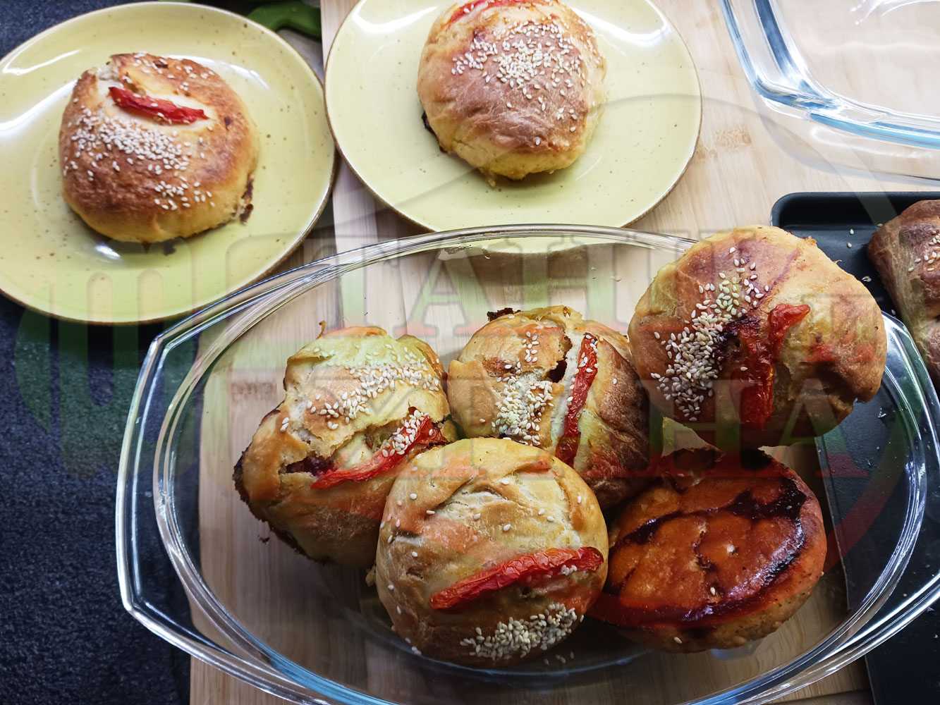 Пълнени питки "Смядовсколуканкови доматеночеснови" запечени на фурна с масло и яйчено доматена плънка от пресни домати, стар чесън, яйца и смядовска луканка омесени със суха мая