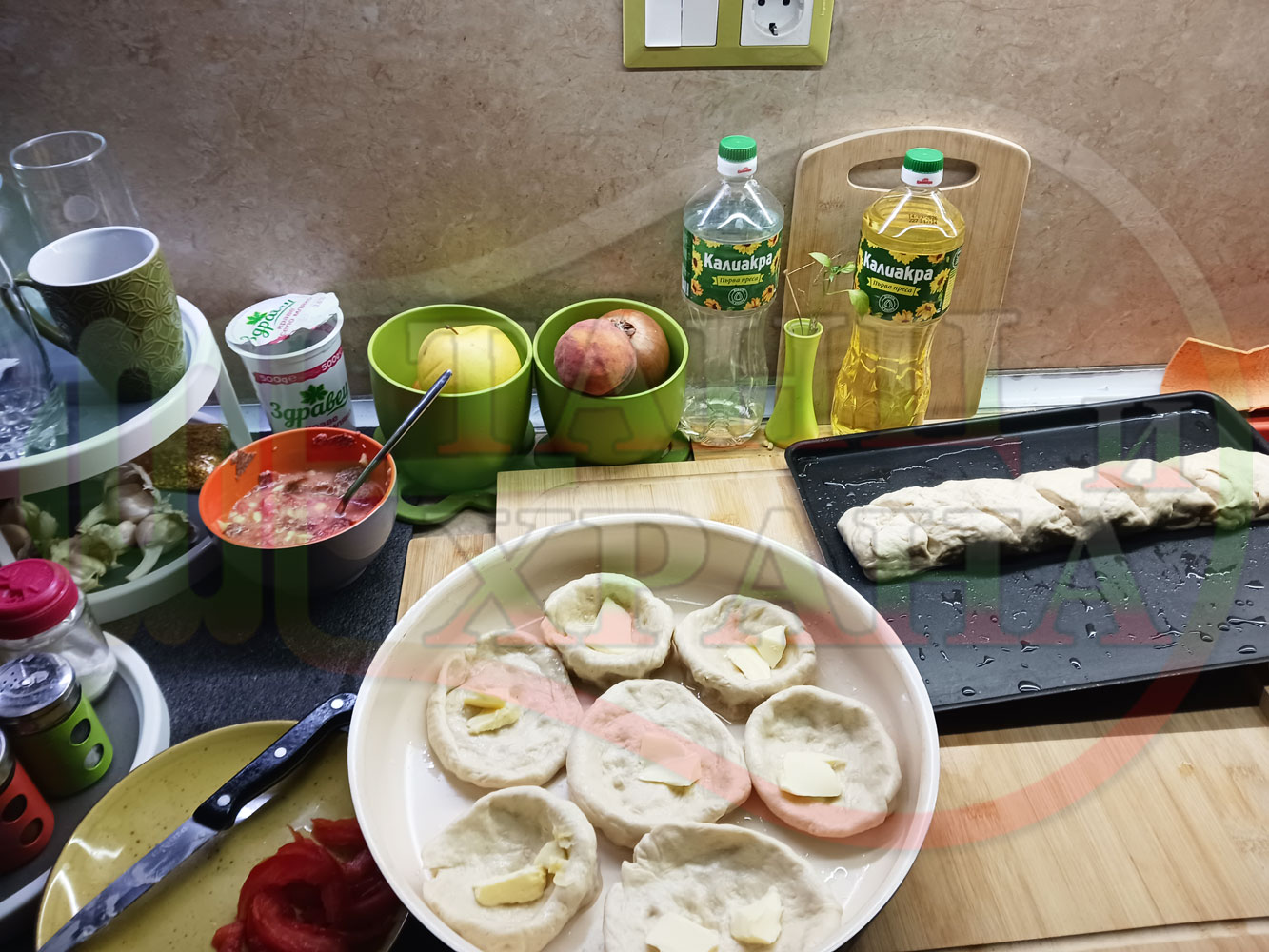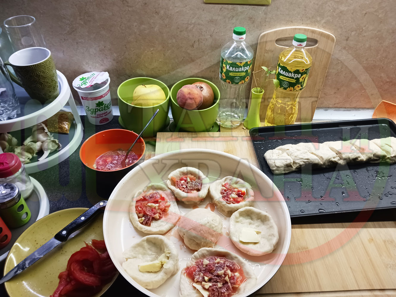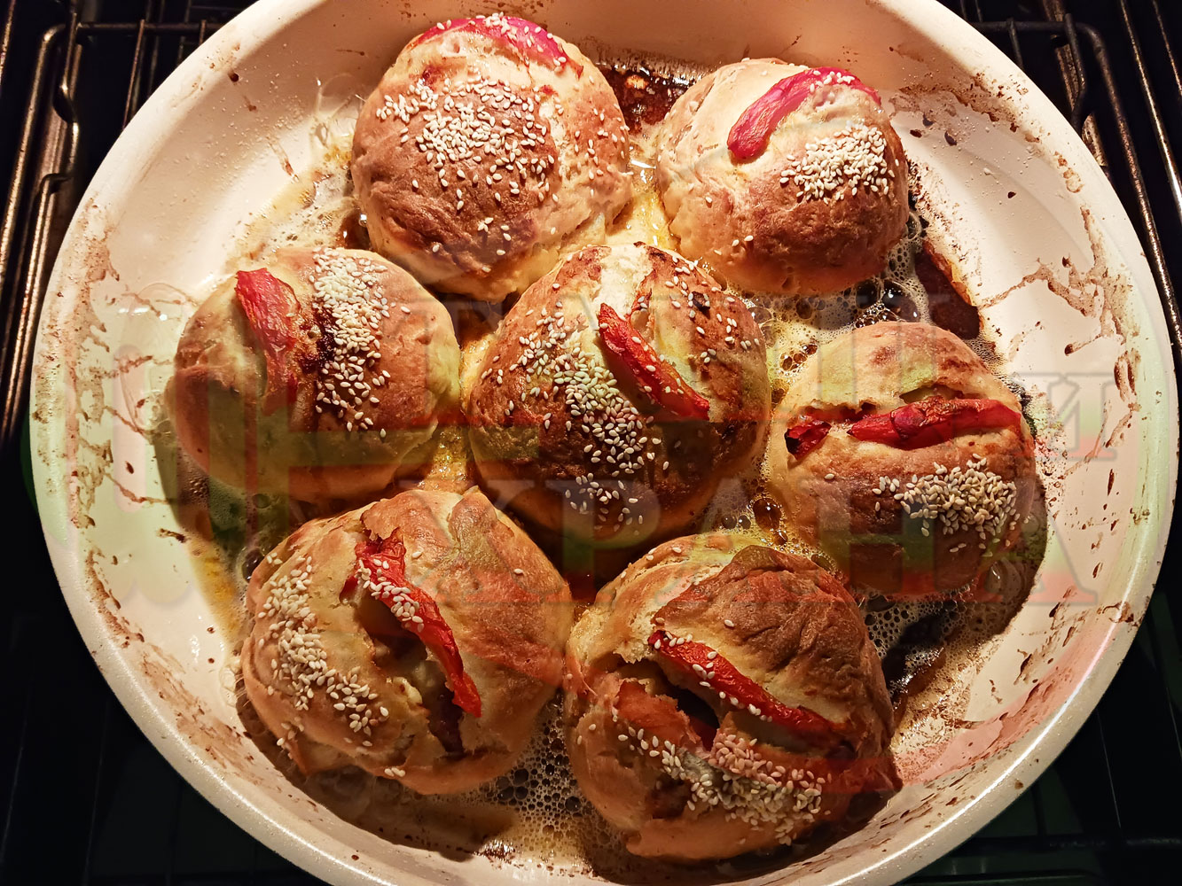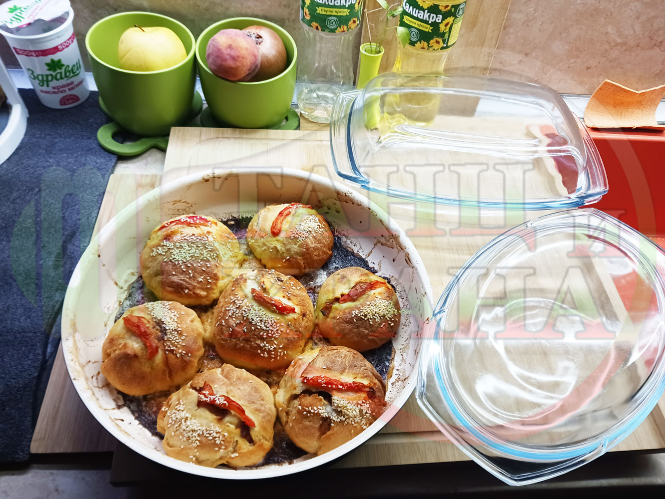 Пълнени питки "Смядовсколуканкови доматеночеснови" запечени на фурна с масло и яйчено доматена плънка от пресни домати, стар чесън, яйца и смядовска луканка омесени със суха мая