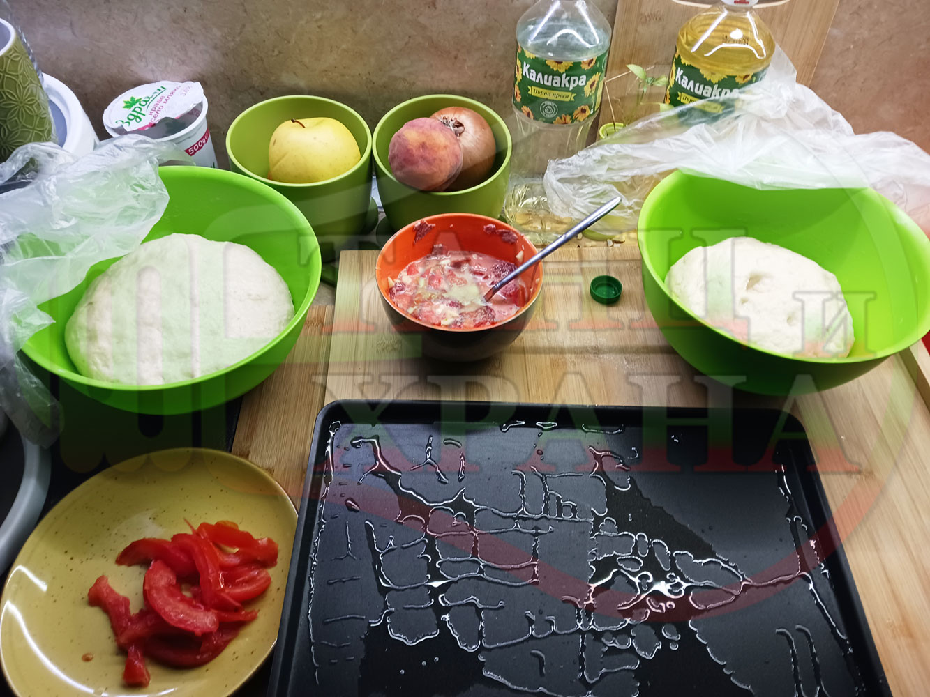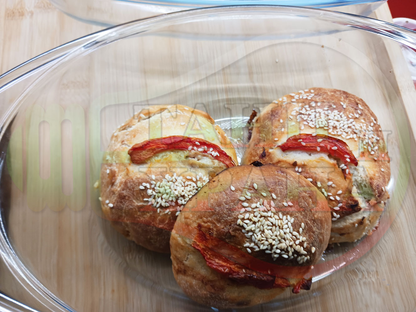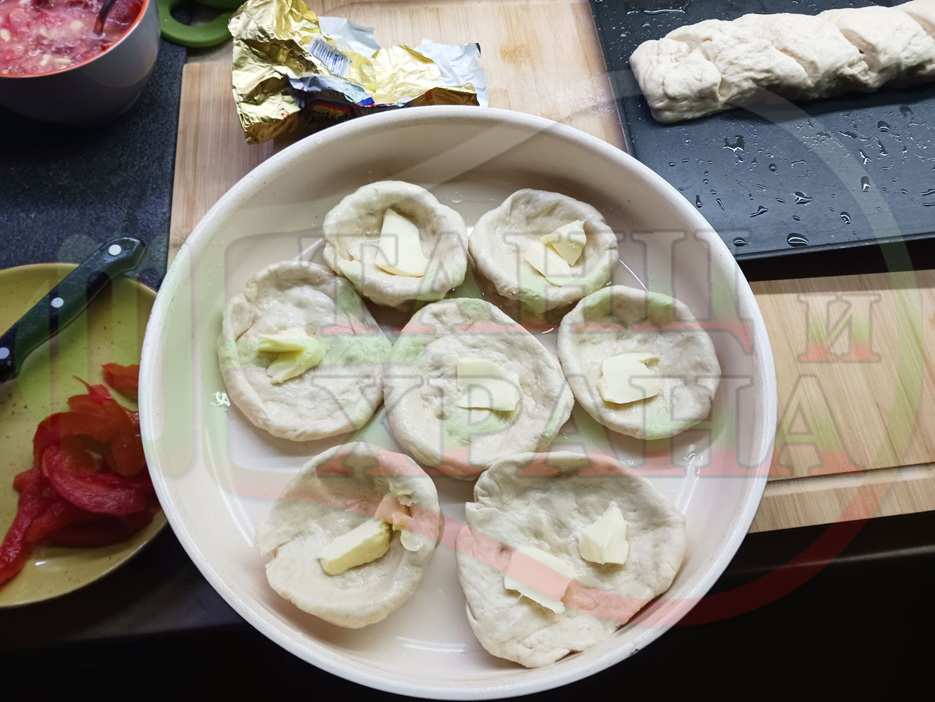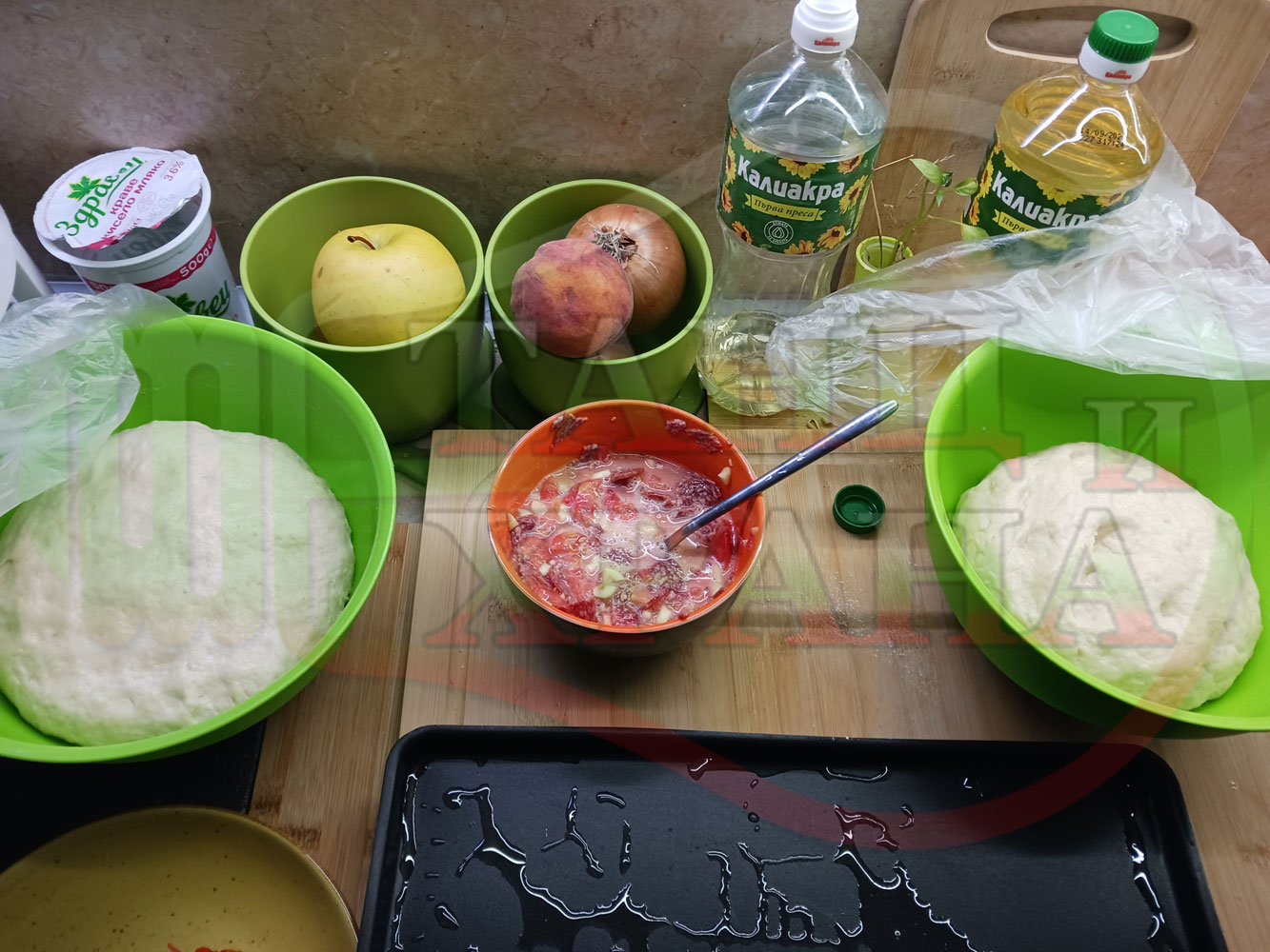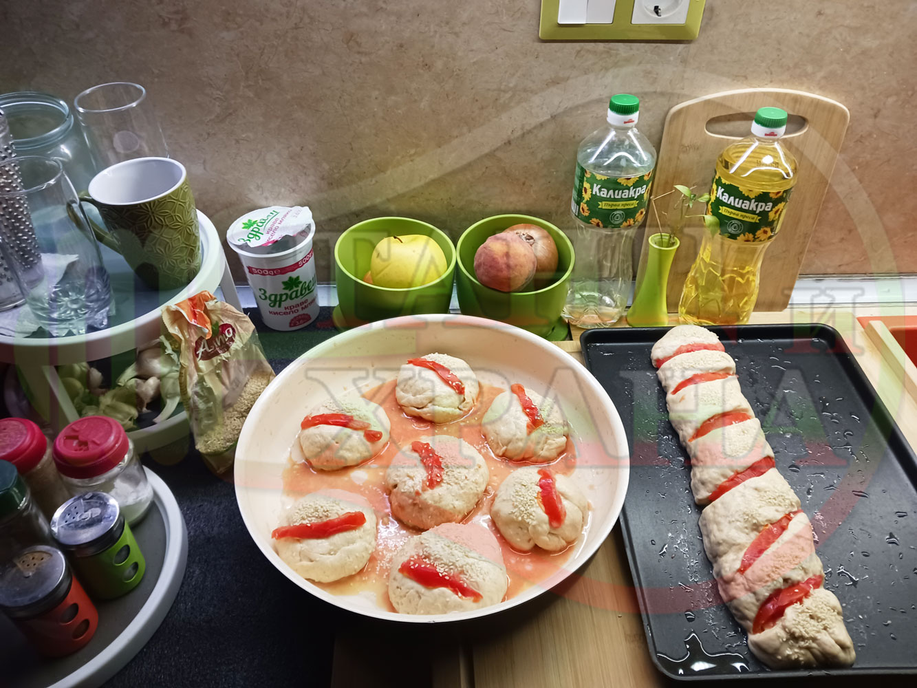 Пълнени питки "Смядовсколуканкови доматеночеснови" запечени на фурна с масло и яйчено доматена плънка от пресни домати, стар чесън, яйца и смядовска луканка омесени със суха мая
