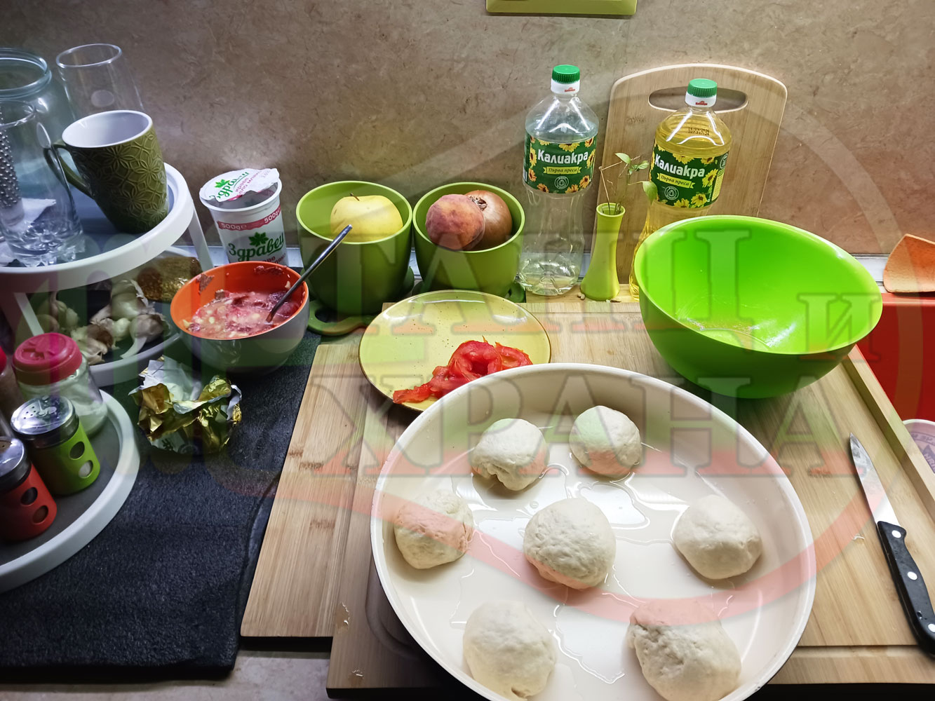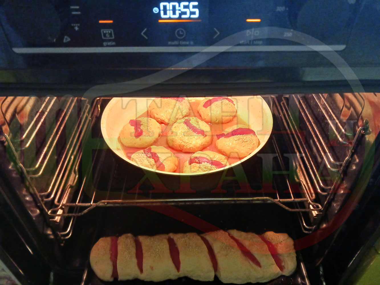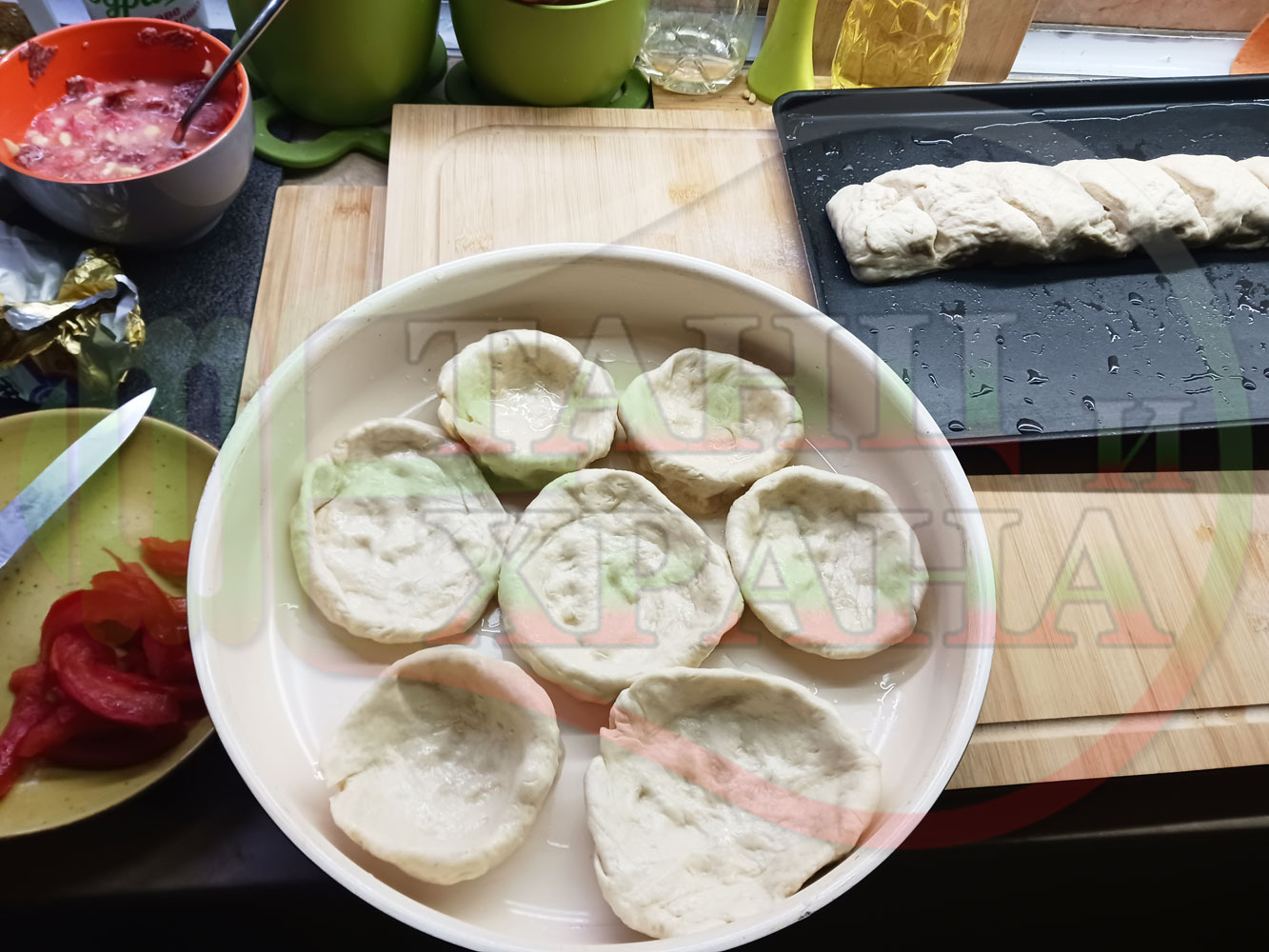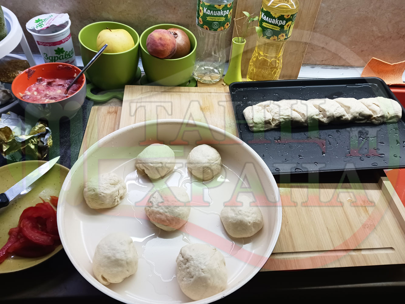 Пълнени питки "Смядовсколуканкови доматеночеснови" запечени на фурна с масло и яйчено доматена плънка от пресни домати, стар чесън, яйца и смядовска луканка омесени със суха мая