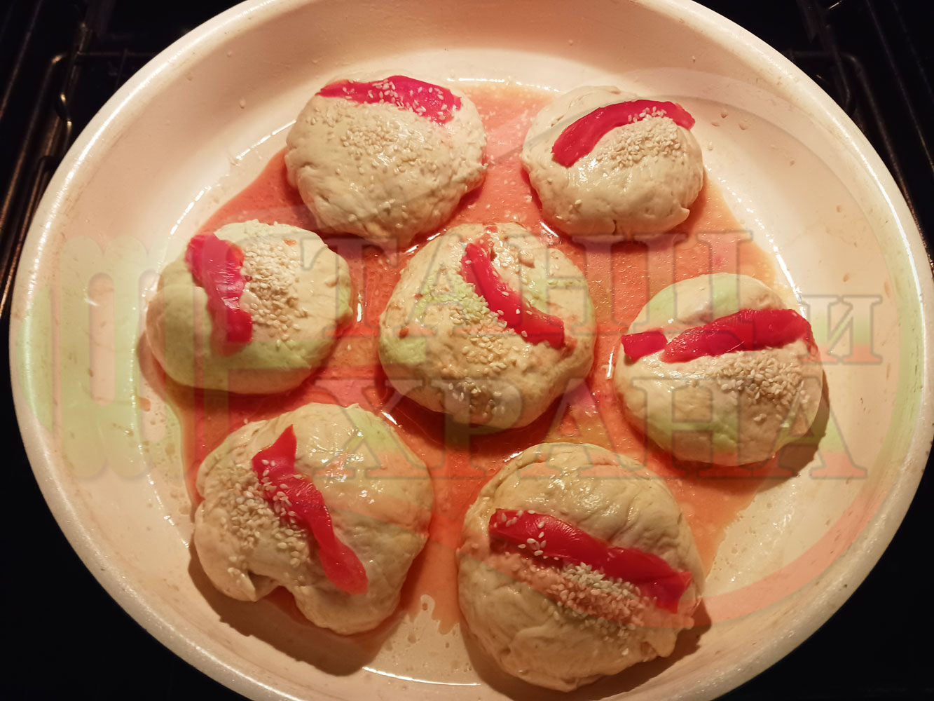 Сипете слънчогледово олио в тава за печене, размажете го равномерно по тавата черз накланяне или с четка и откъснете или отрежете от тестото приблизително еднакти парчета (големината на парчетата и броя са според броя на питките, които искате да оформите). Оформете с въртеливи движения кръгли топки от всяко парче и ги подредете в намазаната със слънчогледово олио тава за печене. Оформете вдлъбнатина в средата на всяка топка, поставете по 1 или няколко тънки парченца масло във вдлъбнатините и разпределете равномерно количество от яйчената плънка (с част от изтеклия сок на плънката намажете питките след като ги затворите). Затворете питките, така че да не изпадне плънката и отново ги оформете на топки (при оформянето на топките част от сока на яйчено доматената плънка изтича и по този начин питките се изпичат в сока и стават по-вкусни без да остават неовкусени с пълнката места в тях). Подредете питките с отстояние между тях за повторното им втасване и поставете по 1 доматена ивичка на всяка питка и ги поръсете със суровия сусам. Покрийте тавата с кърпа, хартия или найлонов плик и я оставете на топло за около 30 минути докато топките втасат повторно и удвоят обема си (при топла кухня не покривайте тавата).