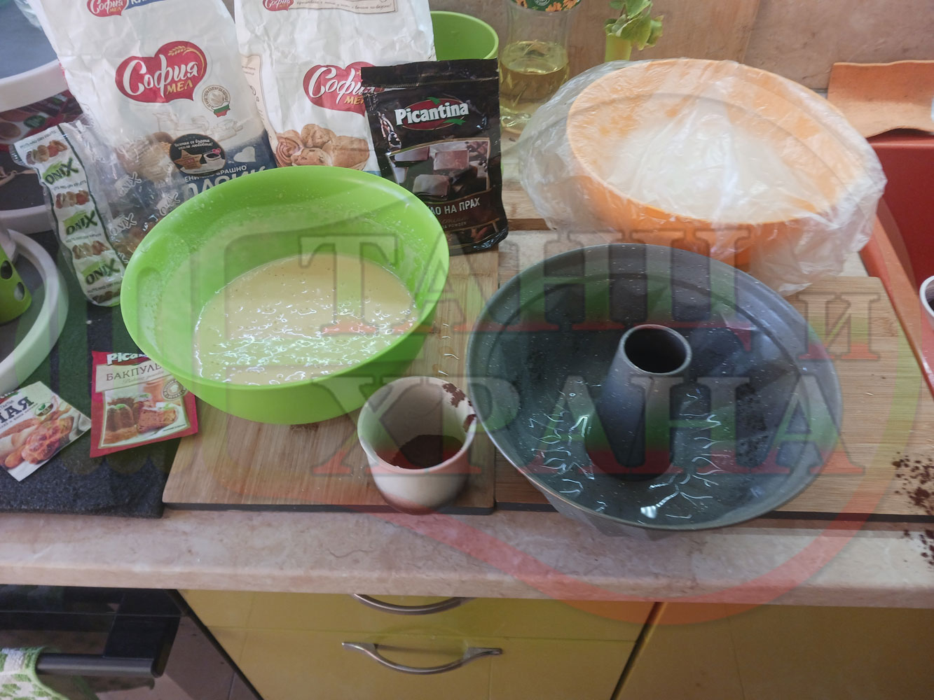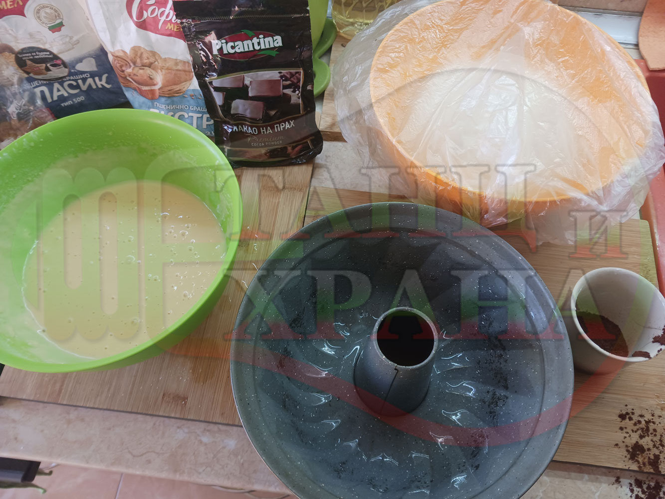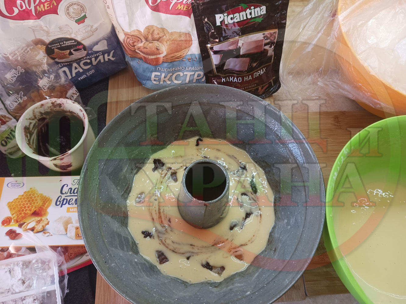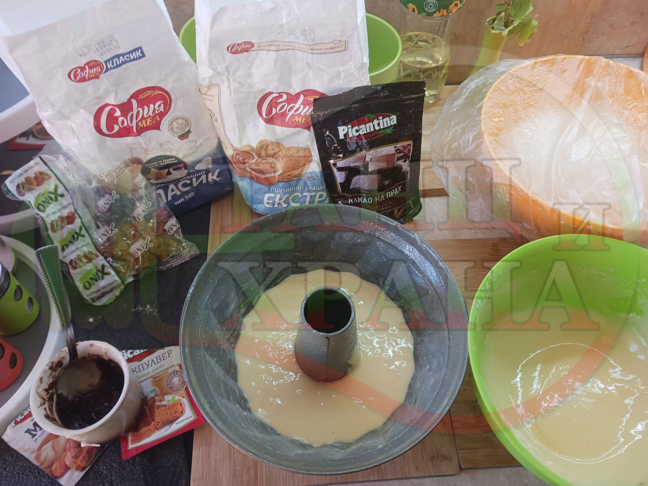 Сипете 5 супени лъжици от кексовото тесто в чаша или малка, плитка купа и добавете какаото. Разбъркайте какаото в тестото до хомогенизиране за да може да създадете някакви цветови шарки в кекса.