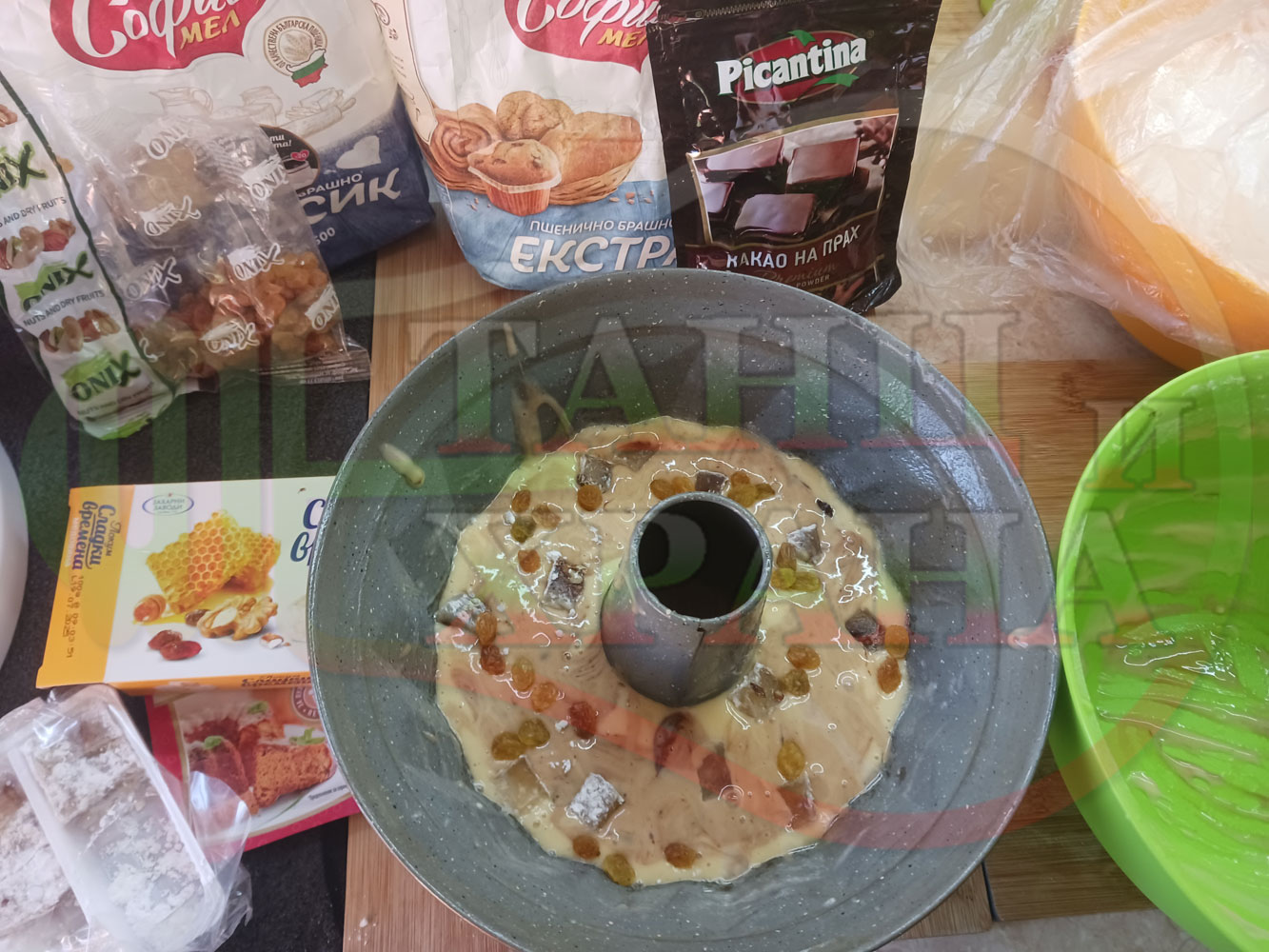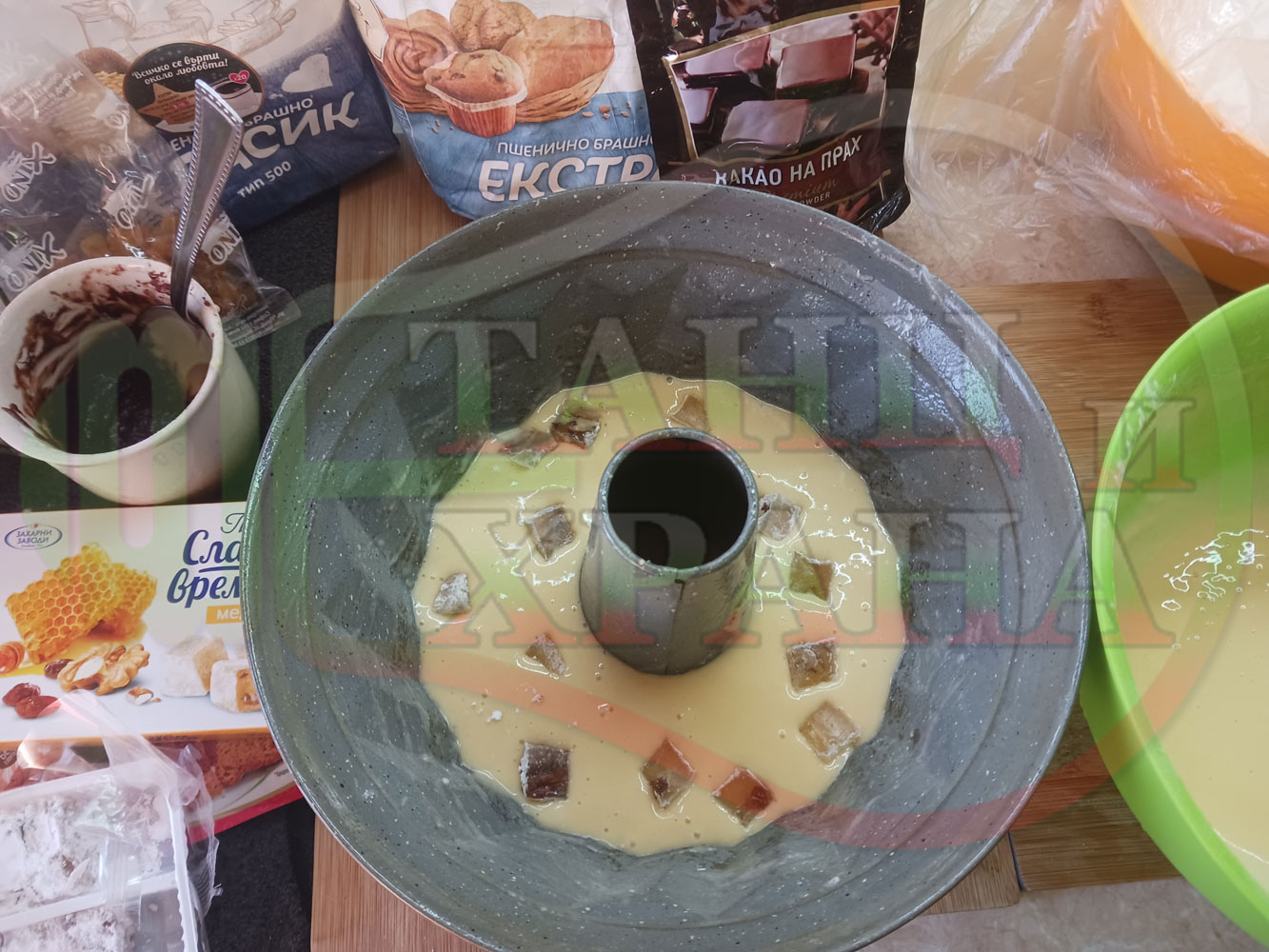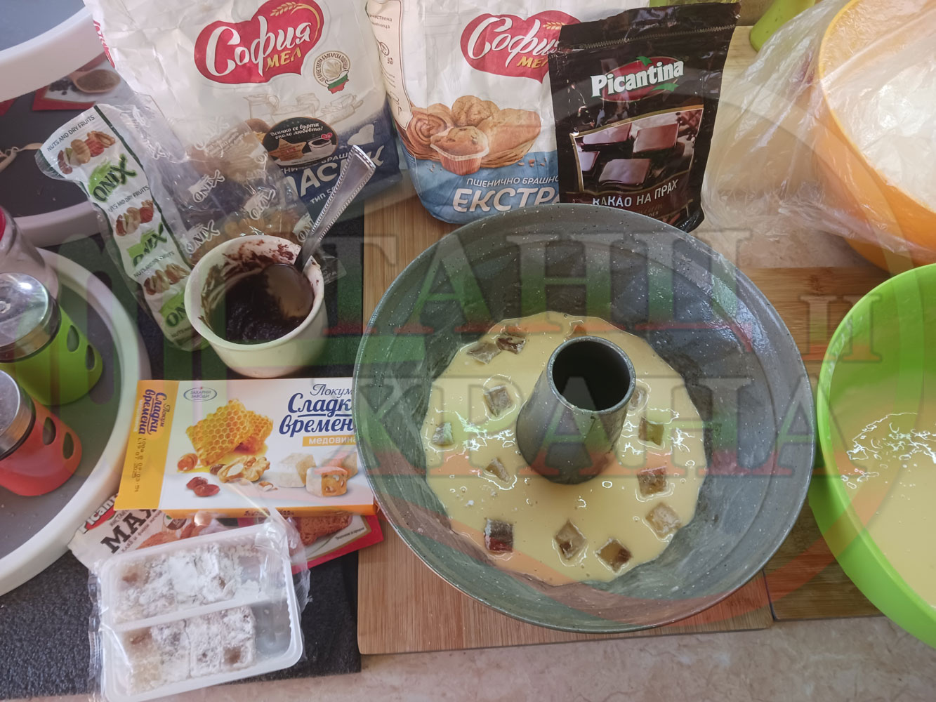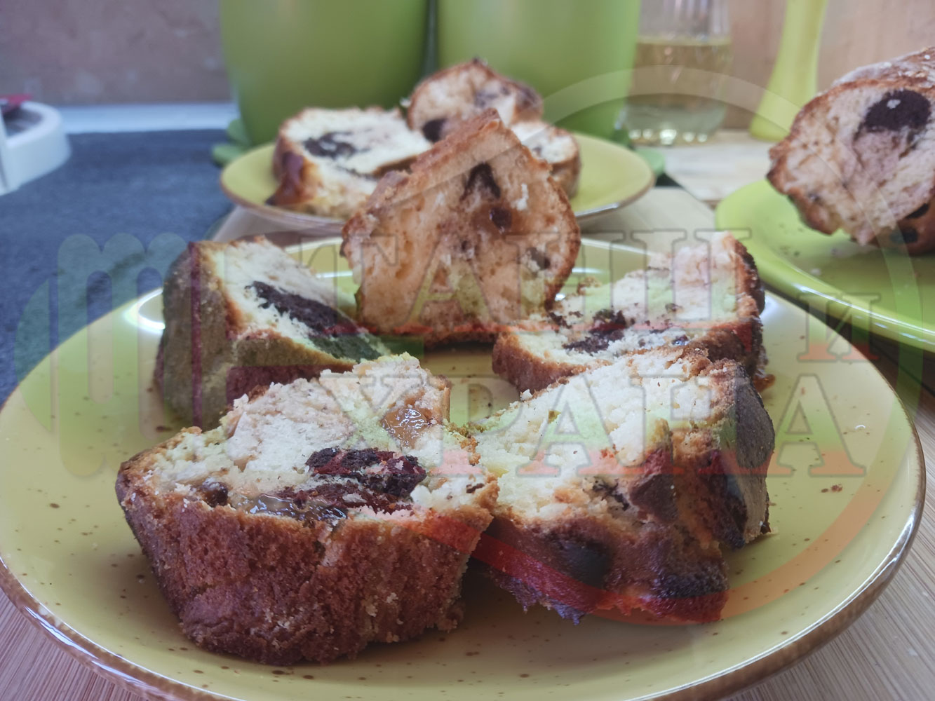 Кекс "Какаоволокумен златностафиден" приготвен с яйца, брашно, прясно мляко, кристална захар и какао с плънка от златни стафиди и локум с мед, орехи и канела
