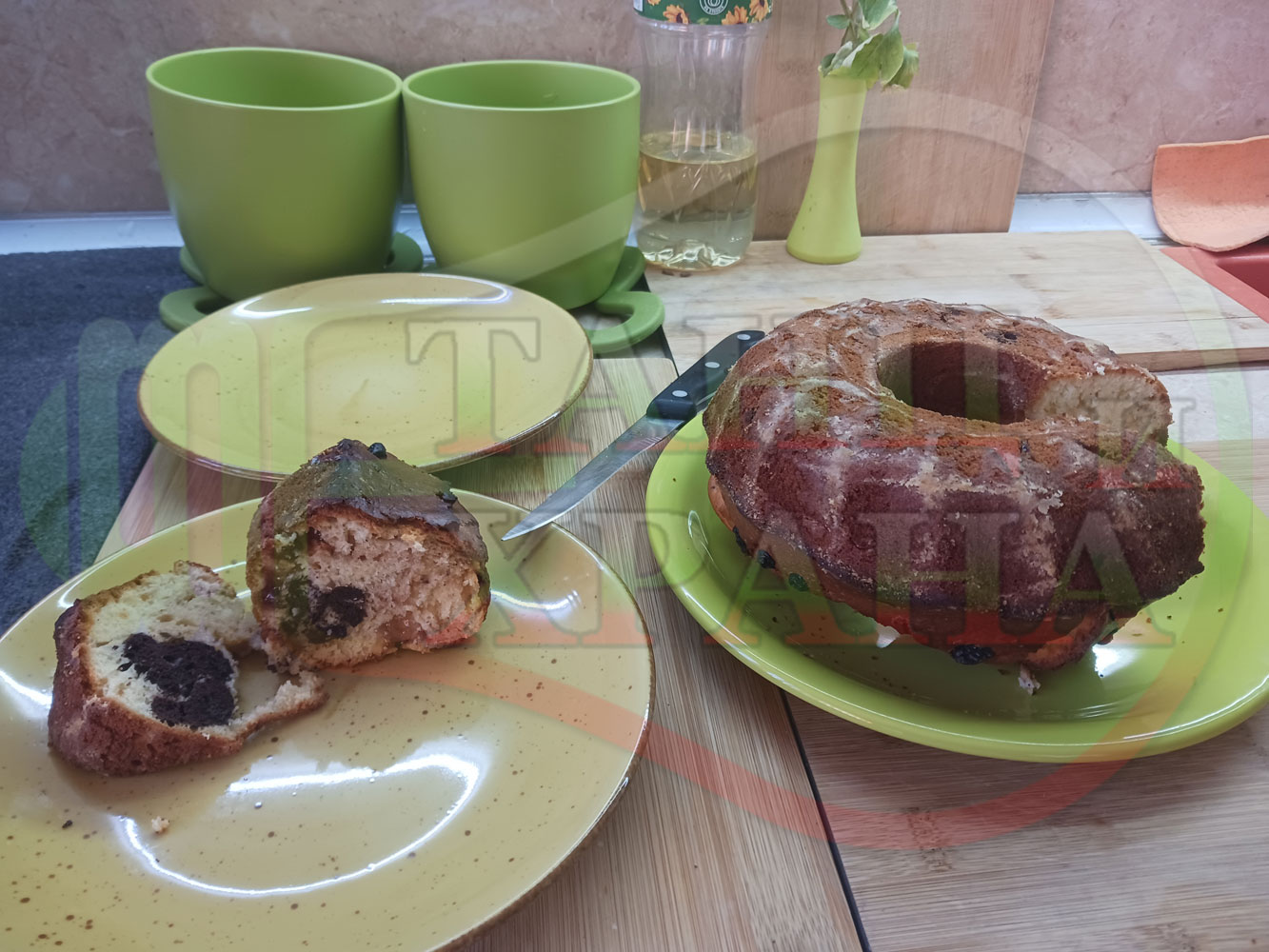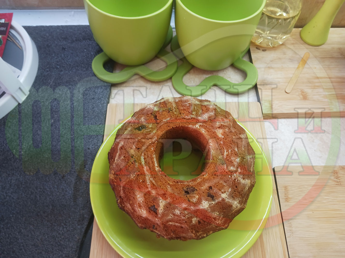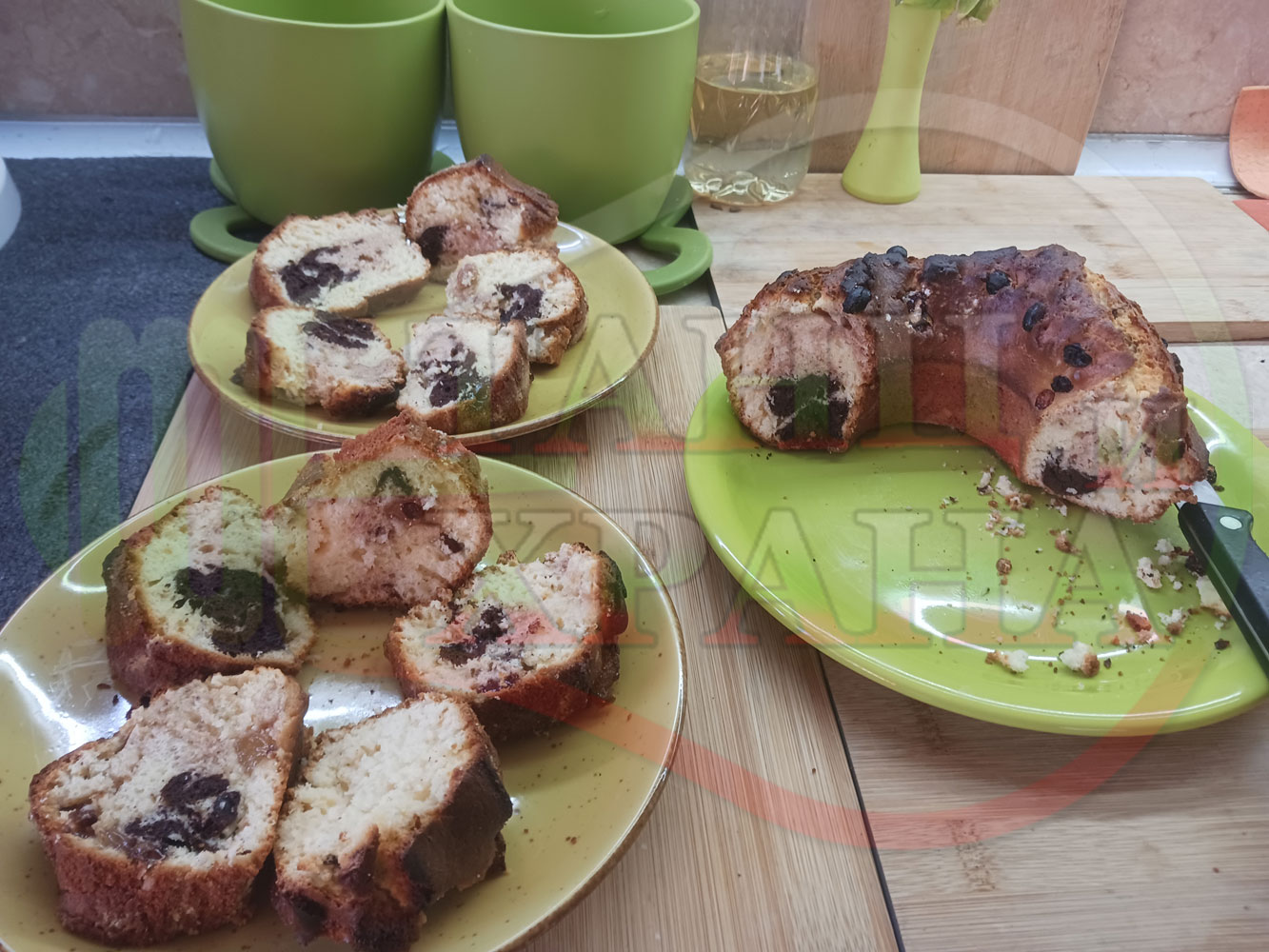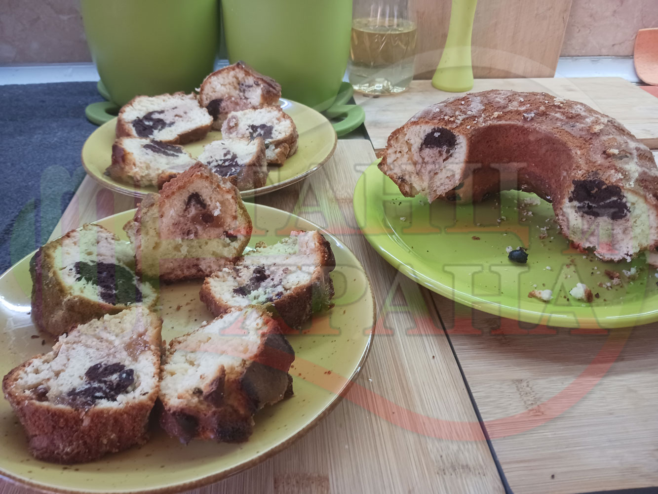 Кекс "Какаоволокумен златностафиден" приготвен с яйца, брашно, прясно мляко, кристална захар и какао с плънка от златни стафиди и локум с мед, орехи и канела