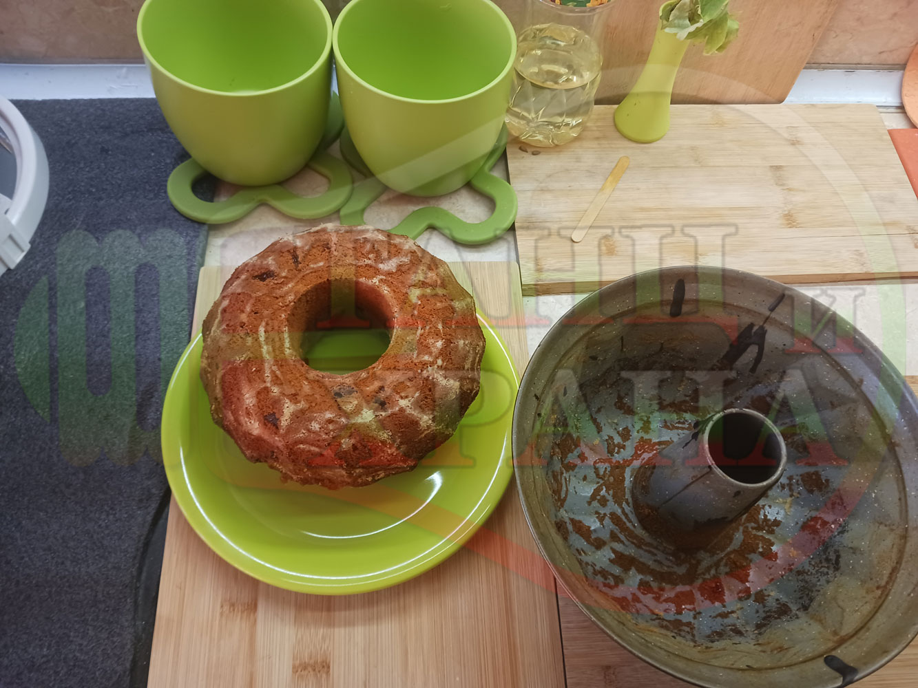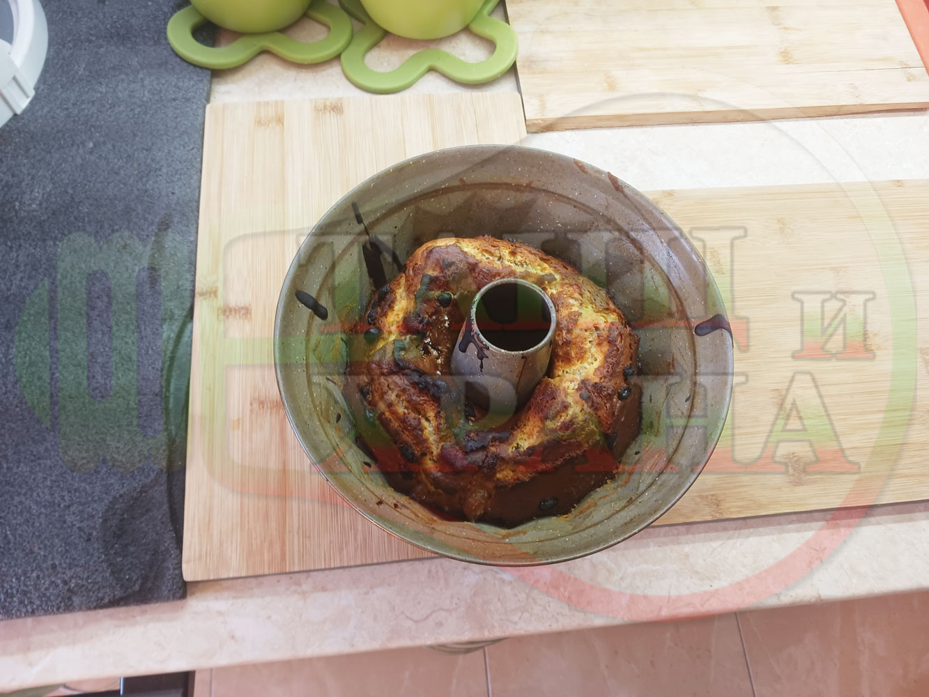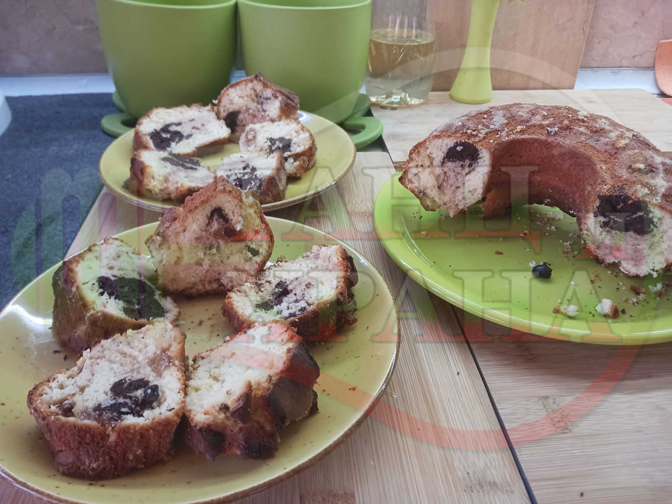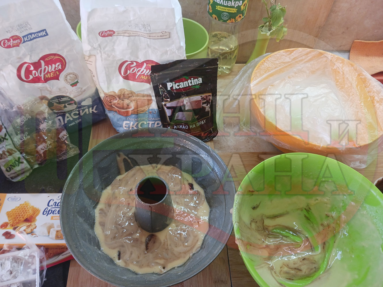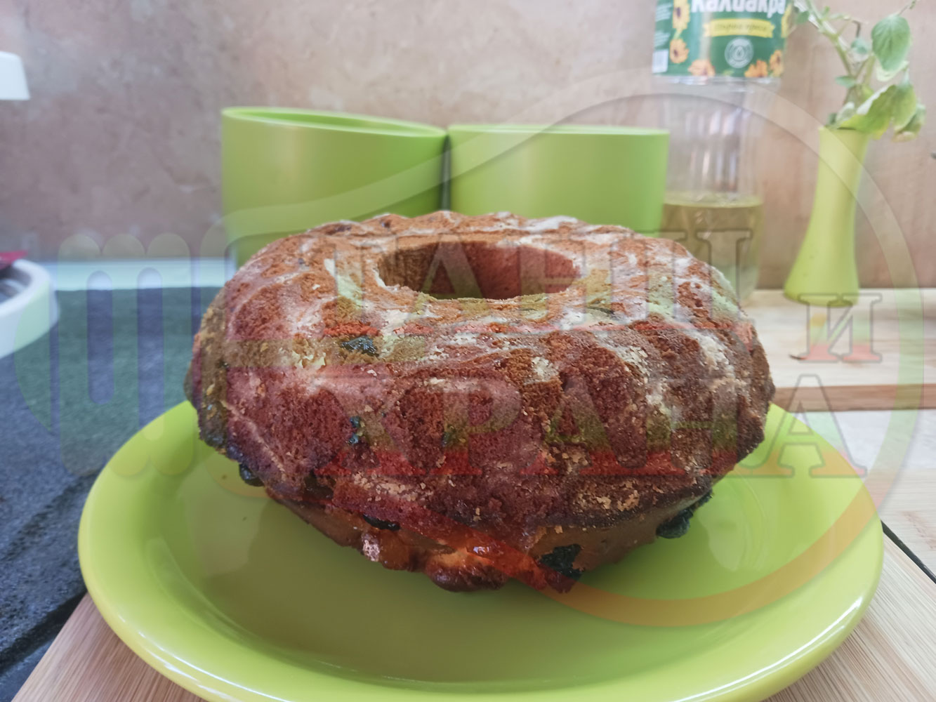 Кекс "Какаоволокумен златностафиден" приготвен с яйца, брашно, прясно мляко, кристална захар и какао с плънка от златни стафиди и локум с мед, орехи и канела